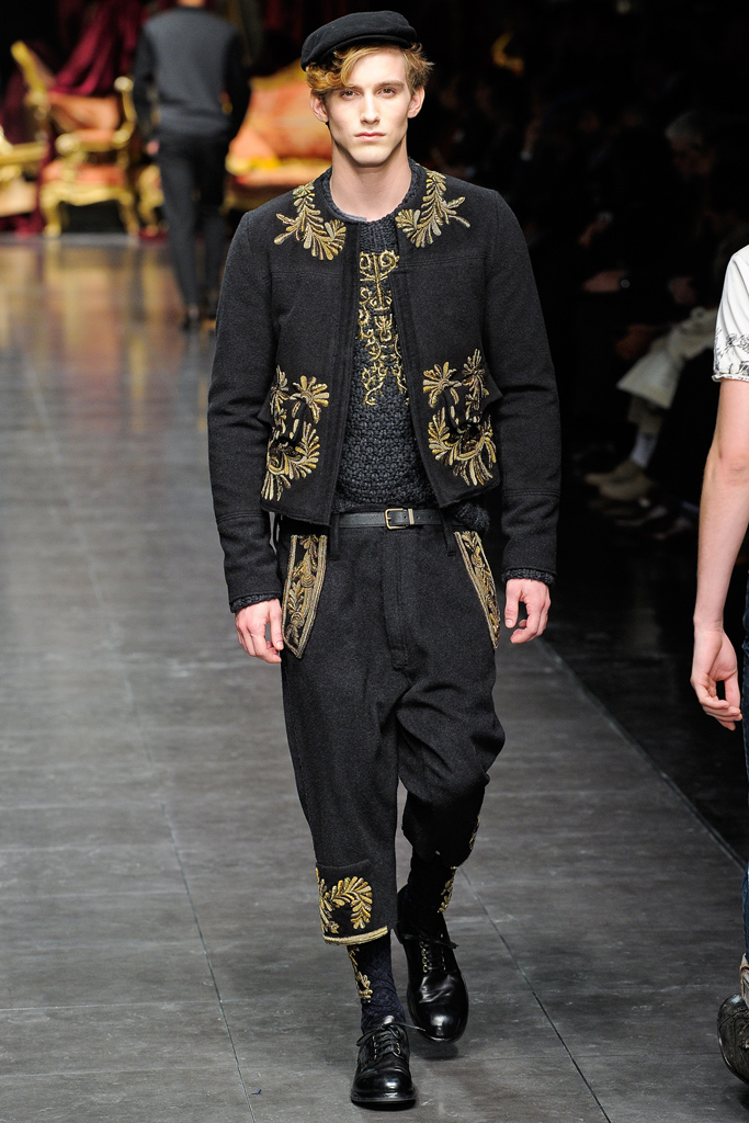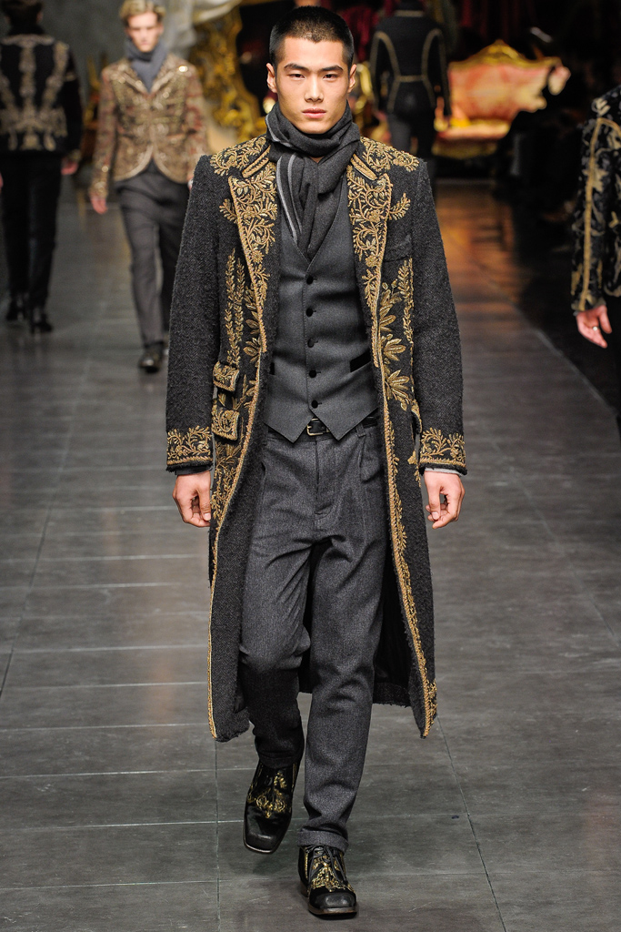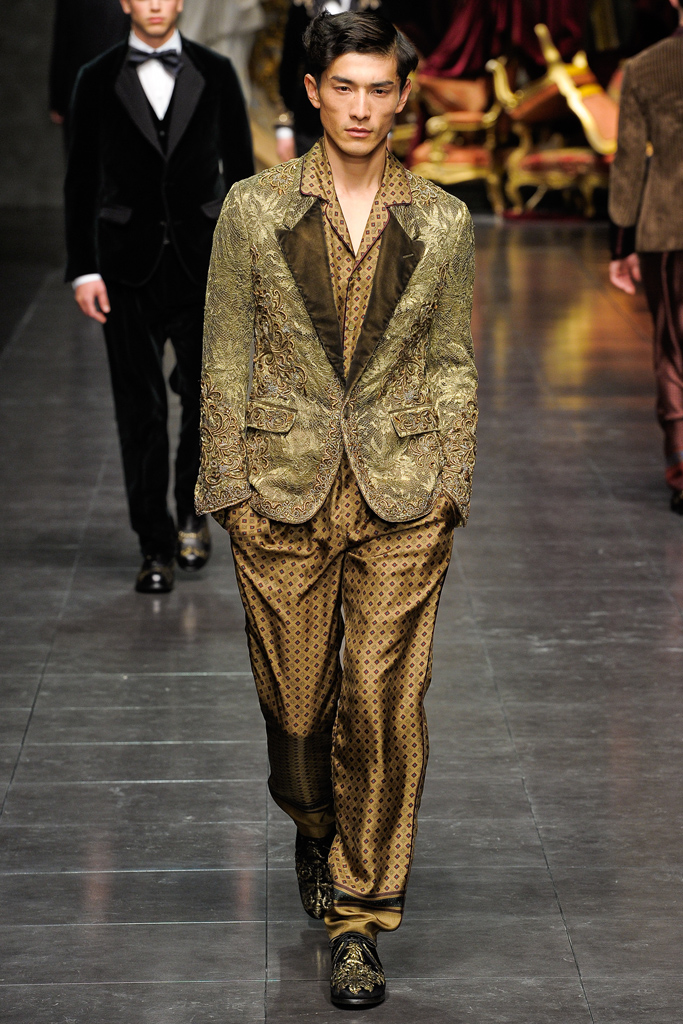 Regal Formation–Dolce & Gabbana follows a path lined with luxe fabrications and rich accents for the fall/winter 2012 season. A mix of country romance and early turn of the century dapper sentiments, the Italian house finds a place for their D&G youth amongst a mature collection of standout pieces. Dressing up suit jackets, lapels cut out of velvet mark the season, while the gradual incorporation of gold embroidery reinforces fall’s grand theme. Overlooking no facet in the life of their debonair man, the lineup transitions from sharp outerwear and companion pieces of warm wool to a more relaxed gesture that sees Dolce & Gabbana turn to their infamous silk. Whether worn as an exquisite set of pajamas or a bold move outdoors, the regal execution is the perfect touch to a collection that spares no expense.