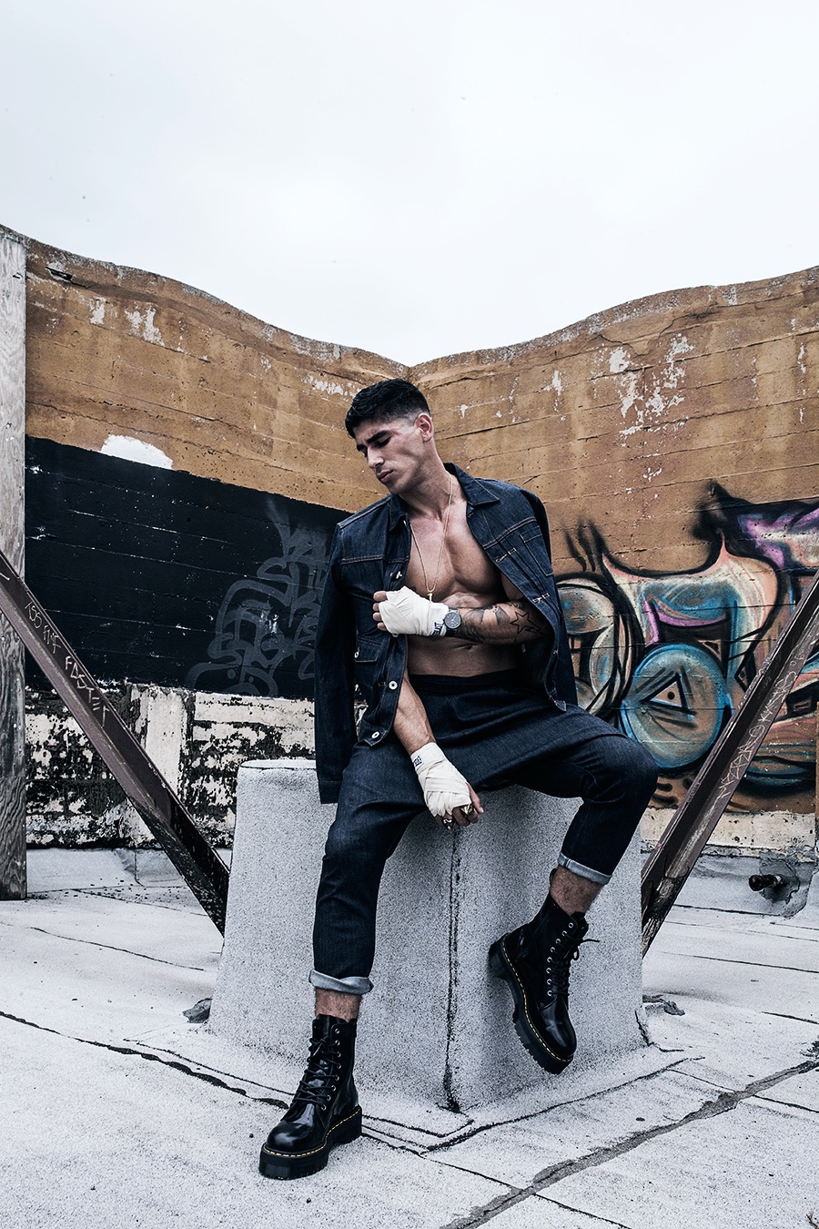 Models Evan Gomez and Stefano Churchill take up the sport of boxing for a new outing from photographer Sasha Samsonova. Sparring partners, the pair are styled by Chalia Breonn, wearing denim and athletic-inspired separates. / Hair by AtmaHari Kristin. Makeup by Arianna Montazem and Joanna Berdzinska.