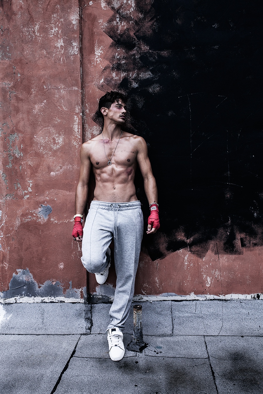 Stefano wears joggers Fanzel Amsterdam, shoes Android Homme, bracelet and rings Han Cholo, necklace and watch Flüd.Pin