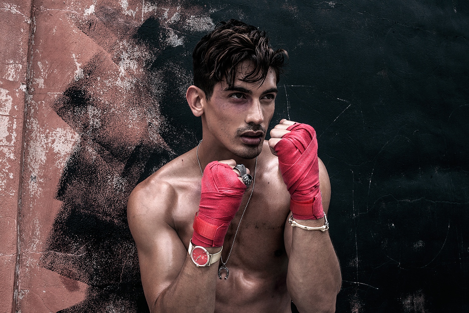 Stefano wears bracelet and rings Han Cholo, necklace and watch Flüd.Pin