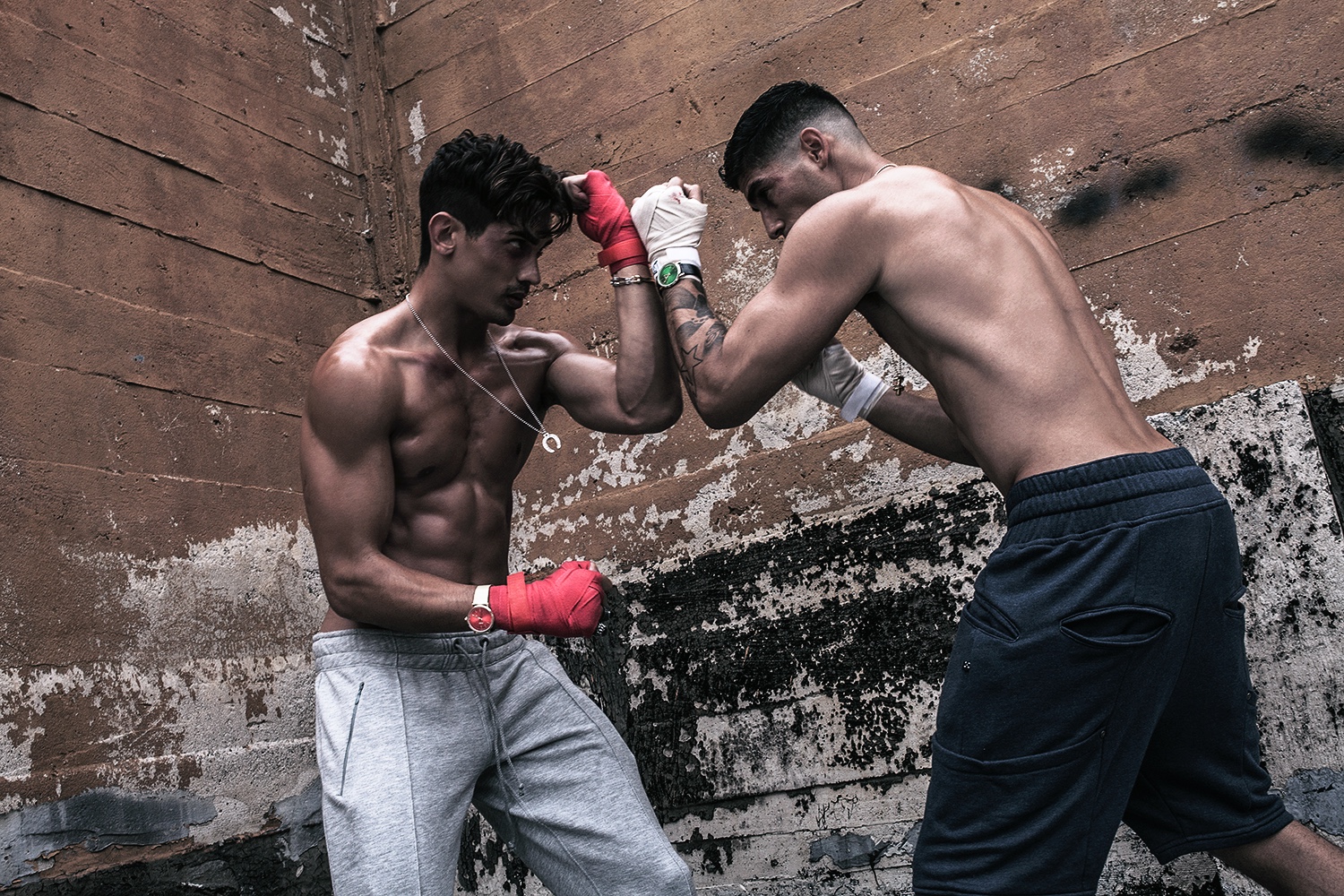 Left to Right: Stefano wears joggers Fanzel Amsterdam, necklace and watch Flüd, bracelet and rings Han Cholo. Evan wears shorts Thing Thing, rings Han Cholo, necklace and watch Flüd.