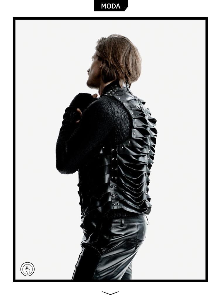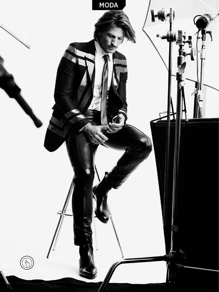 Let’s Go Black!-The July issue of GQ Brasil features a fashion story styled by Joseph Episcopo, starring Australian model Jarrod Scott. Connecting with photographer Matthew Scrivens, Jarrod is captured in an ideal backstage of a fashion shooting. Wearing a wardrobe of all black designs, Jarrod displays how to wear black leather for the next season. From the timeless rebellious attitude of a biker jacket, to the daring vibe of studded numbers, Jarrod’s passion for leather also includes slim trousers, paired with a sartorial suit jacket, decorated with graphic stripes, and polished ankle boots. / Grooming by Scott McMahan.