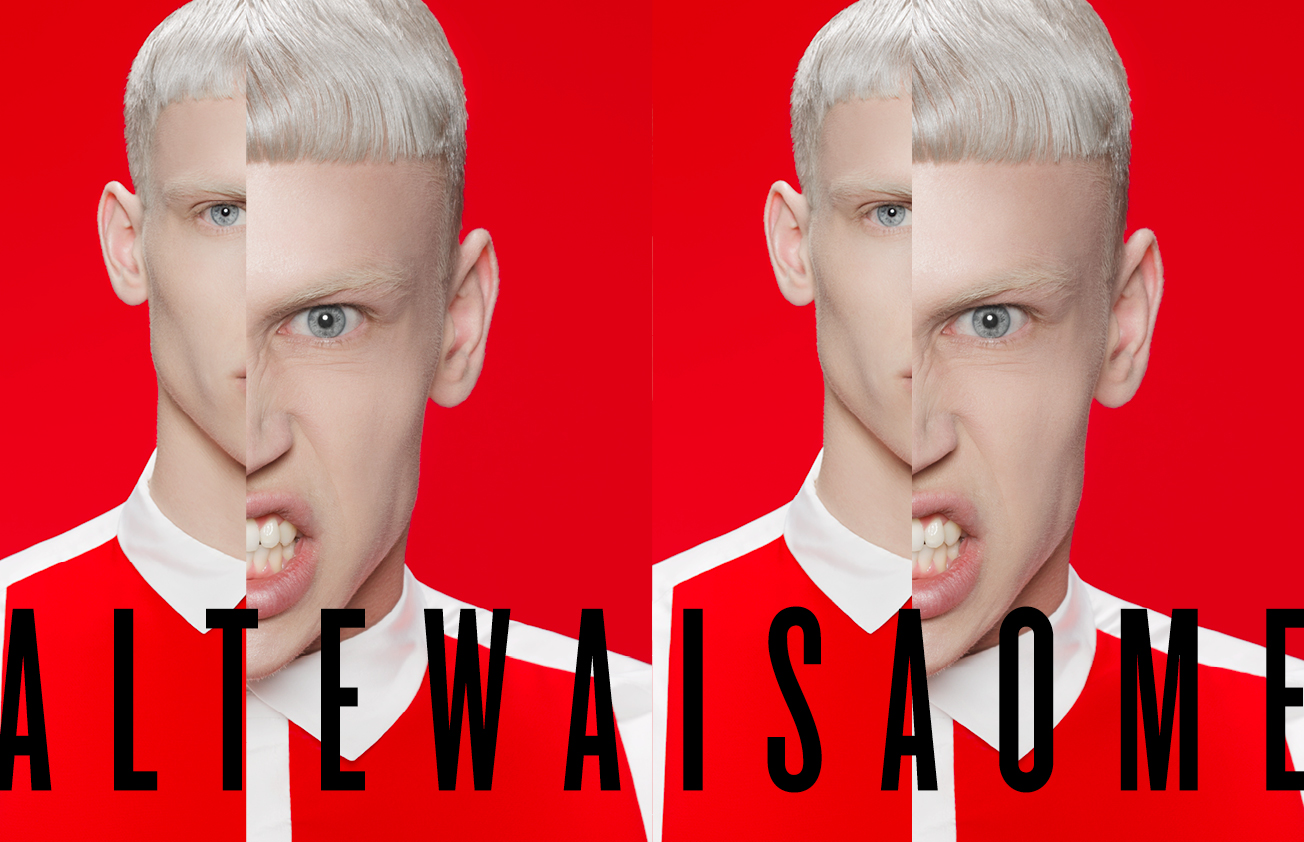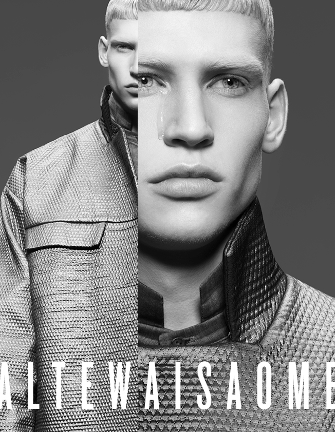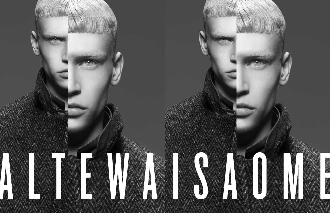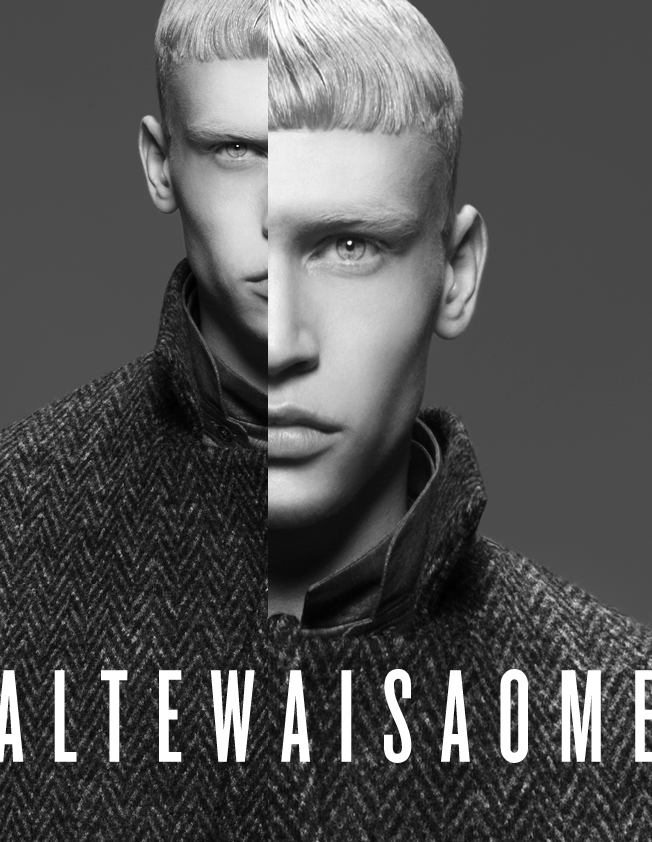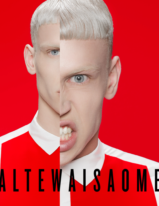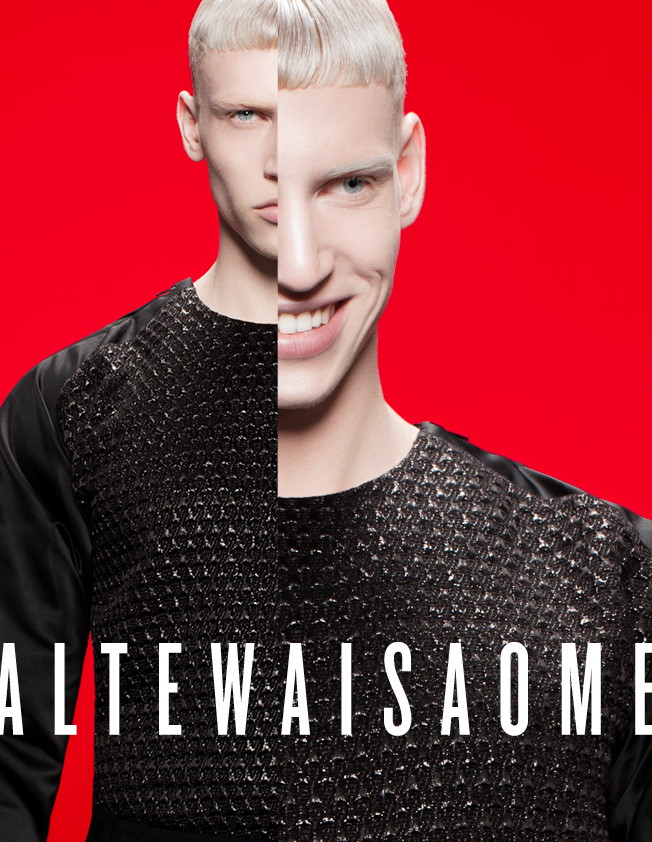 Split Screen–Model Lucas D (MIKAS) fronts the newest campaign for Swedish label ALTEWAISAOME’s fall/winter 2012 collection, guided by artistic director Jakob Hysén Hedberg. Channeling his array of personalities, Lucas is shot by photographer Alexander Dahl against a bright red and faded grey background, reflecting either a bold anger or a calm serenity. Natalia Altewai takes the styling reigns, donning an energetic Lucas in the label’s clothing, which feature tweed fabrics, micro-grid patterns, and vibrant color blocking. / Hair by Tony Lundström. Makeup by Anya de Tobon.