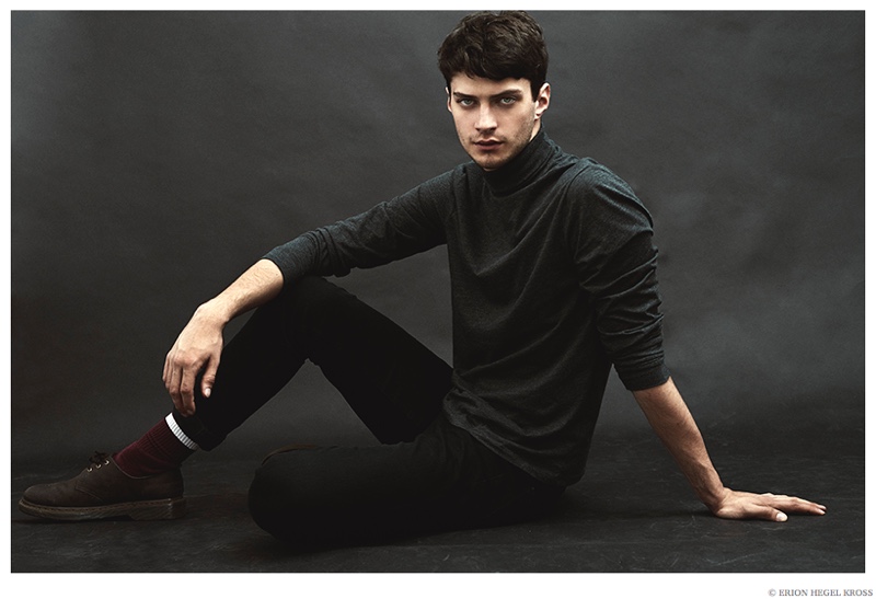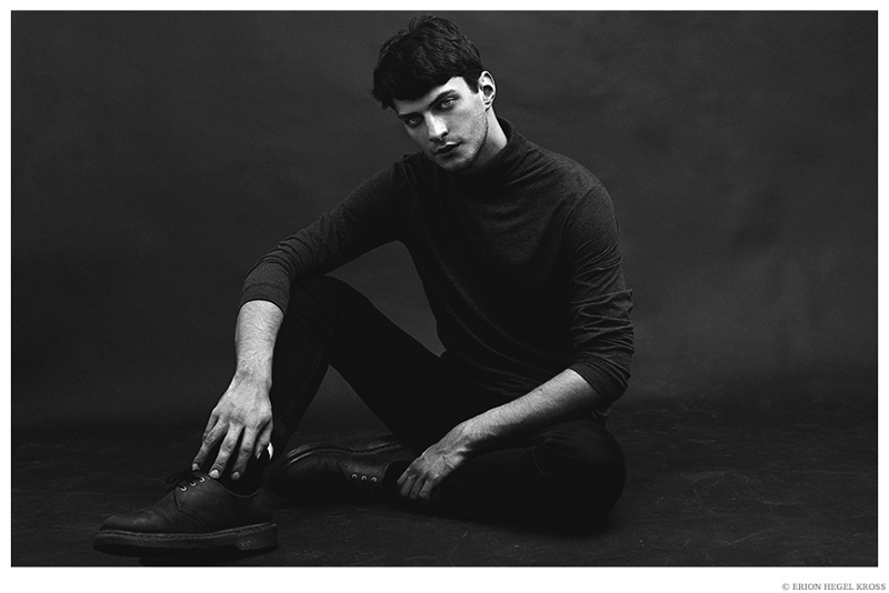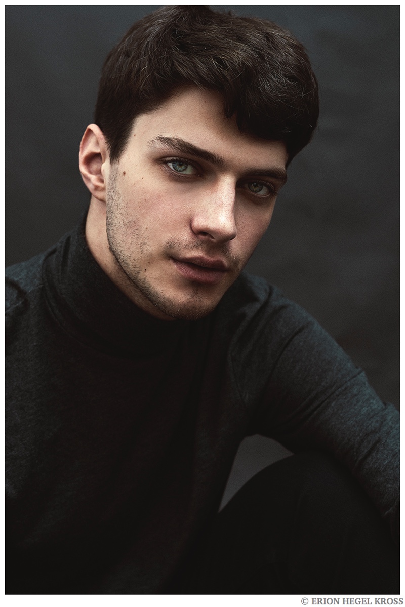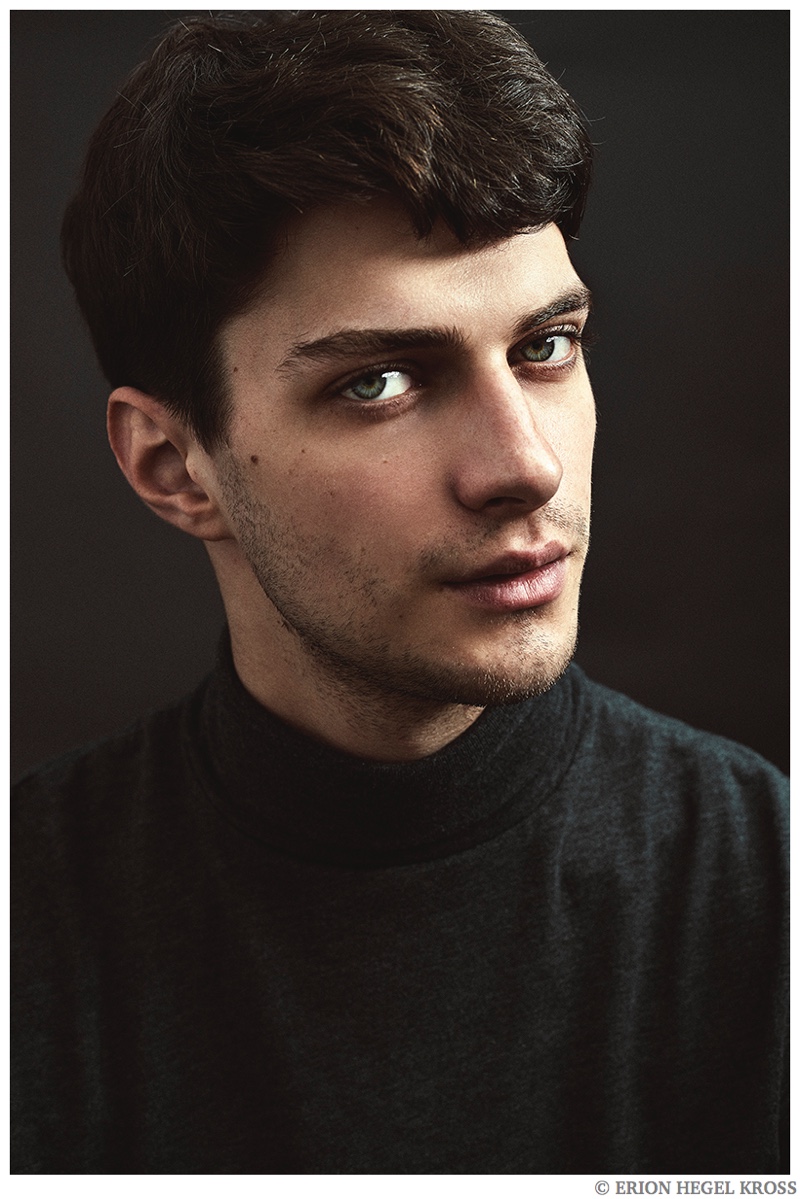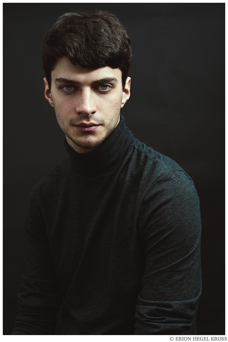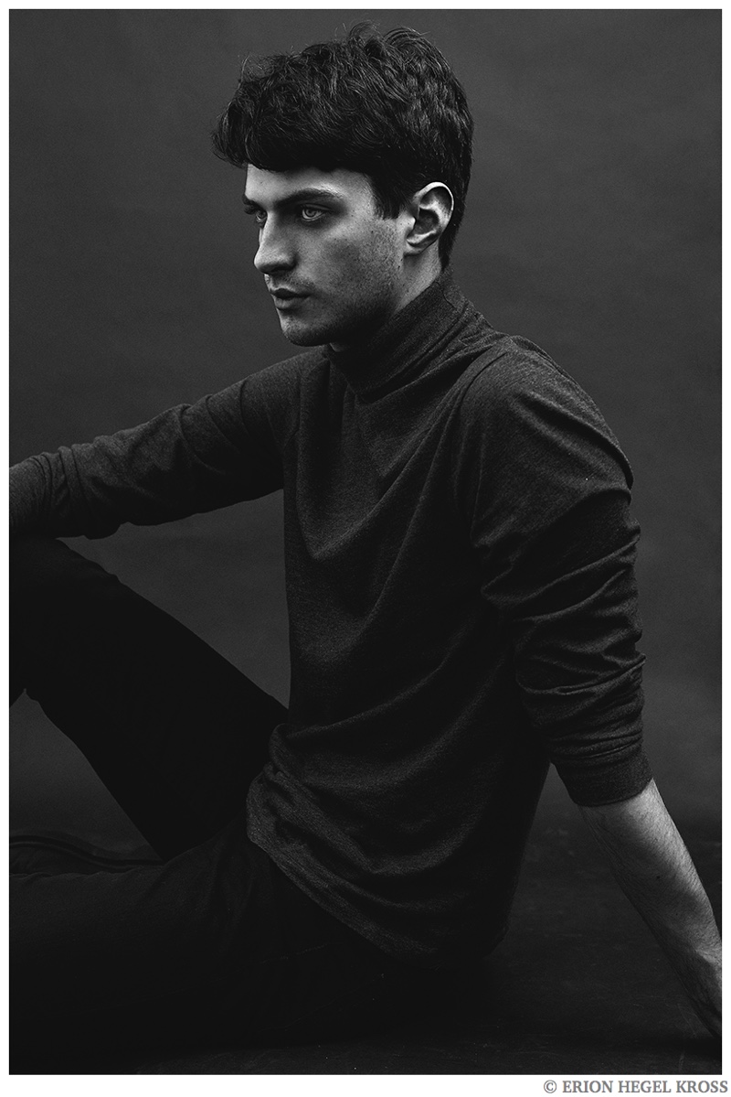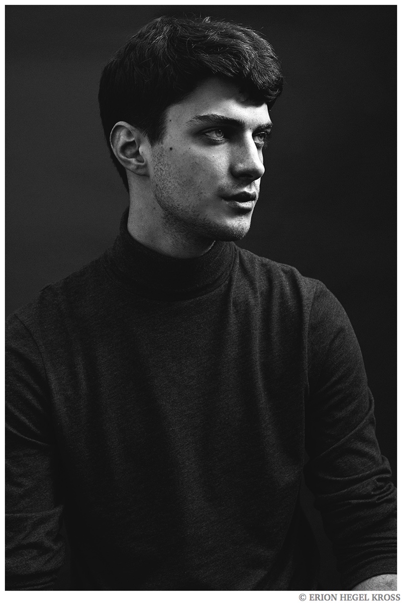 British model Matthew Bell is the latest face to sit for photographer Erion Hegel Kross. The Elite Barcelona model appears in the studio wearing a modest roll-neck top and lean trousers for quintessential portraits. Matthew recently appeared in a fashion editorial tackling equestrian fashions for GQ China.