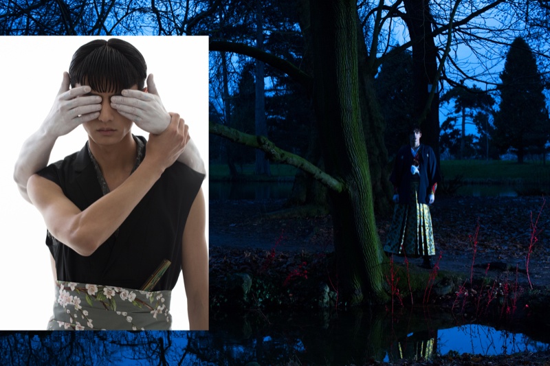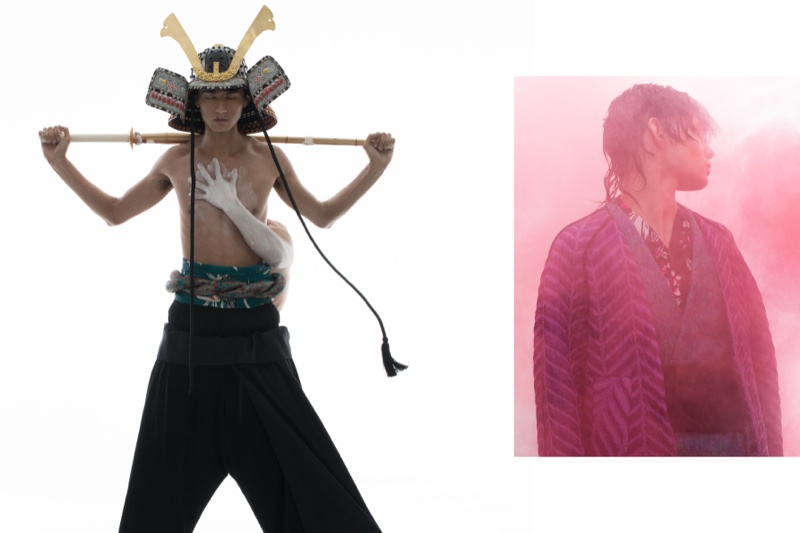 Permanent Exile–Returning with another story for the latest issue of Men’s Uno International, photographer Jumbo Tsui reunites with stylist Shuo Yuan Hasegawa for a fashion story inspired by the samurai. Enlisting models Liu Chang and George de Saint Mars as the stars of the editorial, Tsui captures a bold fantasy embellished with spring designs from Prada, Gucci and other luxury labels. / Makeup by Seven Wu and Megumi Zlatoff (Calliste Paris). Hair by Kentaro Kondo(EBI) and Julien Sapin.