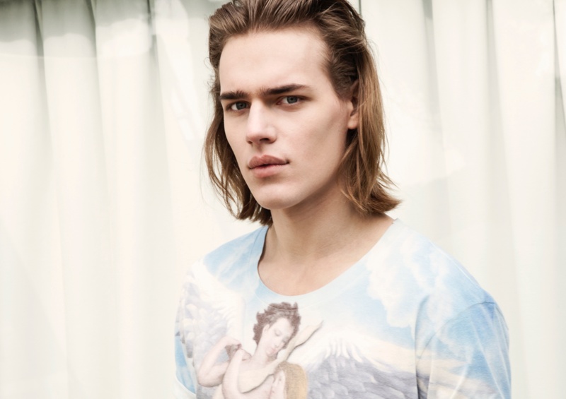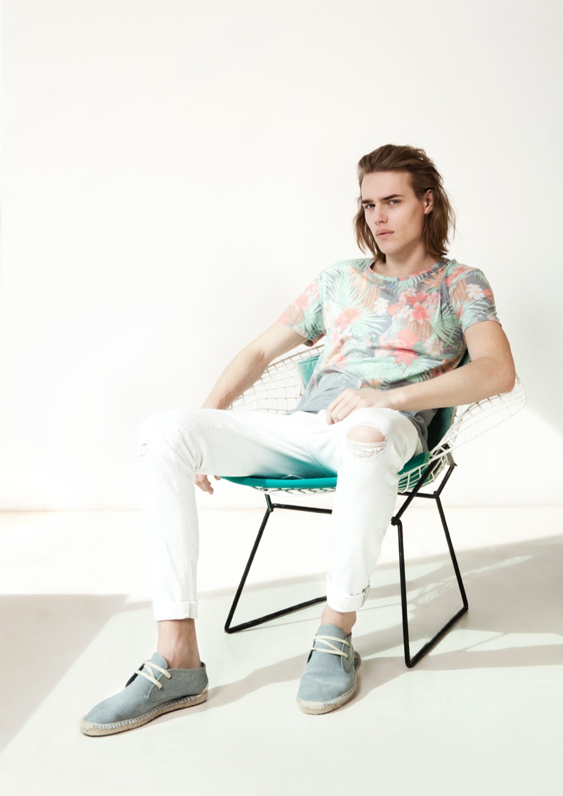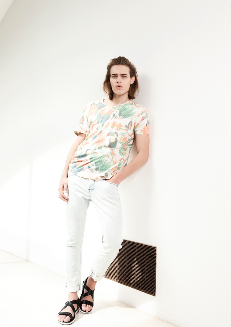 Bershka April Lookbook–Presenting its latest lookbook, Spanish label Bershka enlists the help of model Ton Heukels. Preparing for summer with a relaxed offering, Bershka rolls out a wardrobe, complete with intricate prints. Imagining a laid-back getaway, tropical prints are reinterpreted with dusty hues inspired by a mix of classic paintings and pop art. Here, floral prints and graphics of serene elements like clouds dress tops that are paired with pants, shorts and sandals.