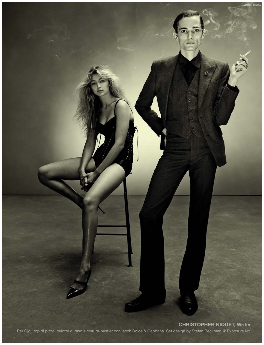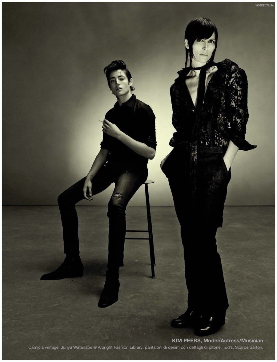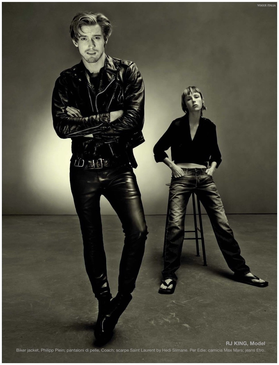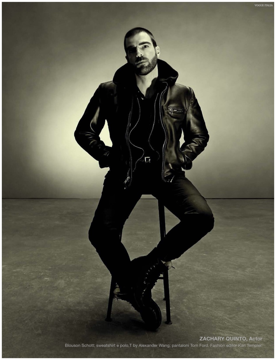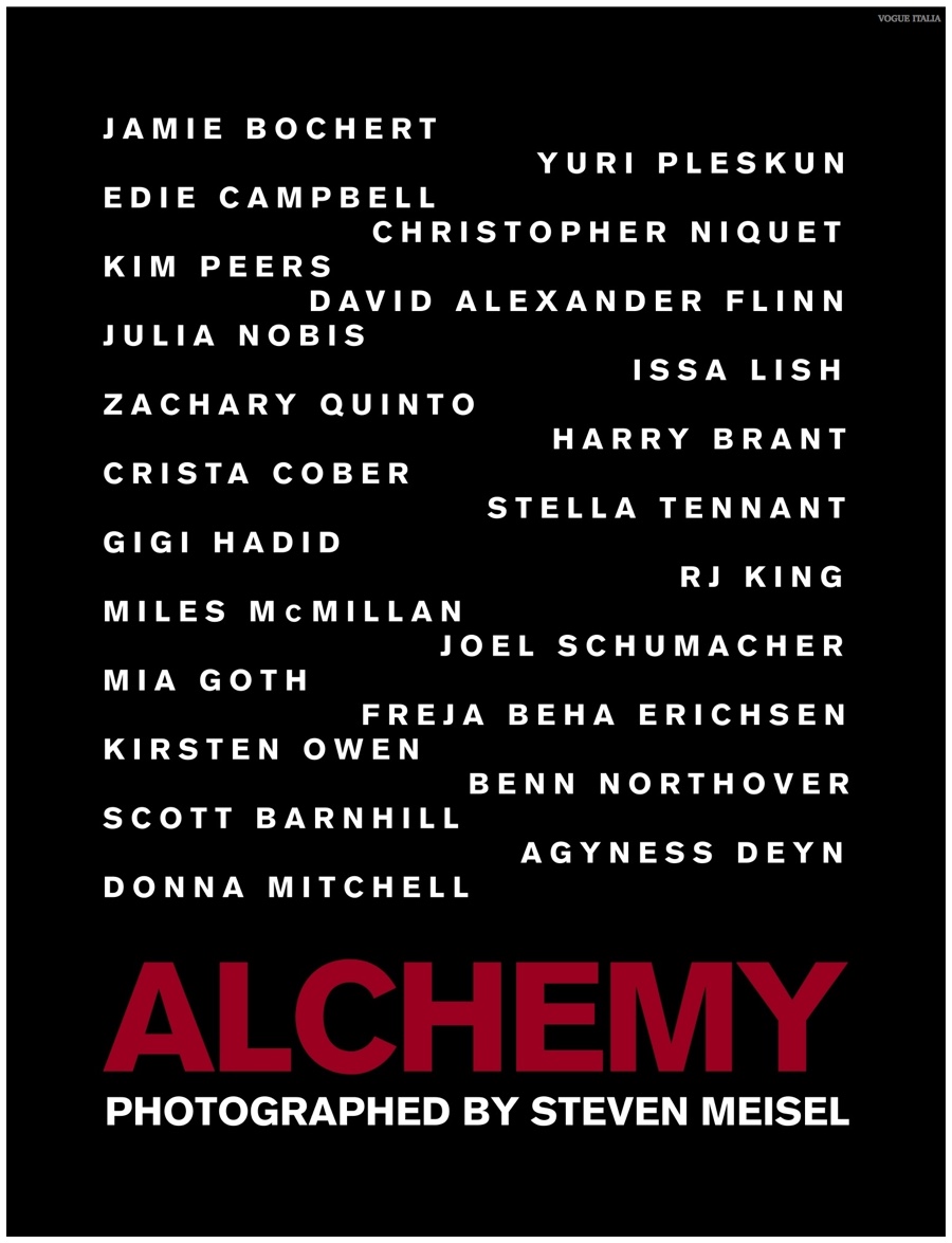 Alchemy–Partnering with stylist Karl Templer, fashion photographer Steven Meisel captures a dark portrait study for the pages of Vogue Italia’s March 2015 issue. Real-life couple Zachary Quinto and Miles McMillan are featured in the story in addition to Meisel muses that include RJ King, Yuri Pleskun and David Flinn. Sporting black spring fashions from Saint Laurent, Dries Van Noten and other labels, Christopher Niquet, Harry Brant, Joel Schumacher and Benn Northover pose for quite the photos.
