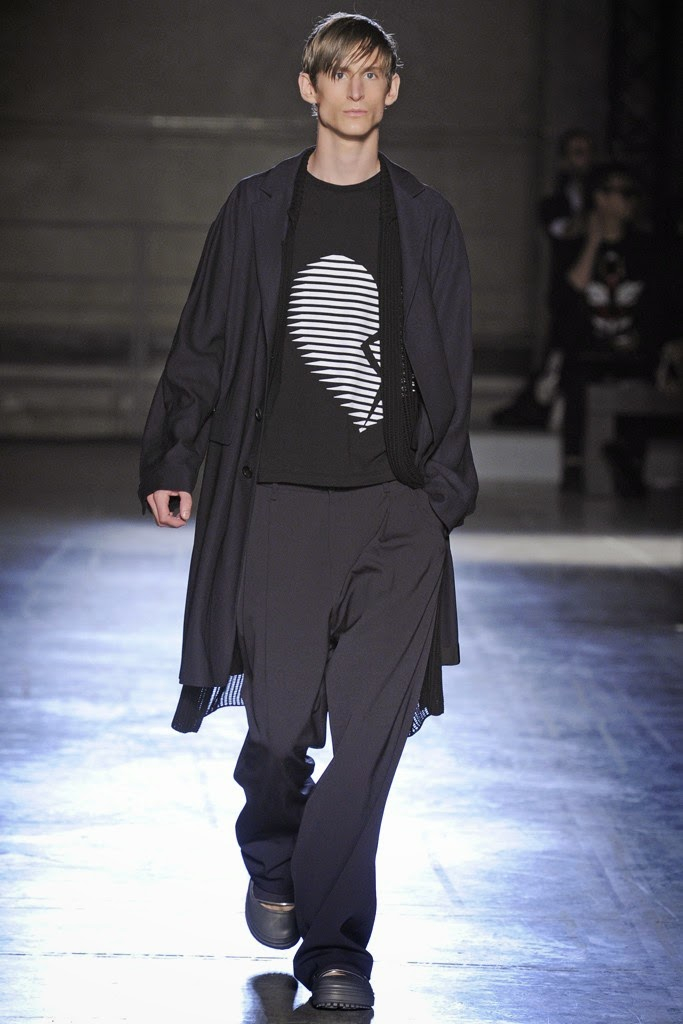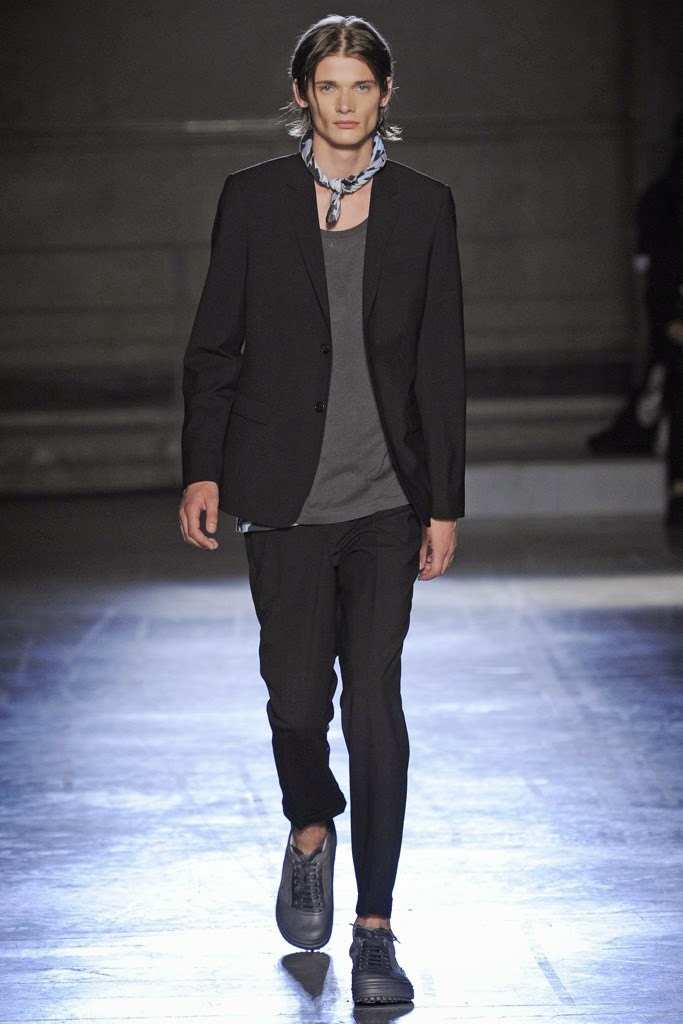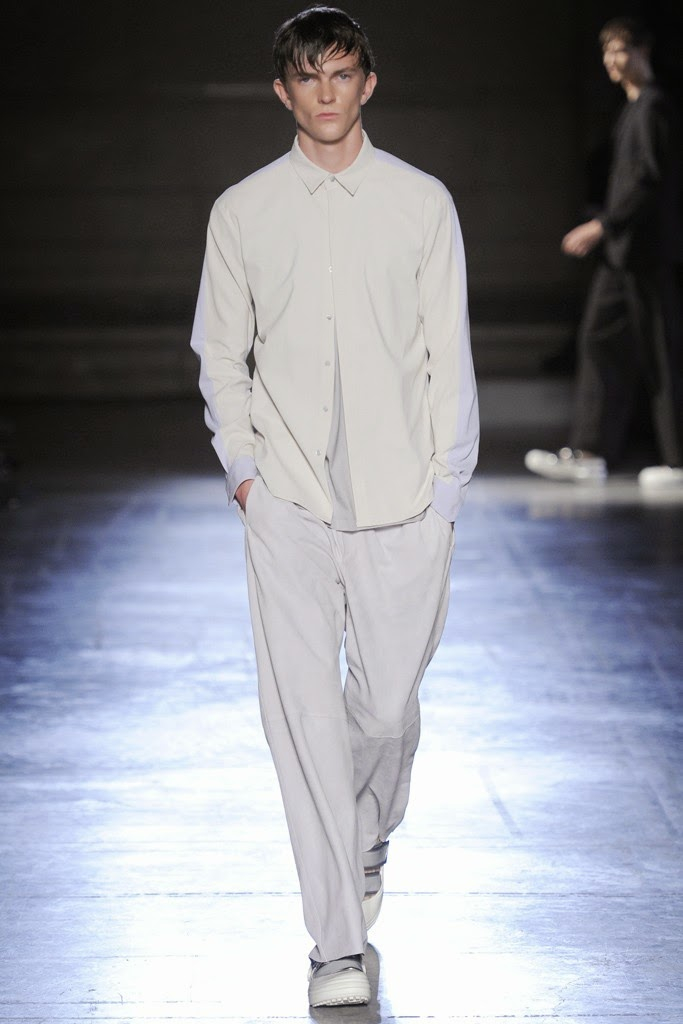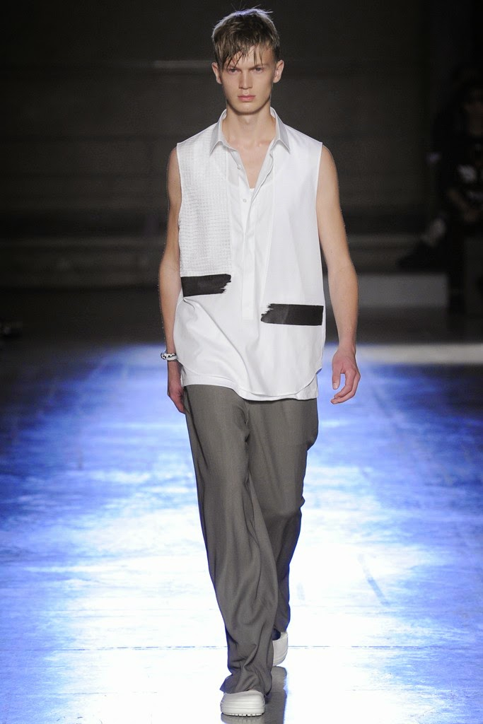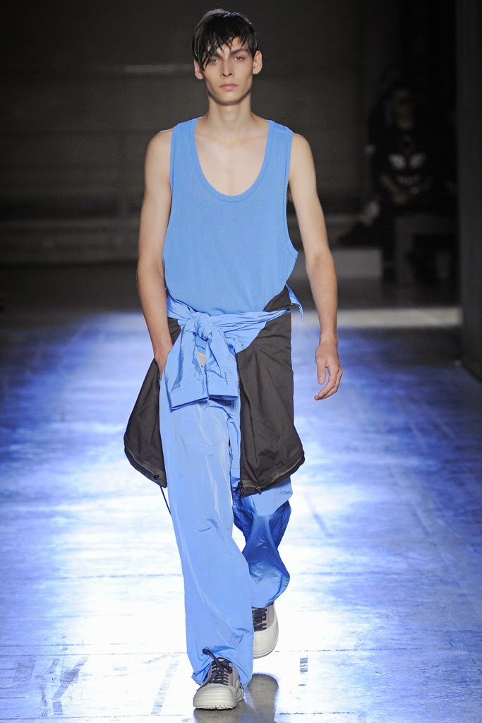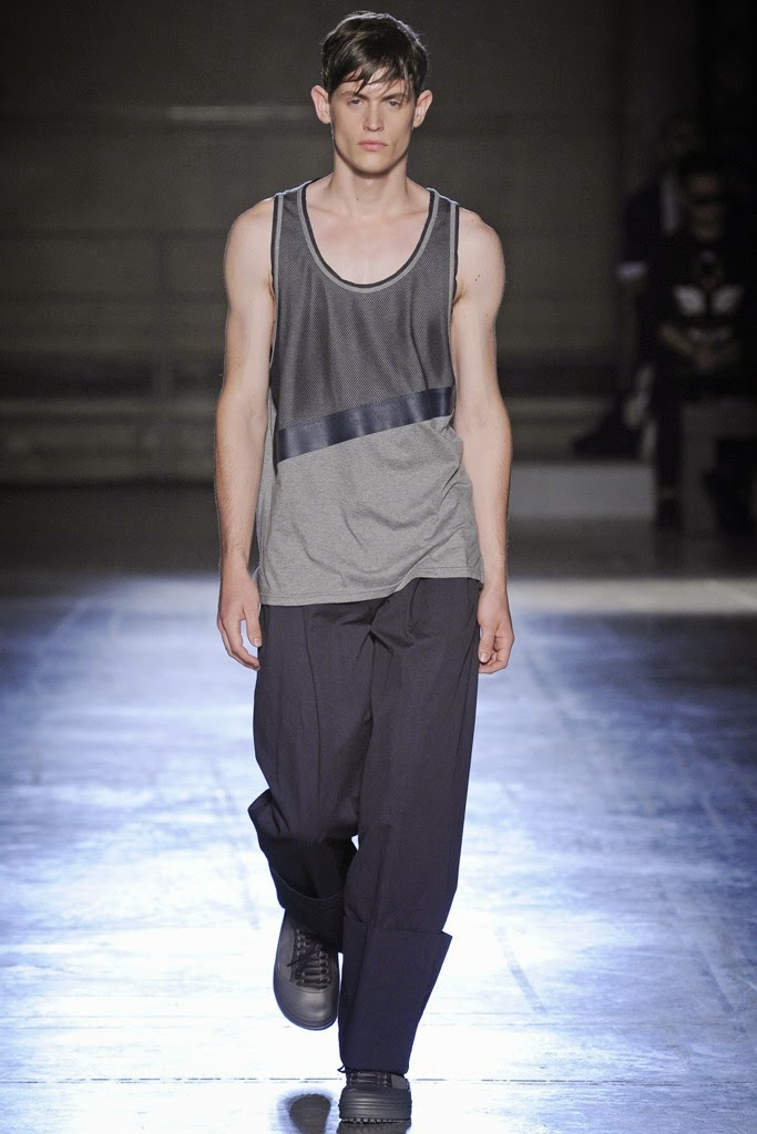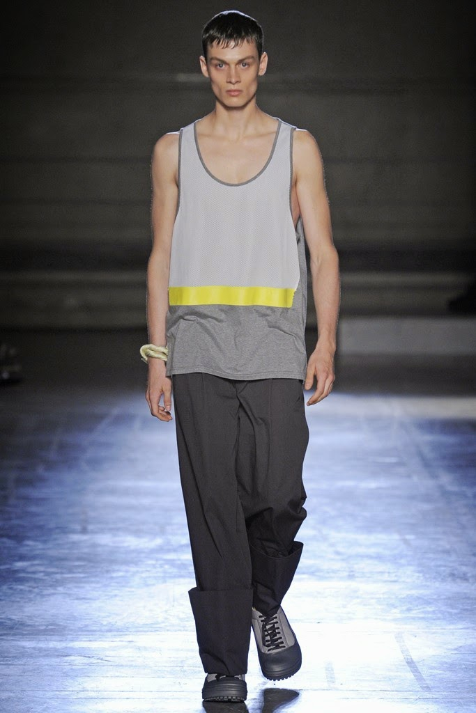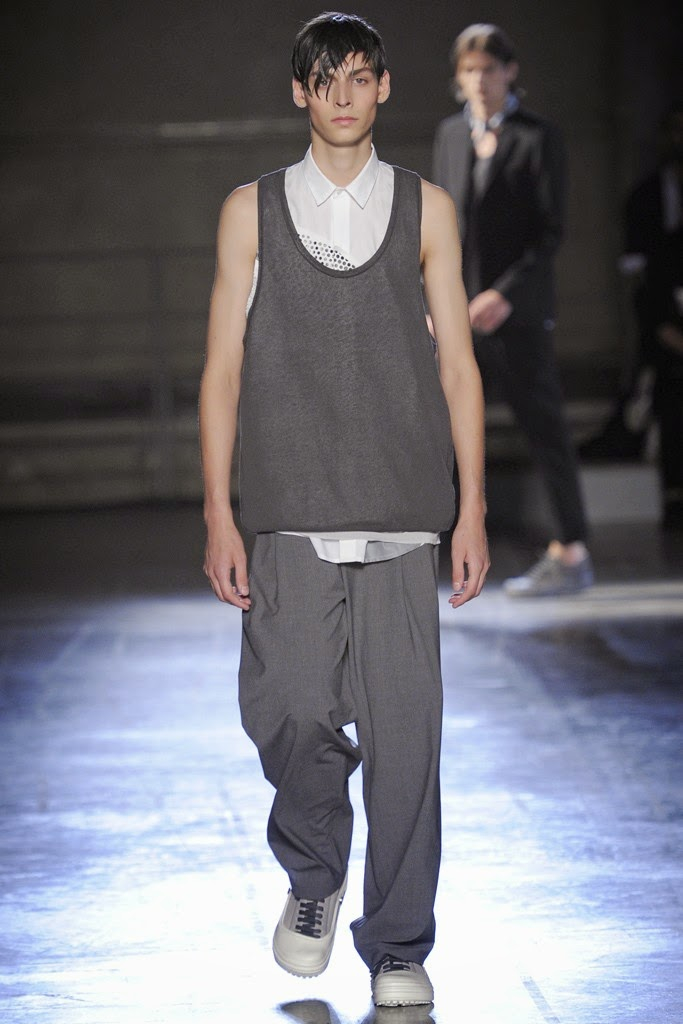 Wooyoungmi Spring/Summer 2015-Collaborating with her daughter Katie Chung for the first time, designer Woo Youngmi’s structured vision was updated with a certain softness. Boyish as usual, the collection was the epitome of relaxed with long reworked polo shirts worn over rolled up shorts and accessorized with chic bucket hats. Meanwhile, dress shirts became lightweight jackets and wide-cut trousers were baggy. Offering a certain simplicity, essentials such as a white shirt were cut large but finished with a narrow collar and left vulnerable, revealing a tank underneath. Add to the mix mesh tops, sleeveless shirts, cut sporty and revealing, as well as color blocked tanks-resulting in a concise vision that dealt sharp menswear constructions and a laid-back demeanor.