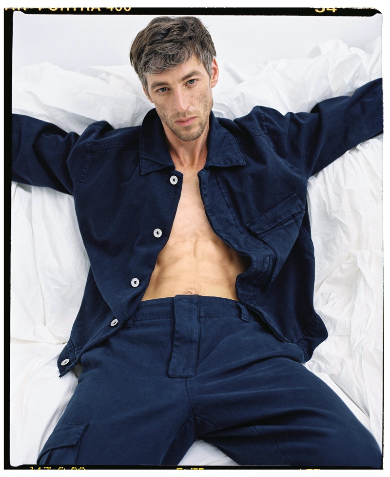 Making a case for coordinated pieces, Joel Frampton dons a cargo overshirt and trousers from Adolfo Dominguez’s spring-summer 2021 men’s collection.