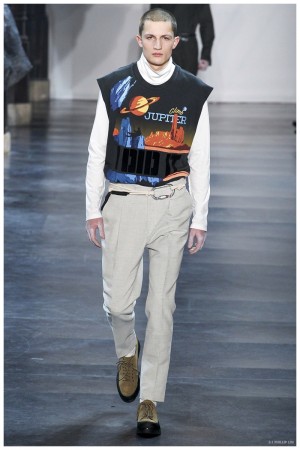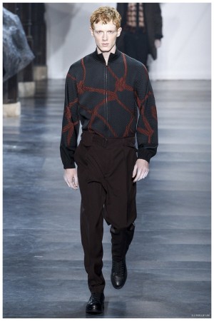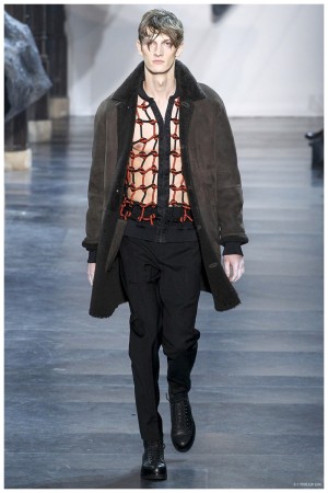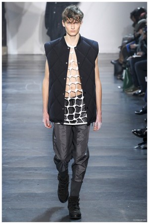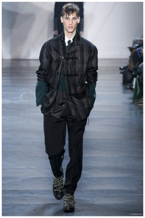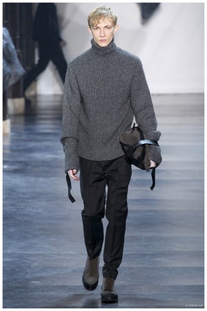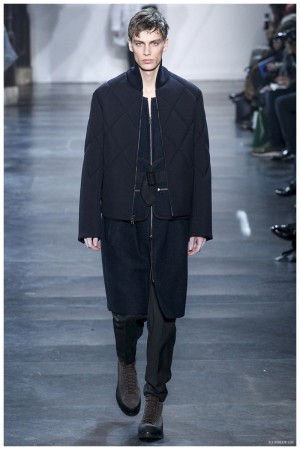 Alpine style was front and center for 3.1 Phillip Lim’s latest menswear collection. Designer Phillip Lim blended his signature urban edge with functional styles for a youthful undertaking. Tethered in modern outerwear looks, a mix of blue and earthy hued jackets were paired with relaxed trousers. Embracing a somber attitude, long, minimal coats and jumpsuits gave the collection a simple extension of the season’s motif, while nylon pieces contributed to an athletic angle. Rounding out the collection with roped separates and embellished boots, Lim brought his mountaineering extravaganza full circle with a strong finish.