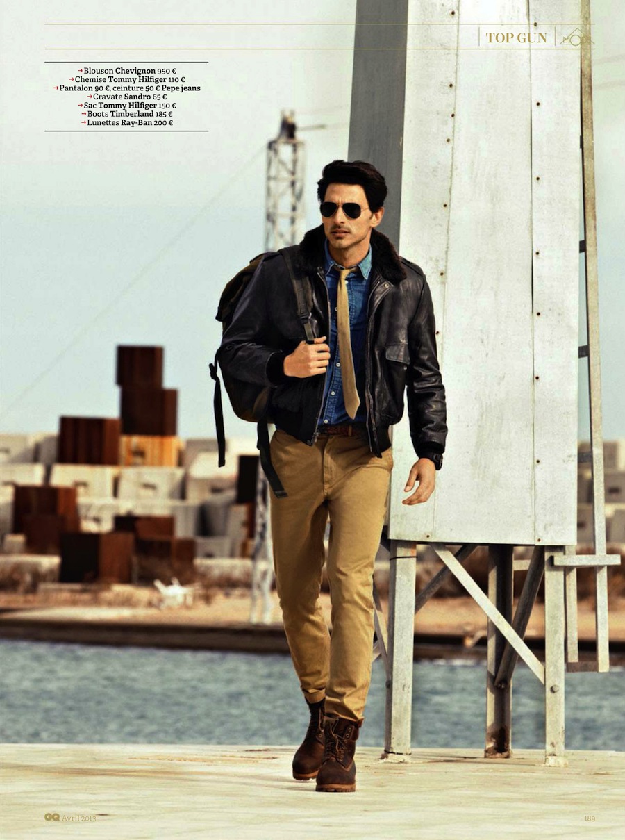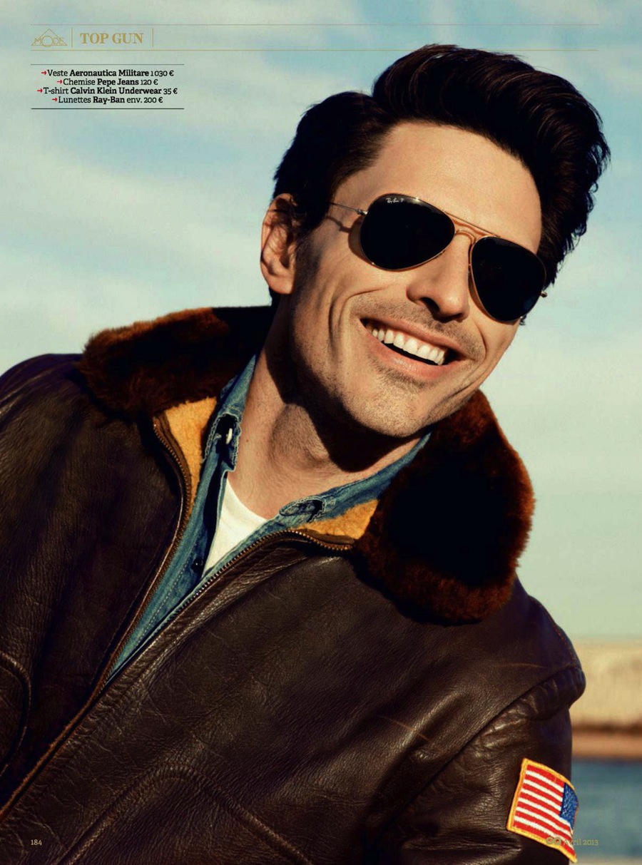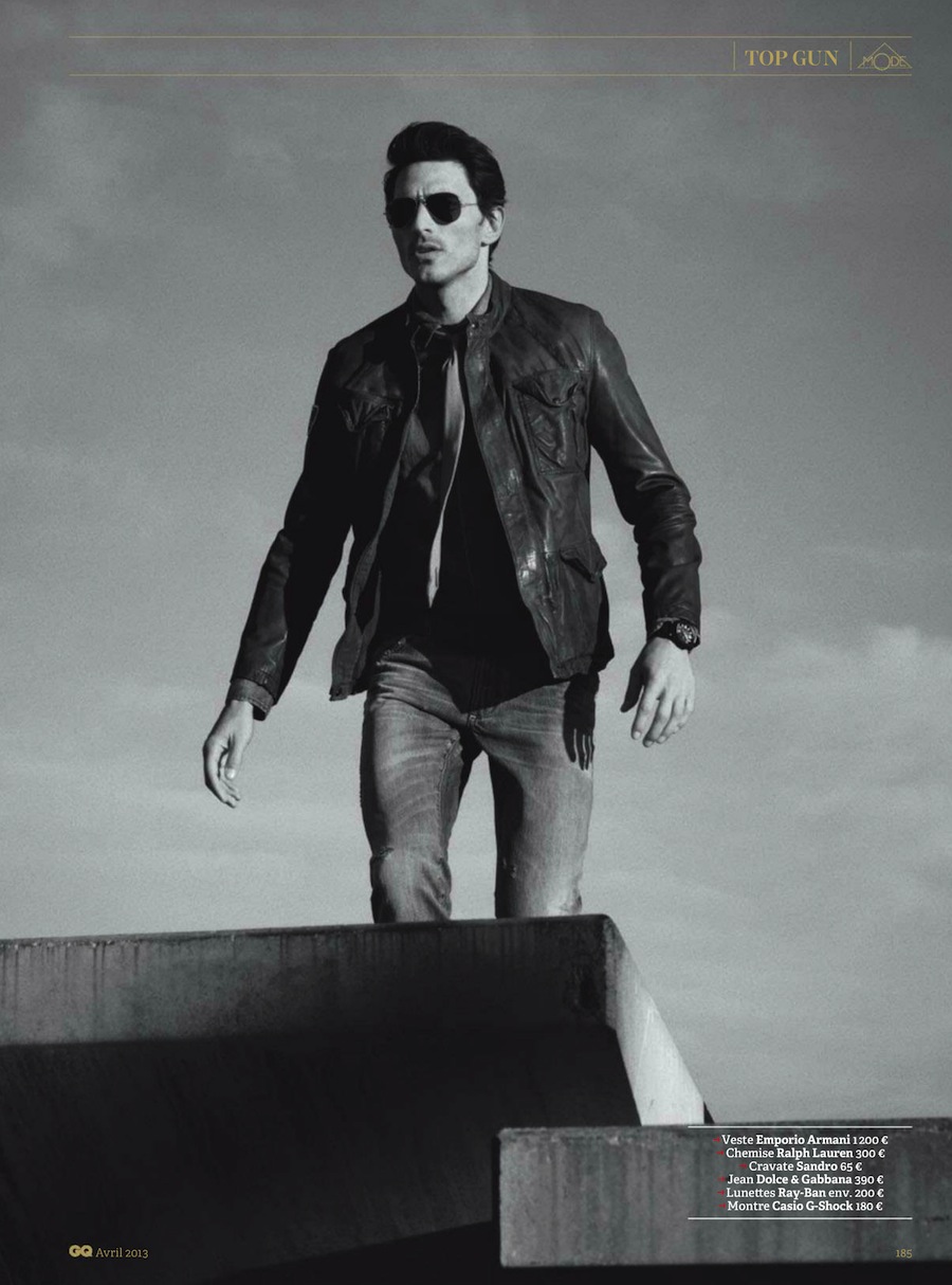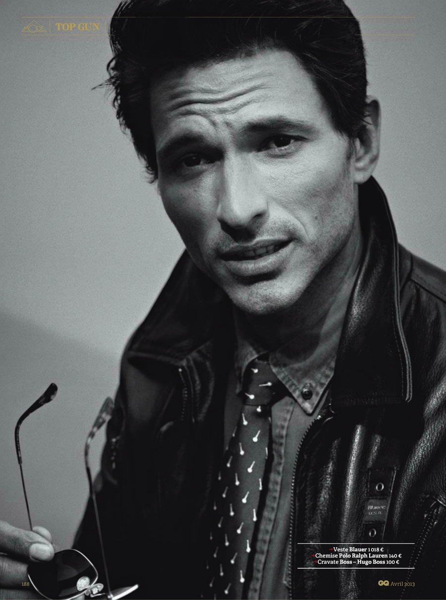 Top Gun–Channeling Tom Cruise’s character from the 1986 movie “Top Gun”, Spanish model Andrés Velencoso Segura graces the pages of GQ France’s April 2013 issue, appearing before the lens of Sergi Pons. For the cinematic story, the Sight model is outfitted by fashion editor Miguel Arnau, who assembles a wardrobe made of leather jackets, denim pieces, chinos and aviator sunglasses, where the designs of Emporio Armani, Dolce & Gabbana and others define a bold aesthetic.