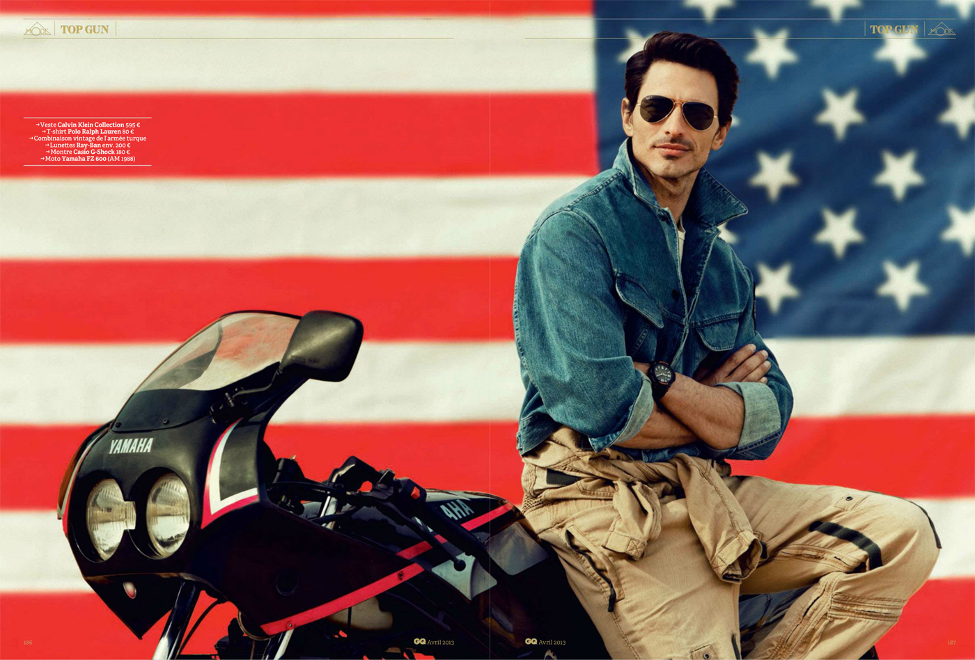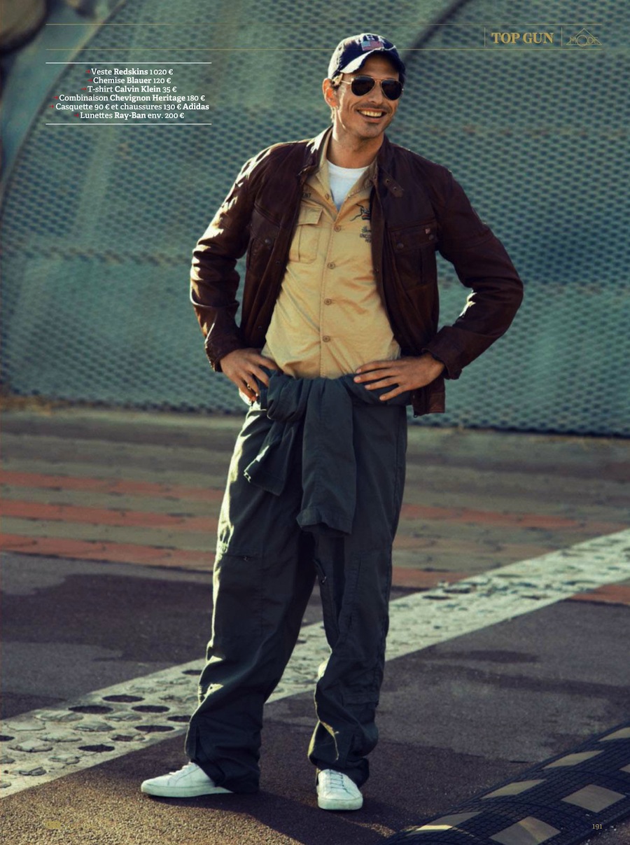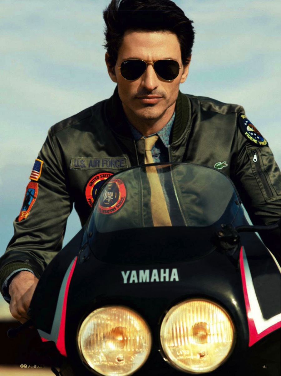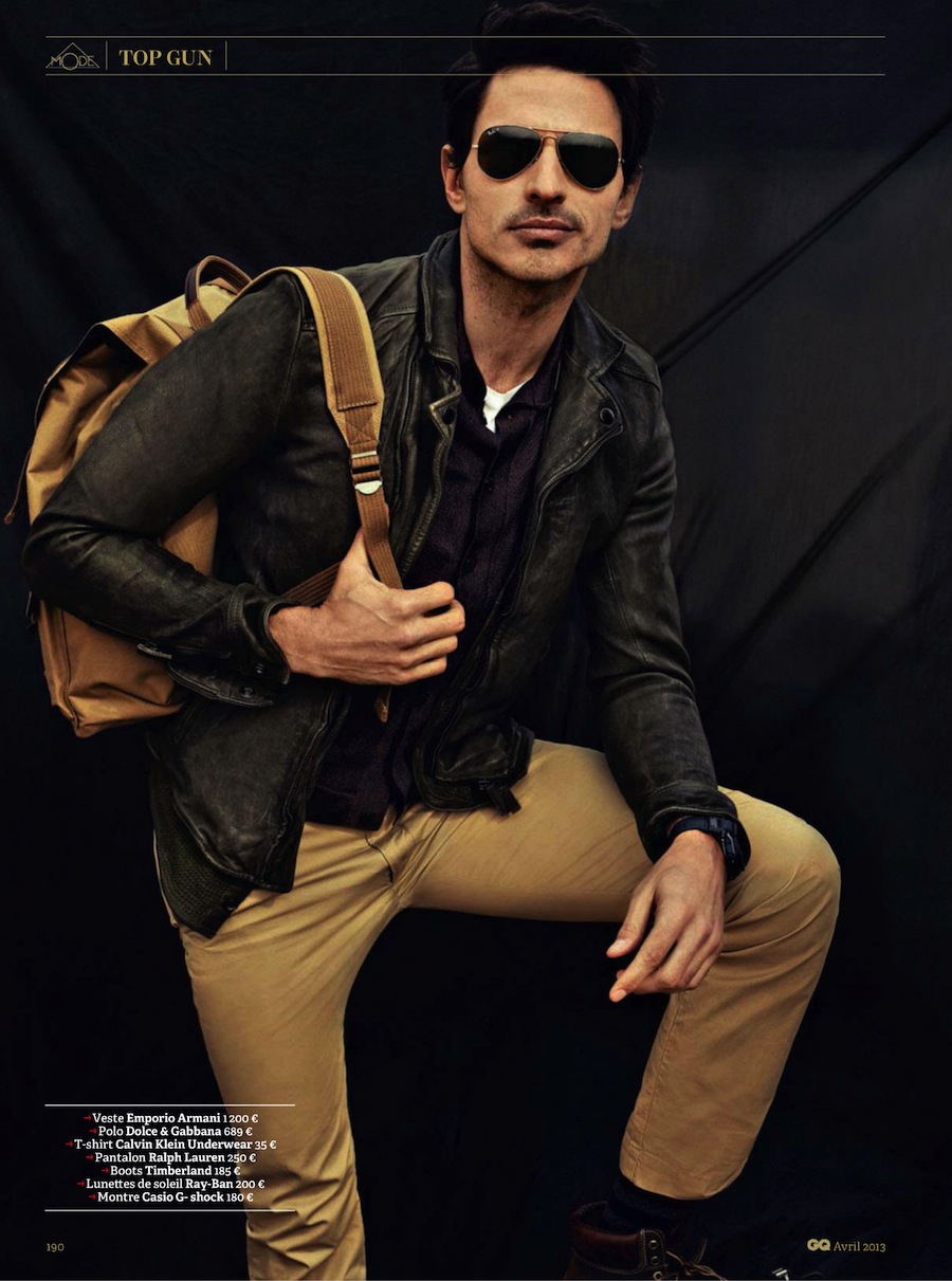 Top Gun–Channeling Tom Cruise’s character from the 1986 movie “Top Gun”, Spanish model Andrés Velencoso Segura graces the pages of GQ France’s April 2013 issue, appearing before the lens of Sergi Pons. For the cinematic story, the Sight model is outfitted by fashion editor Miguel Arnau, who assembles a wardrobe made of leather jackets, denim pieces, chinos and aviator sunglasses, where the designs of Emporio Armani, Dolce & Gabbana and others define a bold aesthetic.