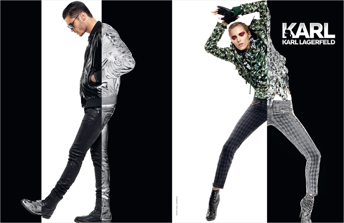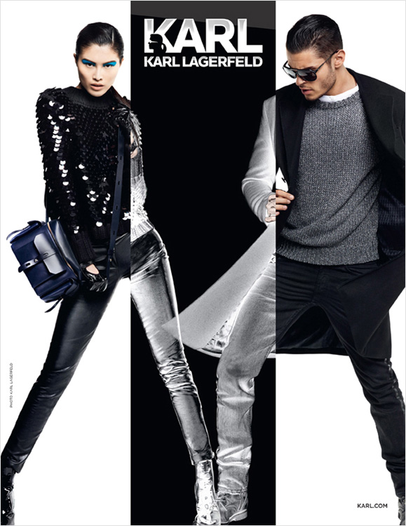 Karl’s Muse-Model Baptiste Giabiconi reunites once again with the unstoppable Karl Lagerfeld for the fall/winter 2012 campaign of Karl, the more accessible collection of the German fashion designer. Captured in a minimal set, Baptiste is styled by George Cortina in basic looks, including classic printed tees, leather jackets, slim jeans and sharp jackets, accessorized with black leather fingerless gloves and dark sunglasses, that add a touch of Lagerfeld’s signature style to the outfits. / Hair by Odile Gilbert. Makeup by Peter Philips.