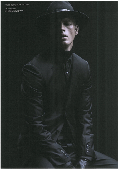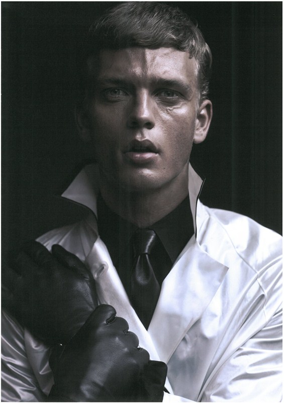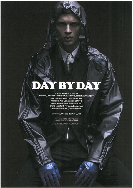 Solemn Shadows–Donning a monochromatic wardrobe, Benjamin Eidem (Nathalie) explores a darker shade of emotion for Common & Sense Man #43. Photographer Tetsuharu Kubota teams up with stylist Christian Stroble, capturing a stern Benjamin in head to toe Diesel Black Gold.