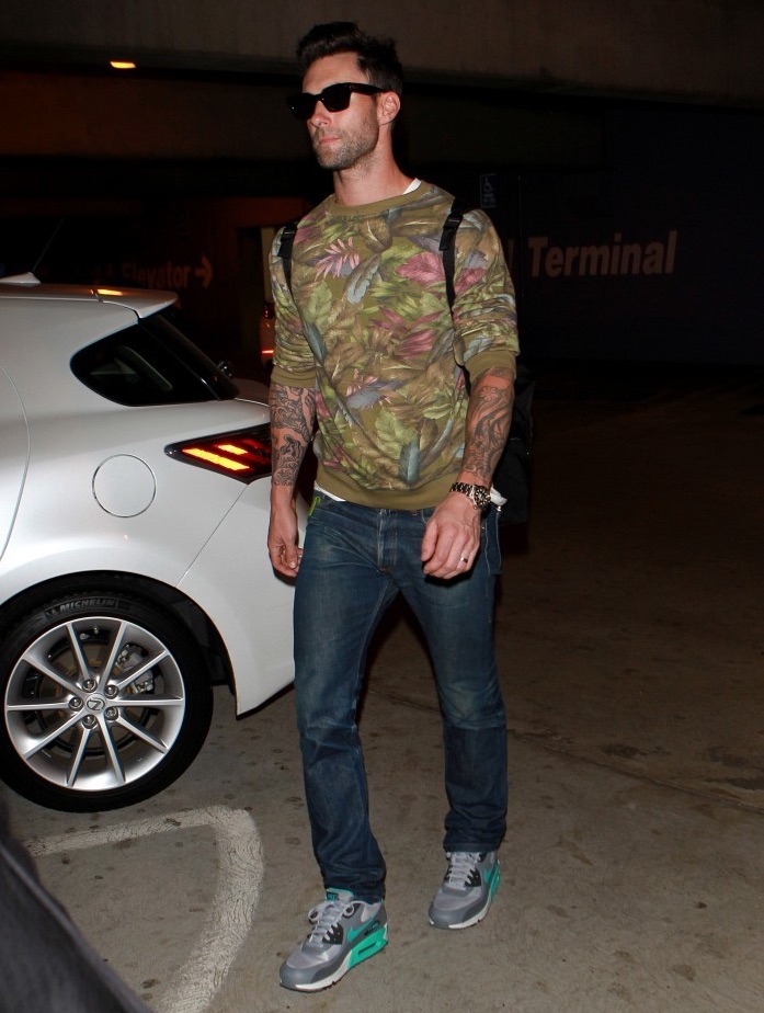 PinSpotted at LAX on October 24th, Maroon 5 frontman Adam Levine was casual in a pair of denim jeans, sunglasses and NIKE sneakers. Levine made a graphic statement with a floral print sweatshirt from his Kmart line.