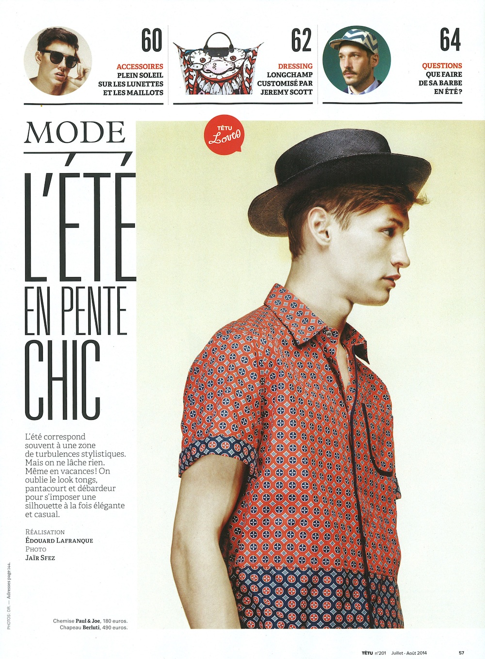 The Summer Way-Wearing summer fashions for the June 2014 issue of Têtu, model Adrien Volkov is photographed by Jaïr Sfez. Appearing in studio portraits, the Bananas model is styled by Édouard Lafranque sporting pieces from labels that include Berluti, Coach and Christophe Lemaire, creating a masculine silhouette which is elegant and casual at the same time.