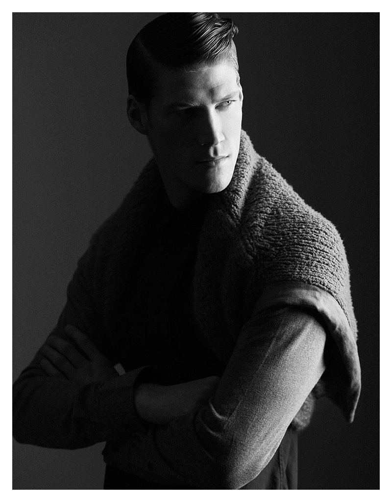 Alex wears neoprene coat Ezra Constantine, cardigan Comme des Garcons from TNT, button-down Band of Outsiders from Jonathan+Olivia, sweatpants Acne from Jonathan+Olivia, glasses Oliver Peoples from Spectacle and leather motor gloves Holt Renfrew.