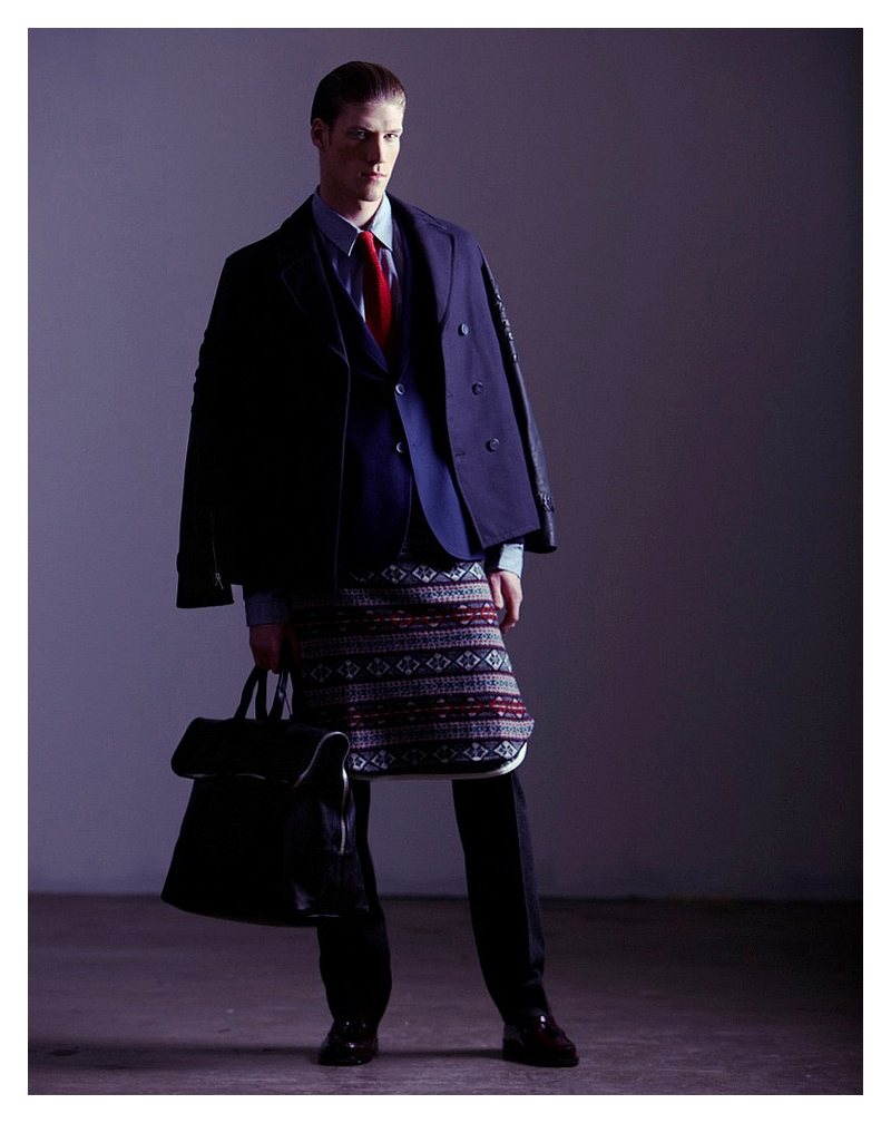 Alex wears peacoat 3.1 Phillip Lim from The Bay, button-down Oliver Spencer from The Bay, blazer Giorgio Armani, knit tie Holt Renfrew, trousers A.P.C. from Nomad, sweater Junya Watanabe from TNT, loafers Bass from Get Outside and bag 3.1 Phillip Lim from The Bay.