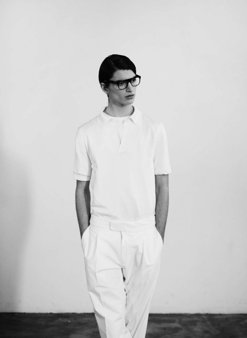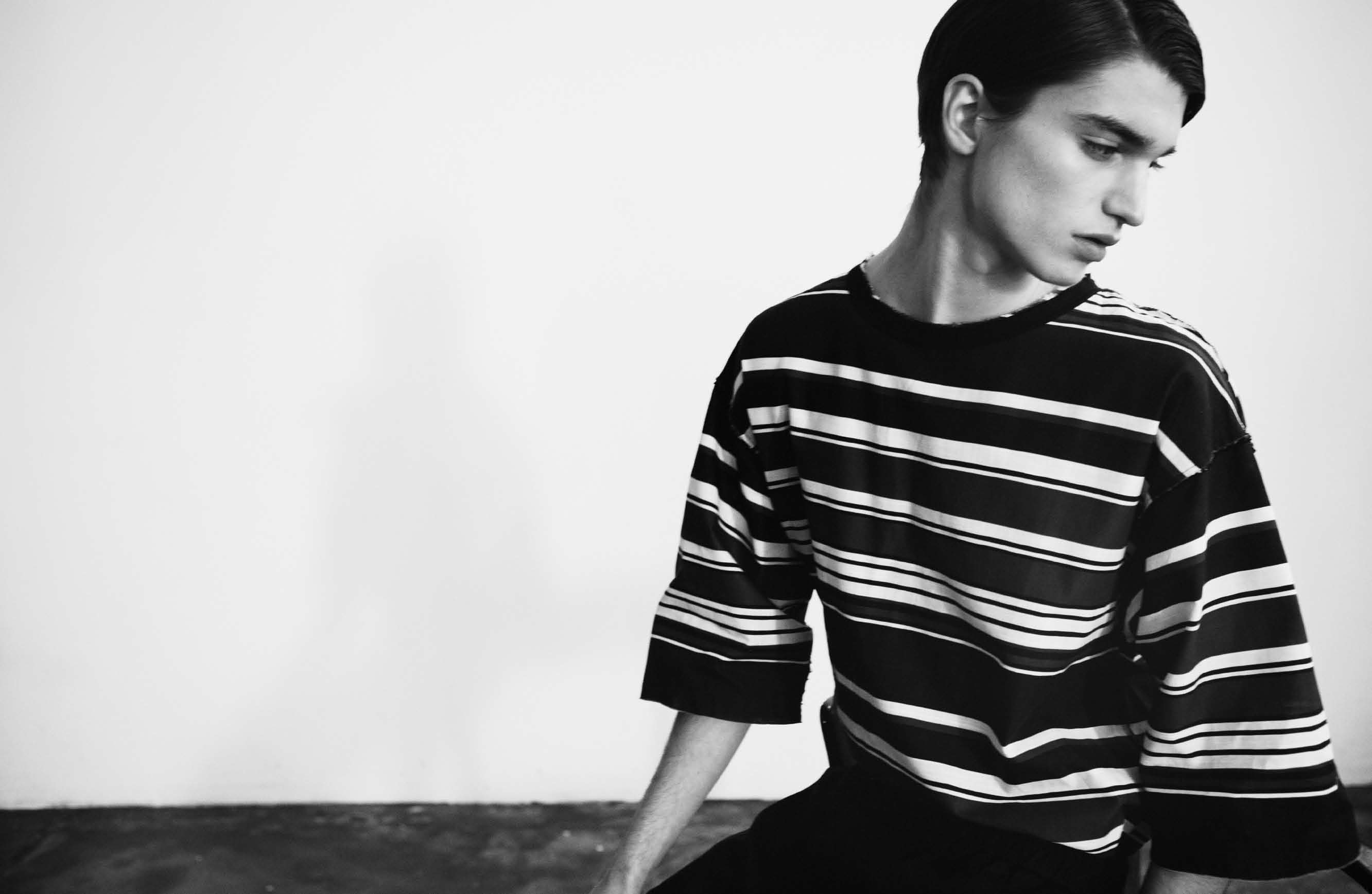Neutral Variations–Putting aside for a while the seasonal trend of bold and playful colors, photographer Stefania Paparelli shoots a gentle story featured in the latest issue of The Greatest. Teaming up with Matteo Greco, the magazine’s Editor-in-Chief and Fashion Director, the pair join creative forces to create a series of images where neutral tones are interrupted only by graphic patterns and dark colors. To display this array of wearable spring looks, including Dolce & Gabbana’s striped designs, Prada’s geometric silhouettes, Givenchy’s religious motifs and many others desirable numbers, Paparelli focuses her lens on L’Uomo Elite model Alexander Ferrario, who provides his young charisma in a series of studio images. / Hair by Dora Roberti (WM Management). Makeup by Giorgia Pambianchi (Atomo).