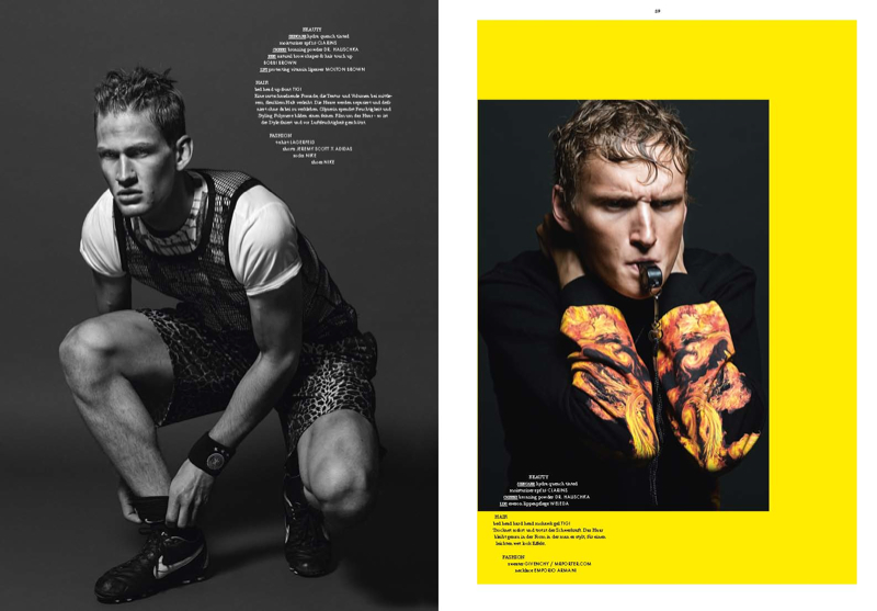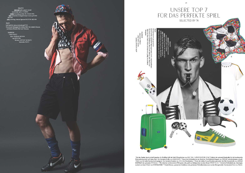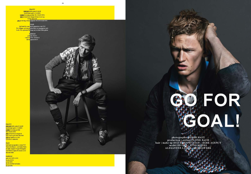 Go for Goal! Models Alexander Laible and Sigurd Colsman (Fusion) get in touch with their sporty side for an editorial in 74 magazine. Photographed by Dinah Hayt with styling by Oliver Rauh, fashion takes on a keen focus with sports shoes complementing relaxed shorts, jerseys, polo shirts and other casual items.