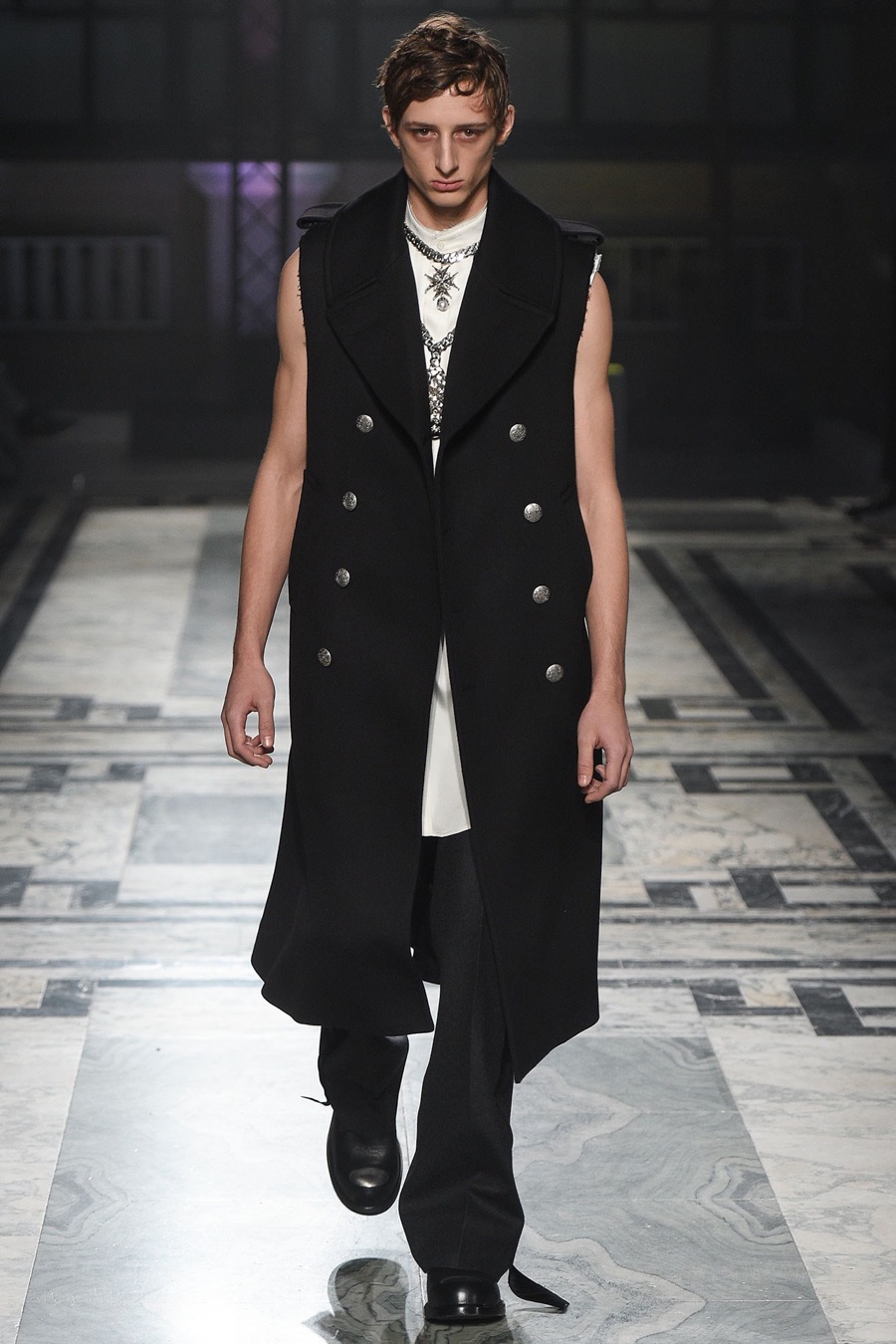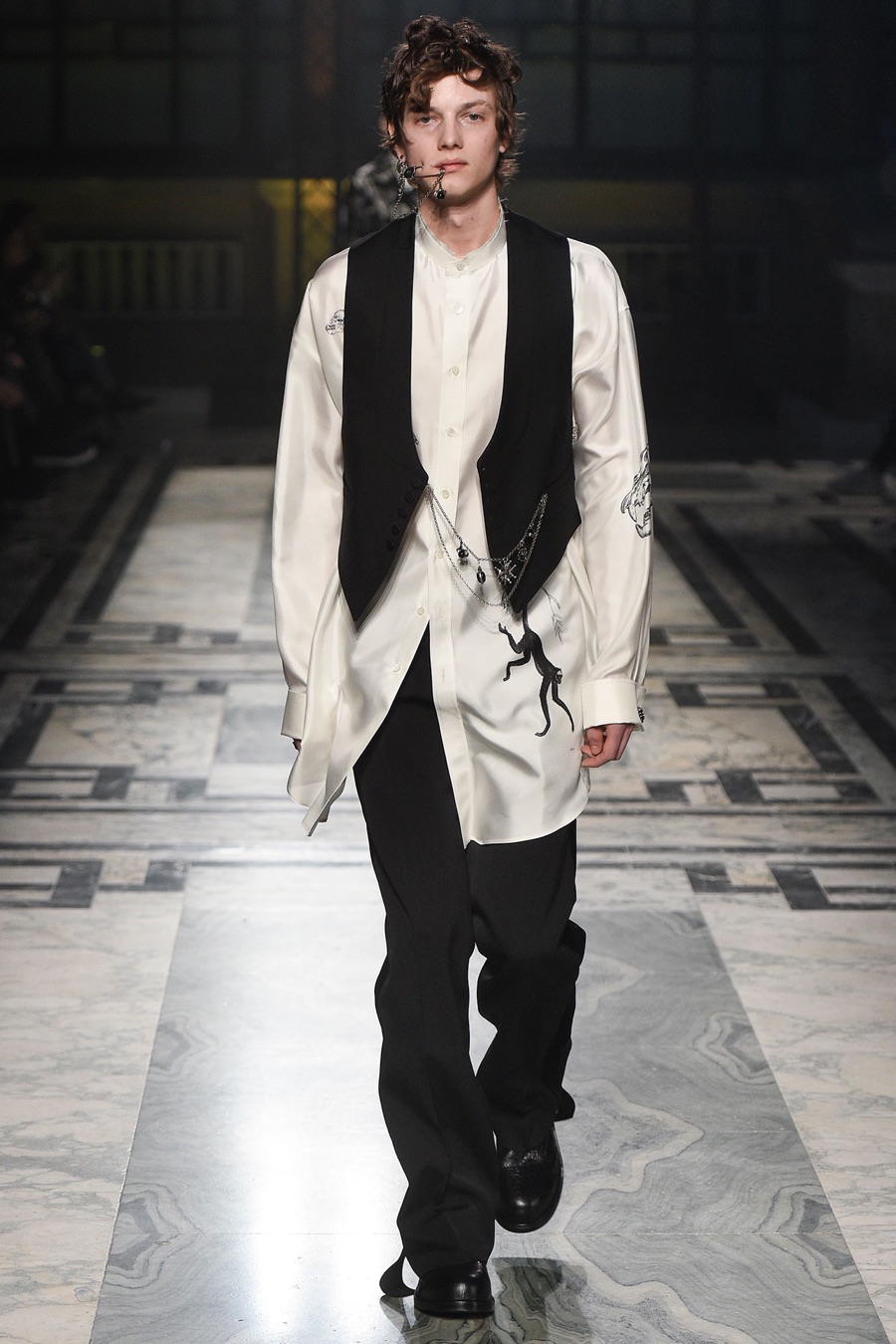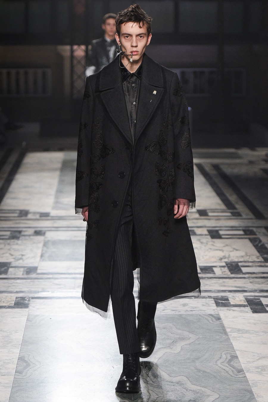 Models at Alexander McQueen were a gruesome sight as they took to the catwalk with safety pin piercings that cut through the cheek. One of the highlights of London Collections: Men, Alexander McQueen presented its fall-winter 2016 men’s collection with a Victorian Gothic leaning.