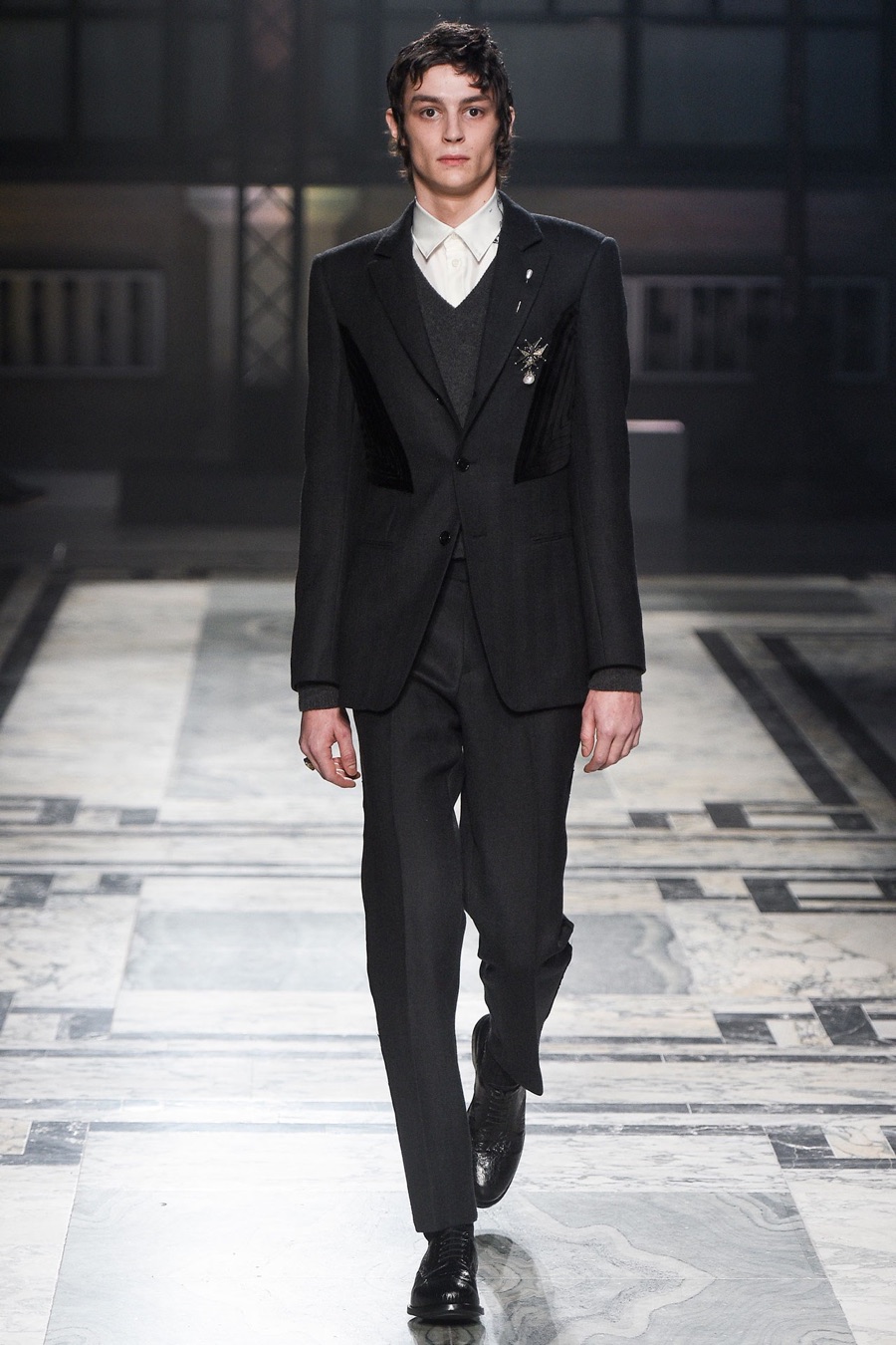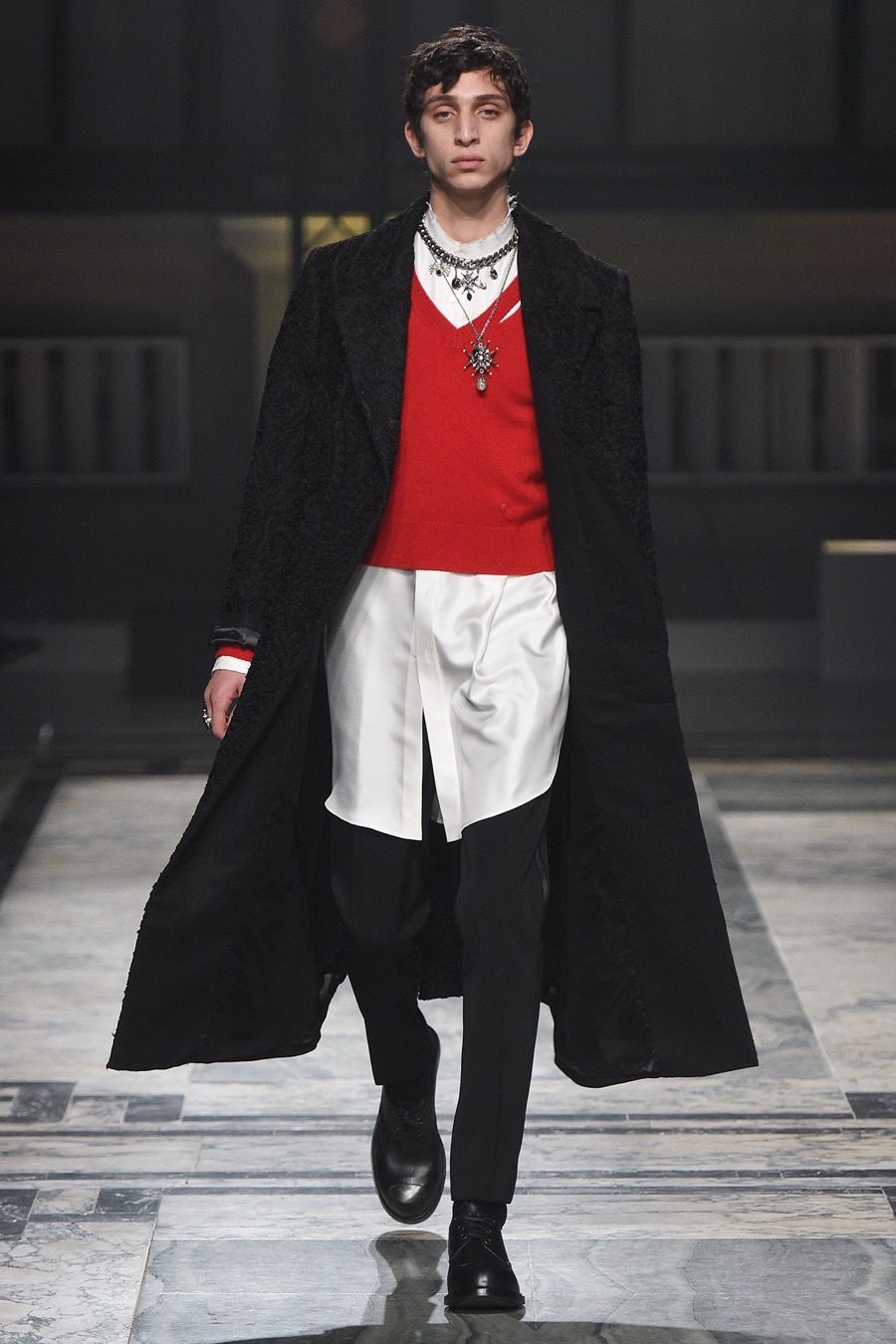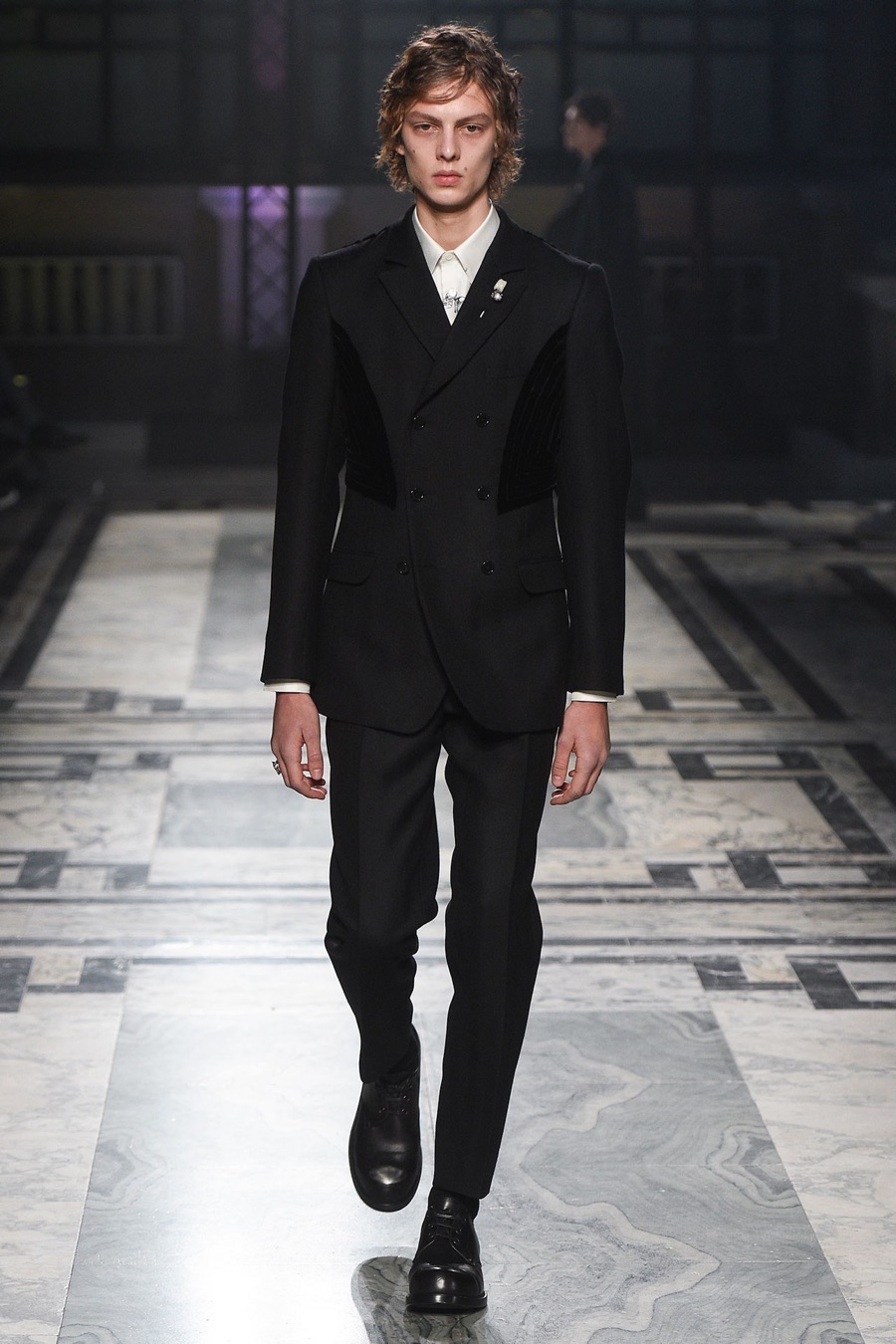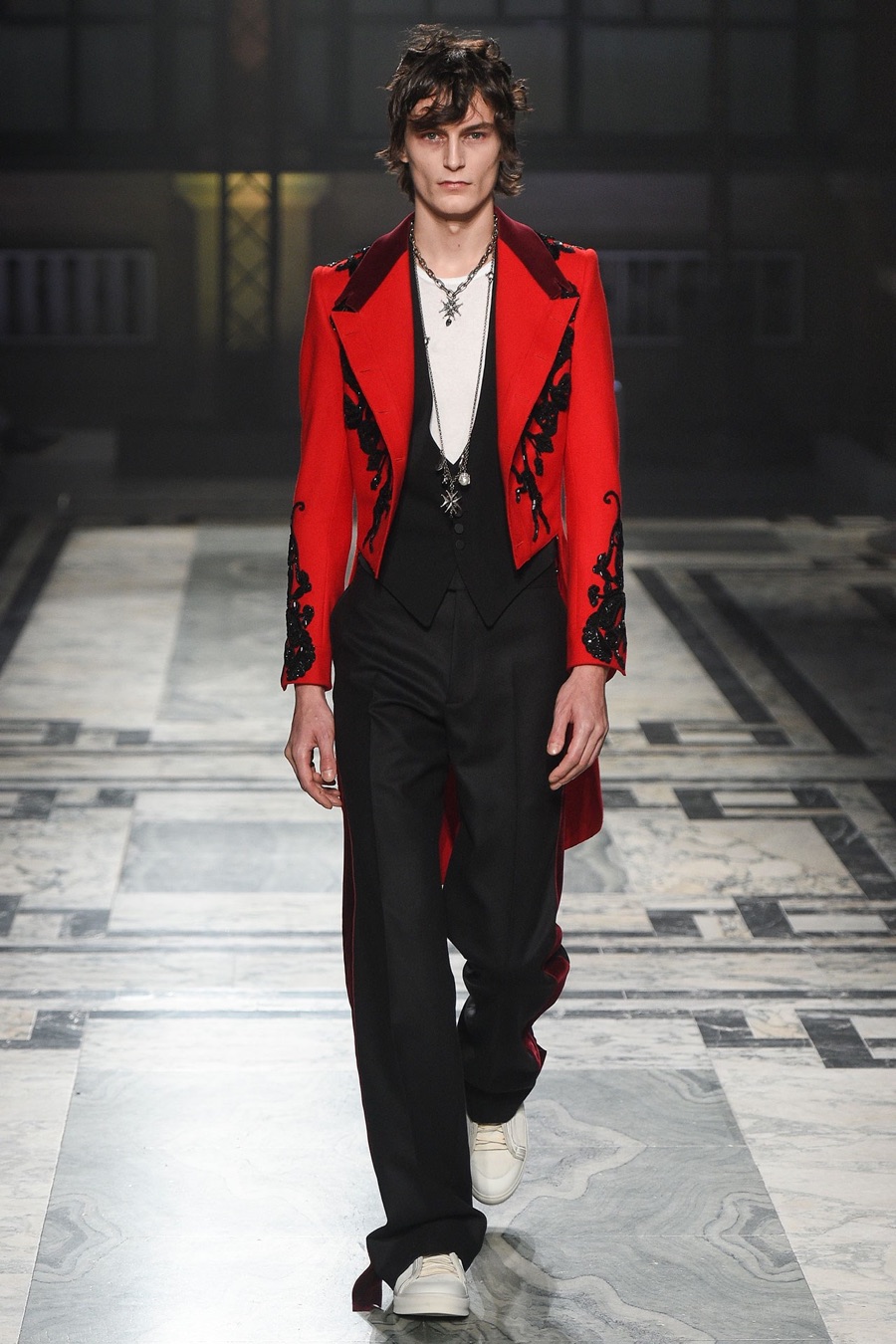 Models at Alexander McQueen were a gruesome sight as they took to the catwalk with safety pin piercings that cut through the cheek. One of the highlights of London Collections: Men, Alexander McQueen presented its fall-winter 2016 men’s collection with a Victorian Gothic leaning.