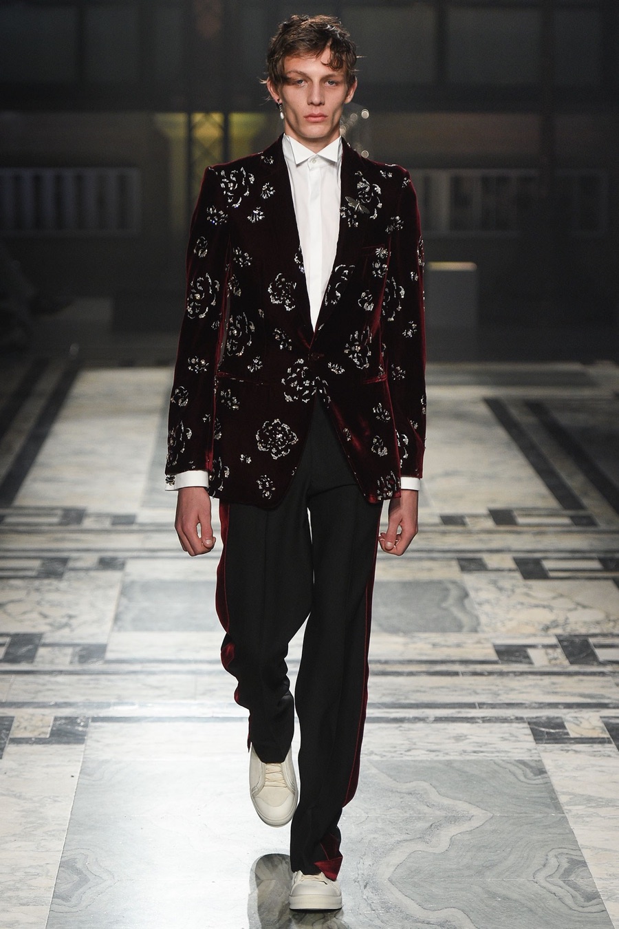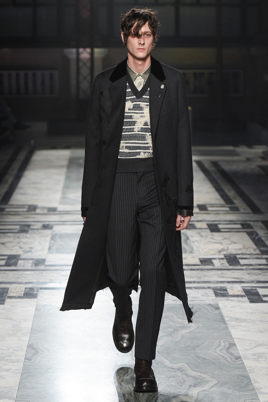 Approaching the season, the brand’s creative director Sarah Burton embraced sharp, classic tailoring and a penchant for dark graphics. Juxtaposed with a somber spin on romance, long overcoats and trim suiting were paired with cropped crewneck sweaters and longline dress shirts for quite the vision. A glimmer of butterfly prints, rich brocades, sequined embellishments and floral patterns added unique character to the dramatic outing.