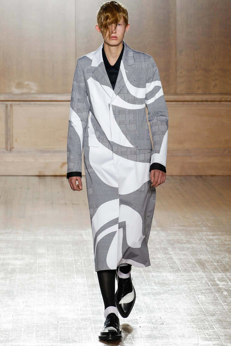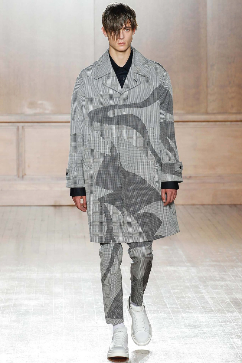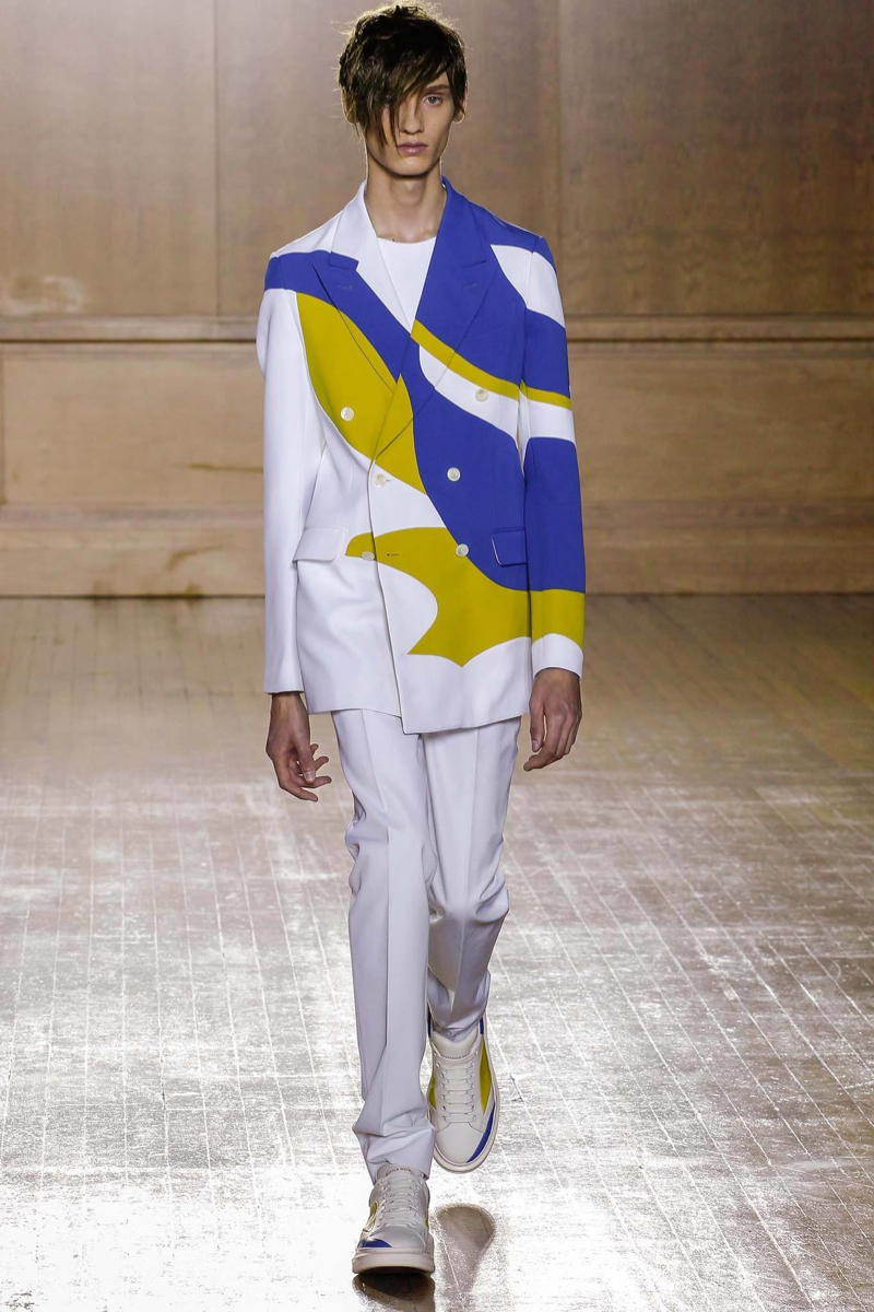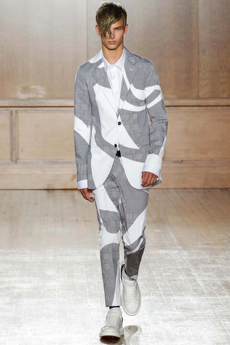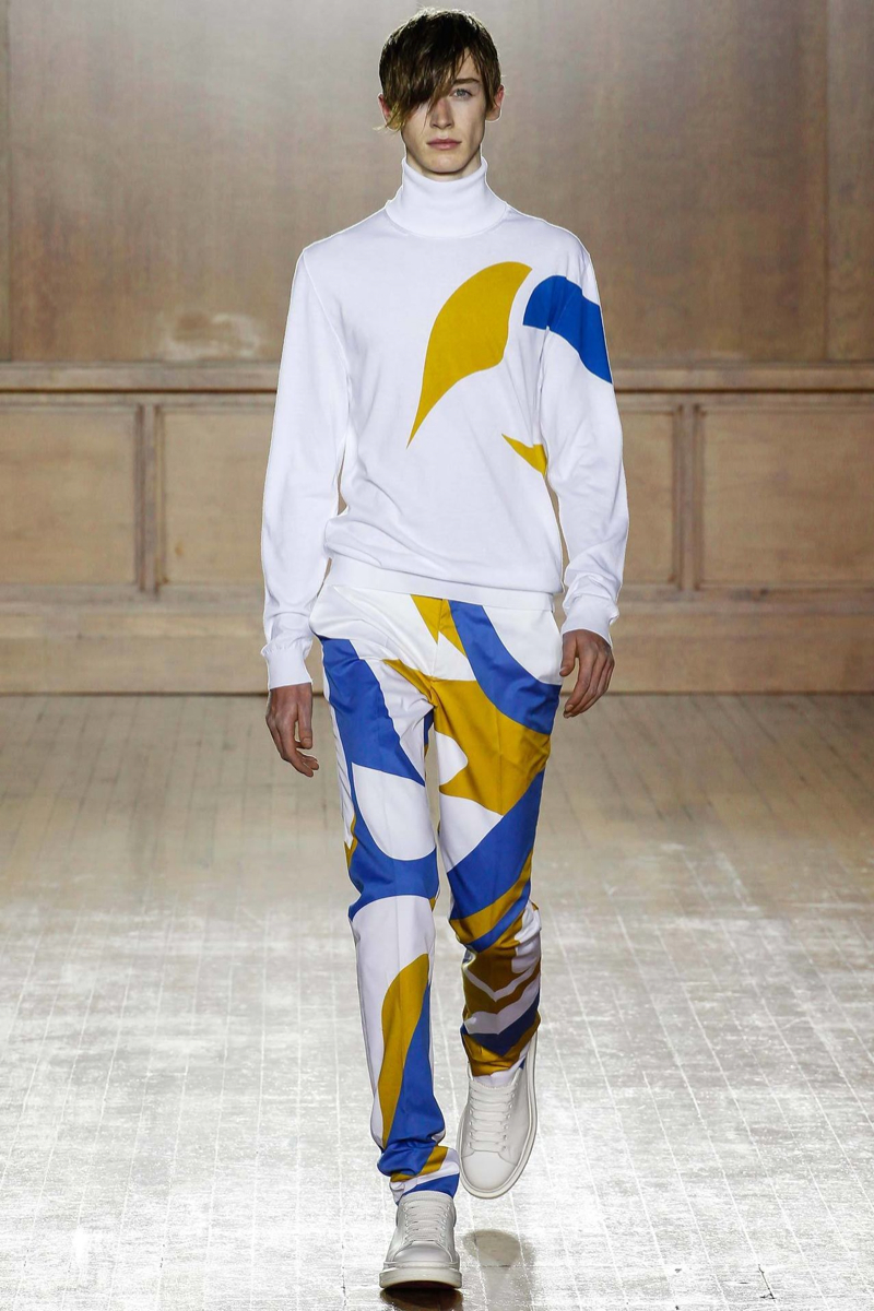 Alexander McQueen Spring/Summer 2015–Hitting the makeshift catwalk at the Royal College of Surgeons of England, the men of Alexander McQueen unveiled a tailored offering for spring/summer 2015. Delivering a graphic punch, Kubuki makeup patterns broke up the volume of outerwear that came across as lab coats. Red, black, white, blue and yellow dressed this season’s color palette as oversized turtleneck sweaters, double-breasted blazers and wide-cut trousers served as the canvas. Playing with tradition, houndstooth was reimagined with the collection’s graphic signatures.