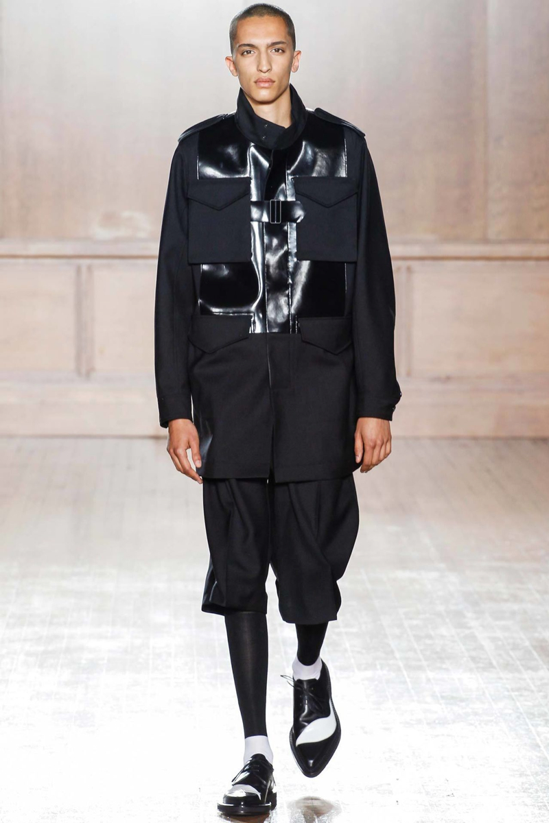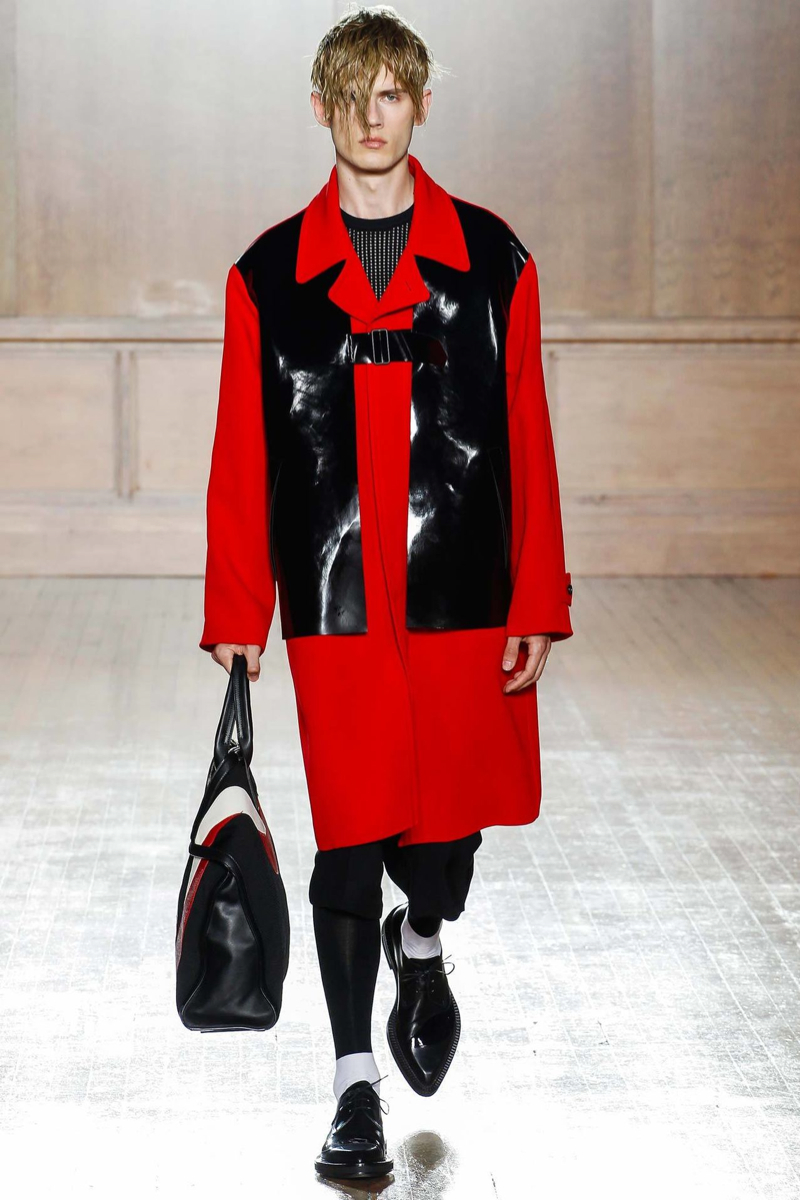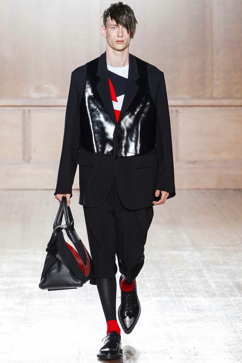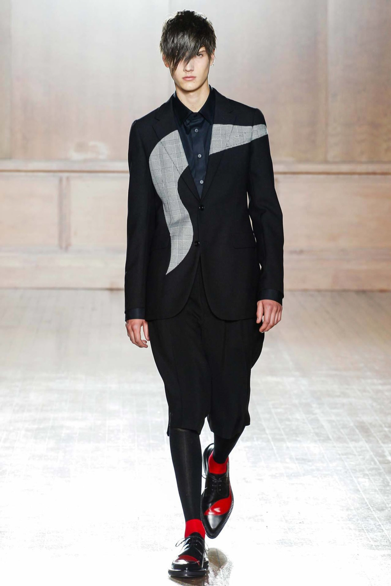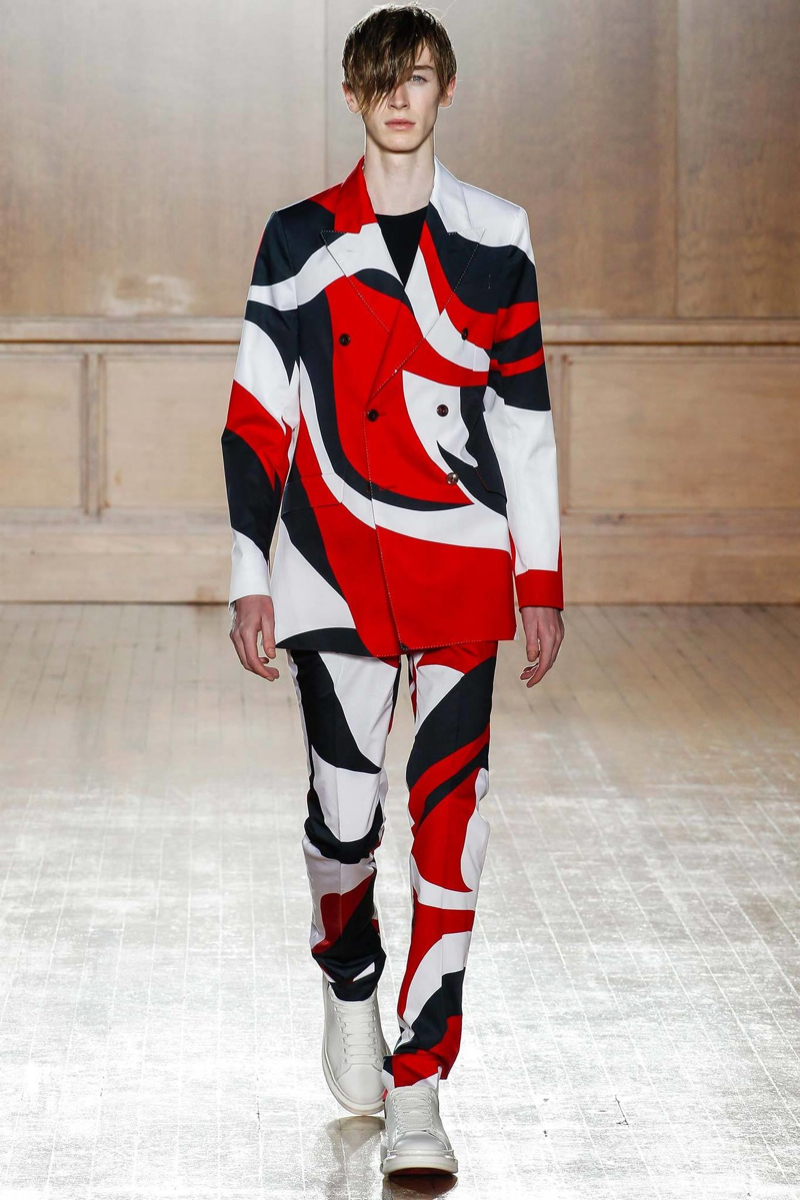 Alexander McQueen Spring/Summer 2015–Hitting the makeshift catwalk at the Royal College of Surgeons of England, the men of Alexander McQueen unveiled a tailored offering for spring/summer 2015. Delivering a graphic punch, Kubuki makeup patterns broke up the volume of outerwear that came across as lab coats. Red, black, white, blue and yellow dressed this season’s color palette as oversized turtleneck sweaters, double-breasted blazers and wide-cut trousers served as the canvas. Playing with tradition, houndstooth was reimagined with the collection’s graphic signatures.