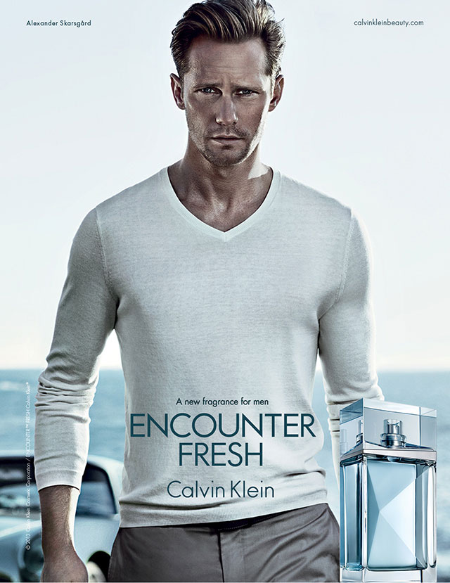 True Freshness–Swedish actor Alexander Skarsgård reunites with American label Calvin Klein to front the campaign for their latest masculine fragrance. Encounter Fresh, a new edition of the brand’s Encounter fragrance, launched in 2012, is a woody and aromatic scent, with a structure that blends the freshness of bergamot and mojito with spicy and aromatic notes of lavender, cardamom and patchouli. Photographed by Steven Klein in a luminous daylight, the True Blood actor is styled by Miguel Enamorado in a lightweight v-neck jumper and classic trousers, and appears in an outdoor advertisement, with creative direction by Fabien Baron. / Hair by Garren. Makeup by Mark Carrasquillo.