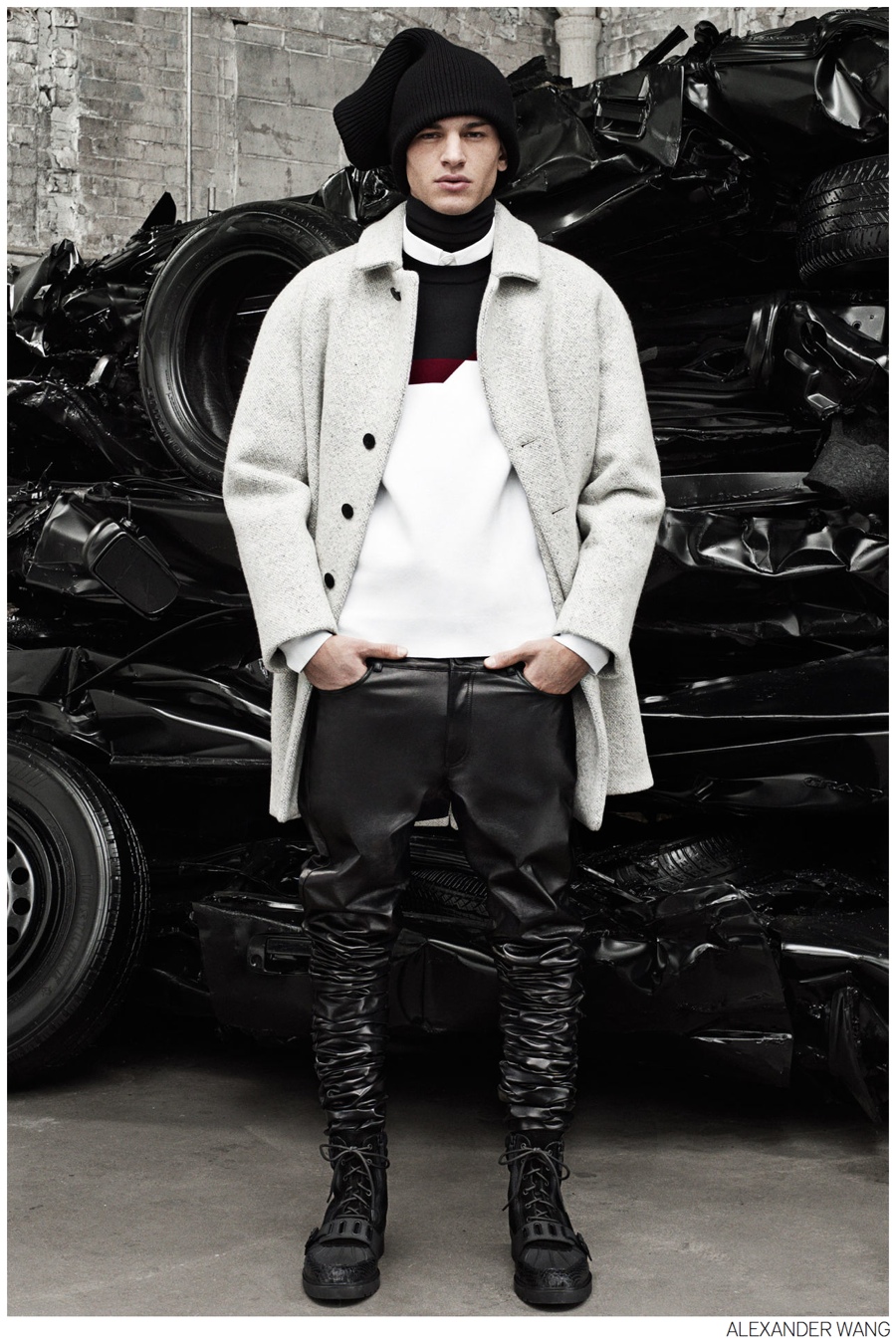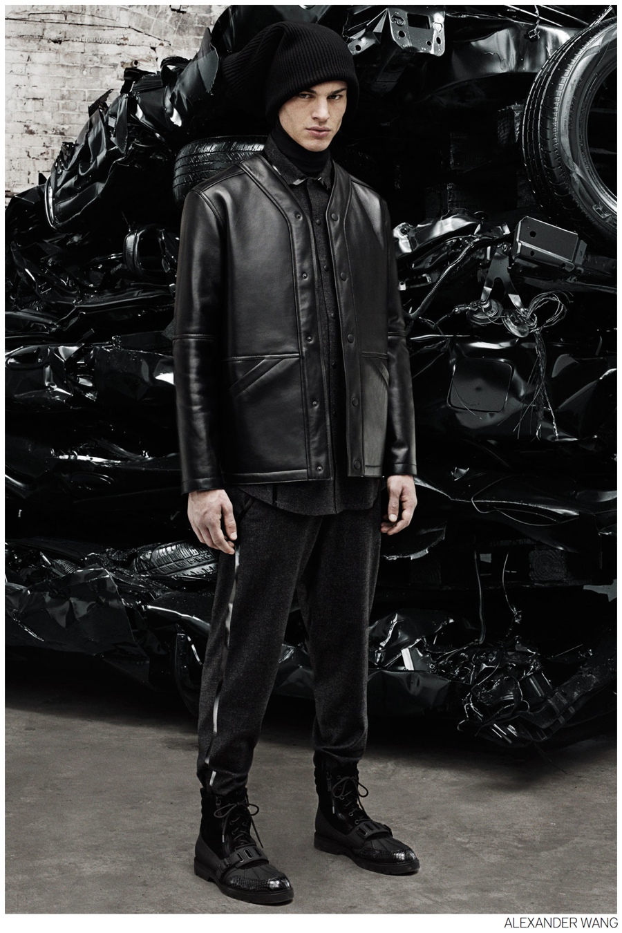 Alexander Wang Fall/Winter 2014-Remaining close to his comfortable penchant for sporty streetwear-influenced designs, Alexander Wang presents a dark fall. Possessing an effortless cool, a complete wardrobe comes together with casual sentiments. Mixing leather and suede, semi-relaxed trousers are paired with bomber jackets, mid-length coats, pullovers and knitwear. Playing up elements like the shirt jacket, leather finds another companion, bringing the collection full circle with a modern approach to everyday dressing.