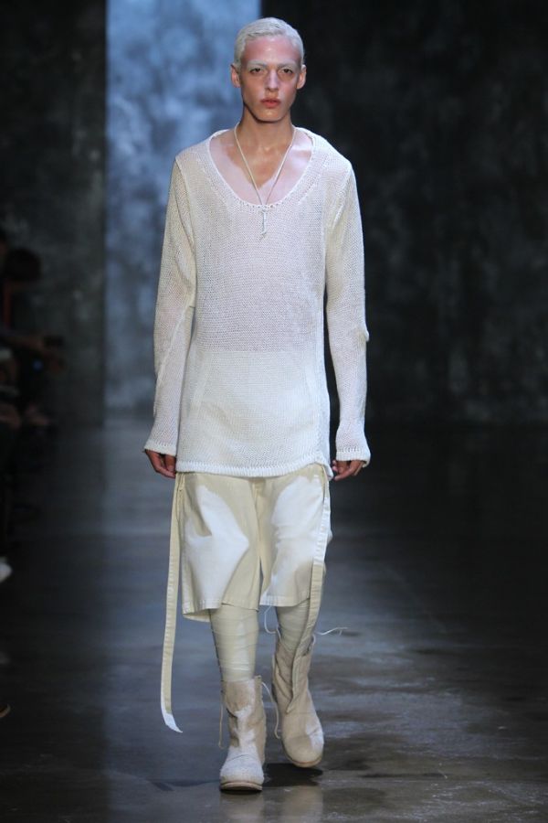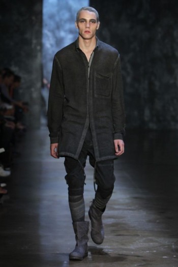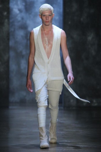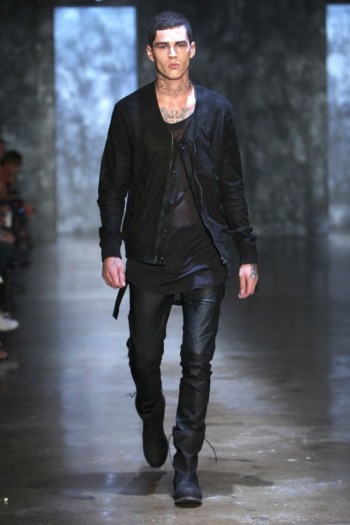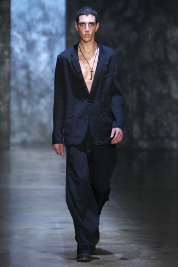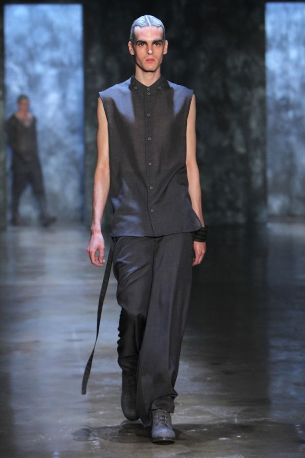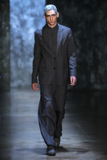 The Dark Coming–Alexandre Plokhov’s design outlook was indeed dark for the approaching spring/summer 2013 season. Kicking off the collection with a sea of black, Plokhov’s uniform of choice was born from black and executed with a modern point of view. Classic staples such as the trench and overcoat offered a tailored perspective, while a contemporary flair flourished with sleeveless coats, plunging necklines, billowing trousers, light layers and treated fabrics. Add a splash of white to round out the collection and the lineup overall was an awakening with hard structured pieces playing against their soft frail counterparts for a smart mix.