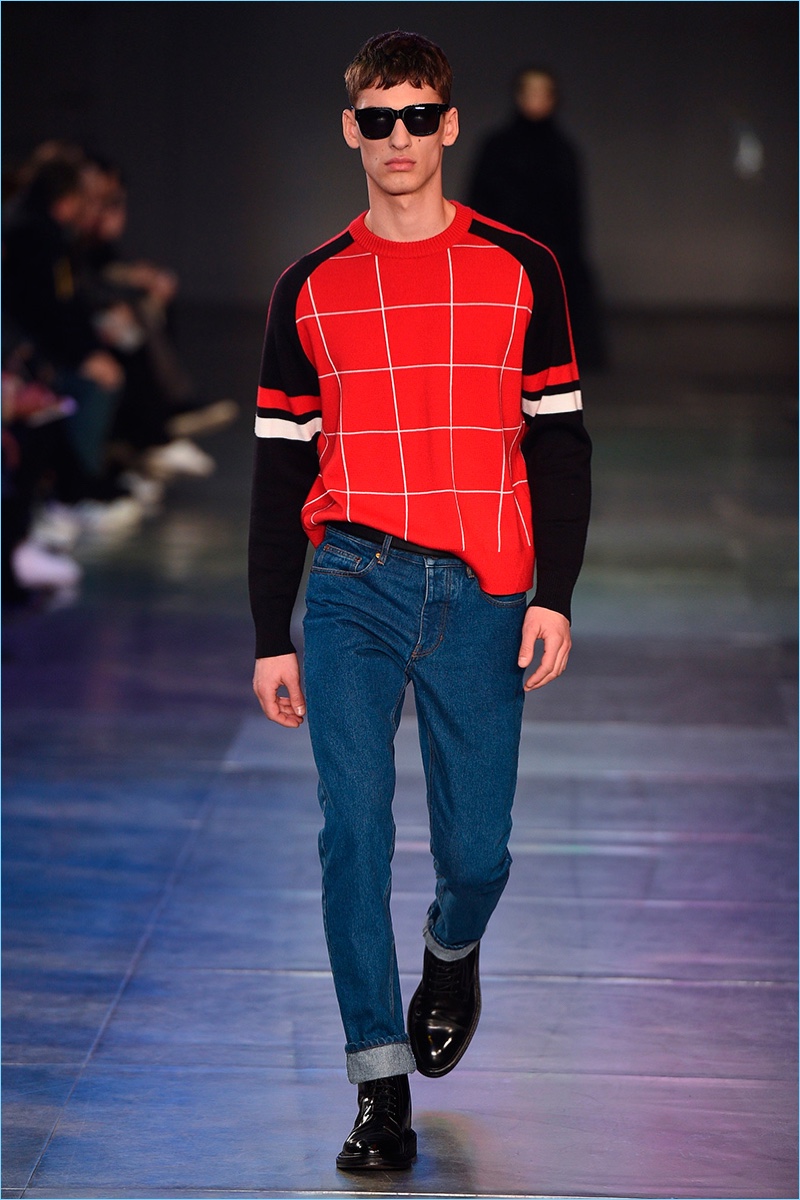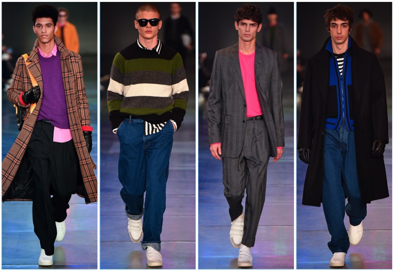 Relaxed silhouettes dominate the range with a laid-back style proposal. Here, various wardrobe staples come together as low-key layers. Mattiussi’s lineup tackles must-have pieces, which range from plaid overcoats and striped crewneck sweaters to slouchy cut suiting. Baggy denim jeans, argyle knits, hooded sweatshirts, and buffalo check shirts also make the effortless edit.