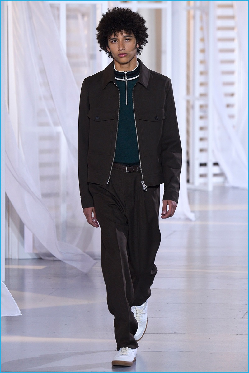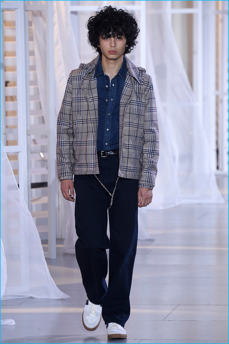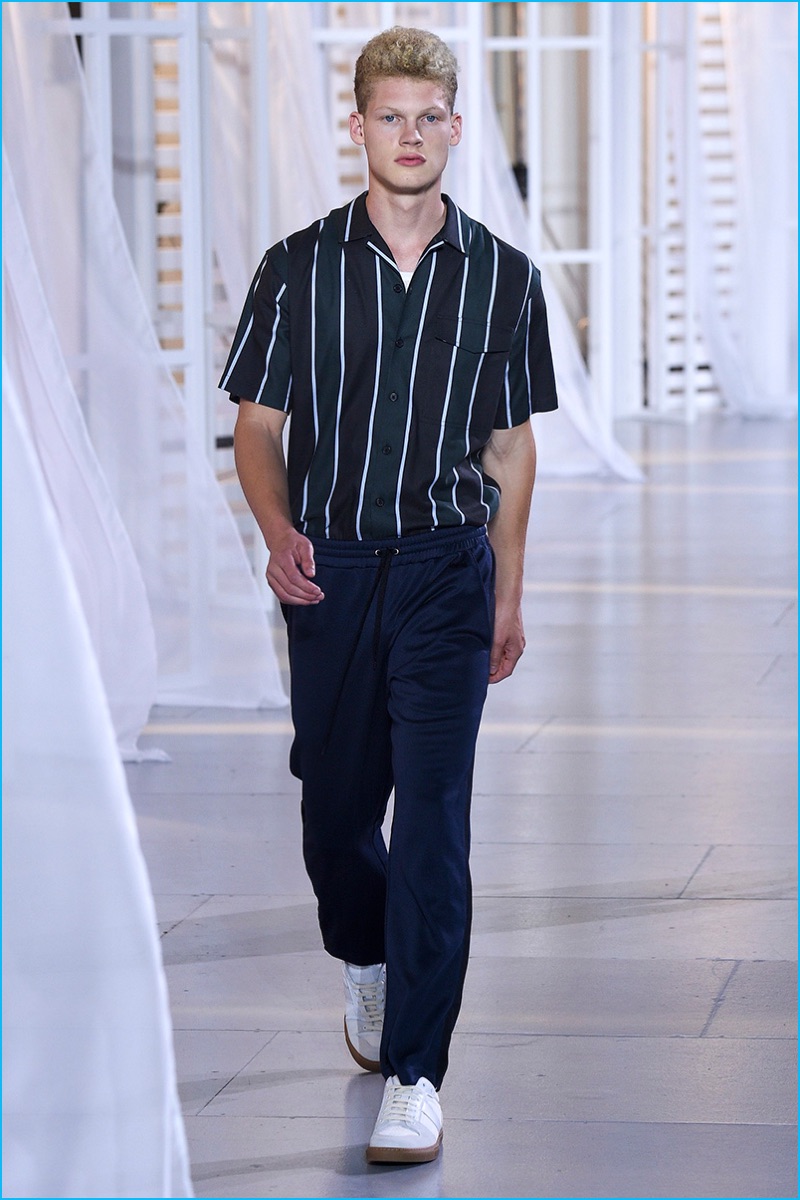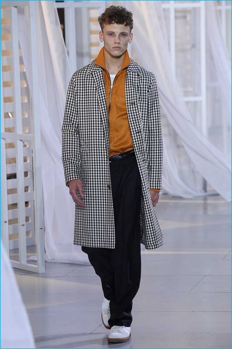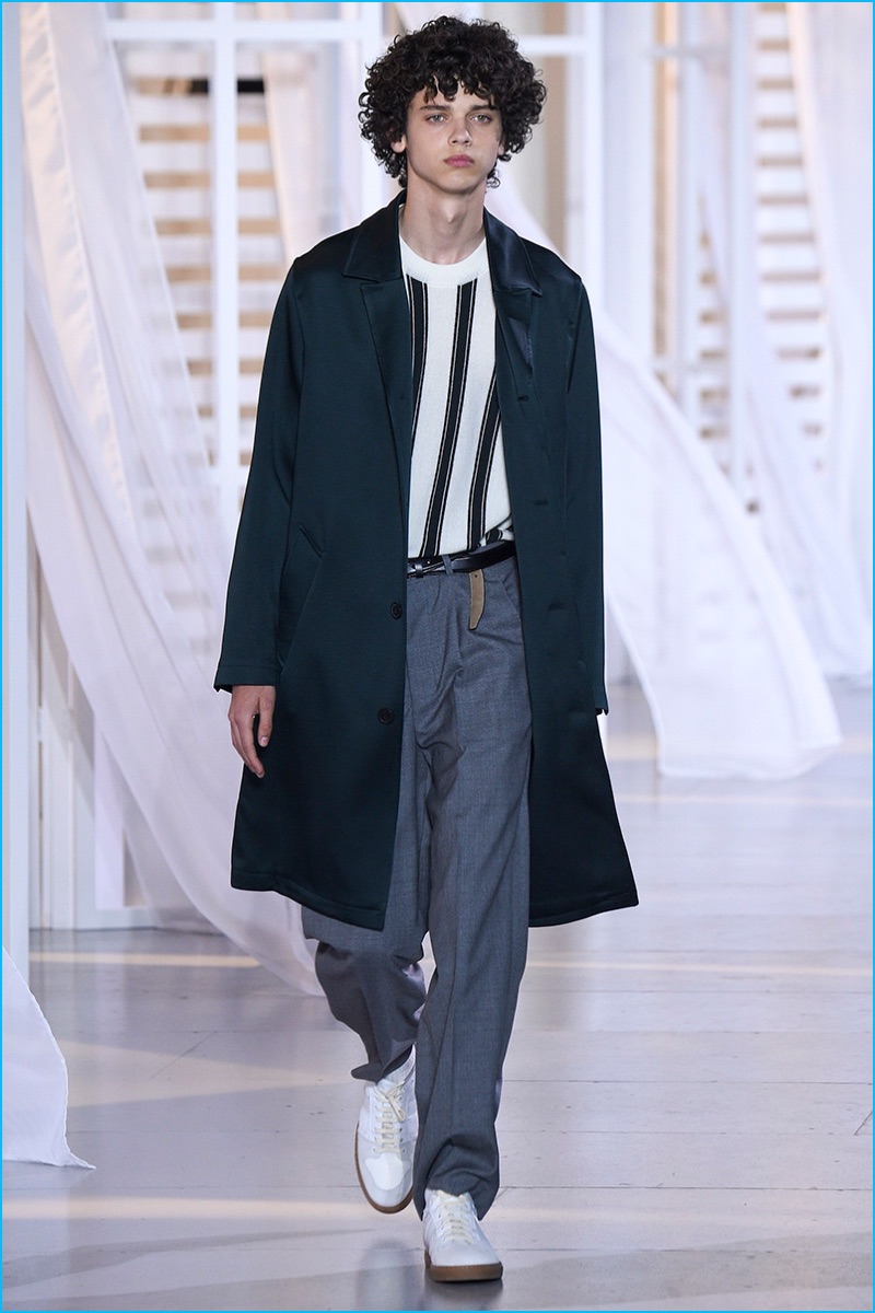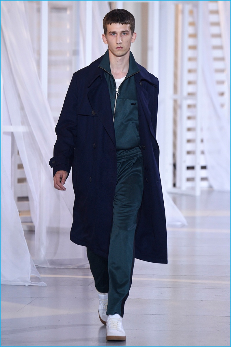 Designer Alexandre Mattiussi contributes an effortless attitude to spring-summer 2017. Ami’s latest collection celebrates Parisian style. The fashion brand’s man represents the Parisian lover this season. A certain ease resonates with a lineup of relaxed proportions. Slouchy trousers, crisp white sneakers, solid bomber jackets, lightweight check coats, retro-style button-down shirts and half-zip pullovers highlight Mattiussi’s practical point of view. Season after season, the designer effortlessly balances contemporary silhouettes with a laid-back approach to style. Spring is no different. The tracksuit rounds out the season with a cheeky but enviable cool.