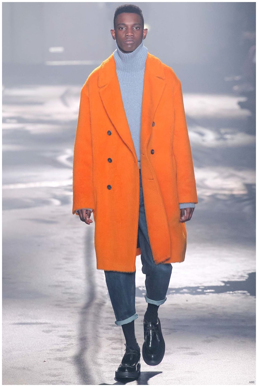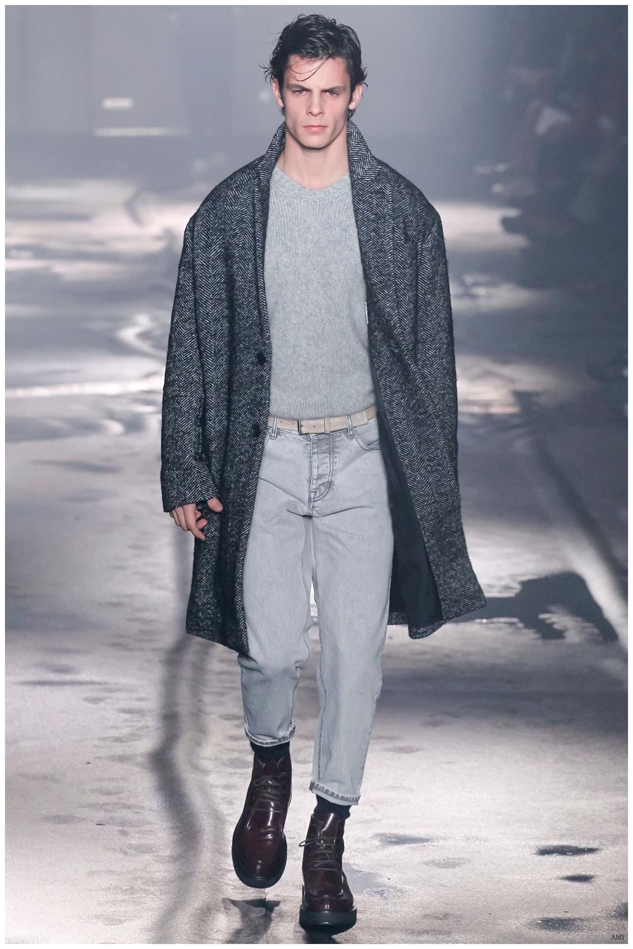AMI designer Alexandre Mattiussi presented a hard, youthful edge for fall-winter 2015, but with an attitude that can be adapted across ages. Bringing together a variety of pieces with relaxed proportions and a focus on separates, a collection of wearable pieces were turned out. Crafting a seamless, adaptive uniform, casual and formal articles played off each other with a certain ease. Pleated trousers were relaxed and suits dressed in pinstripes. Perhaps, the collection’s most prominent statement belonged to its use of denim. A mix of light and dark denim jeans were worn with oversized coats and simple knitwear, resulting in looks that were simply easy. Pairing smart basics with statement outerwear and boots, AMI’s man marched to a triumphant beat of his own drum.
