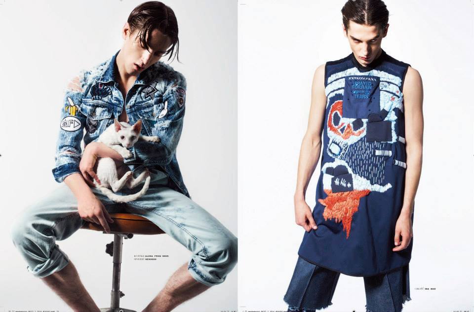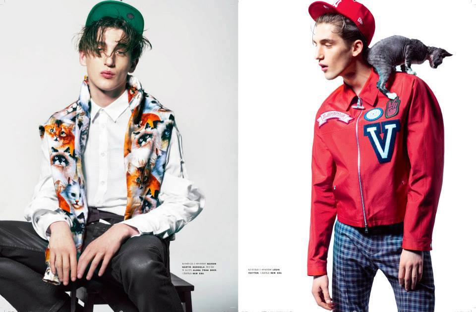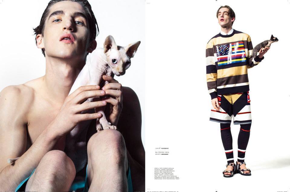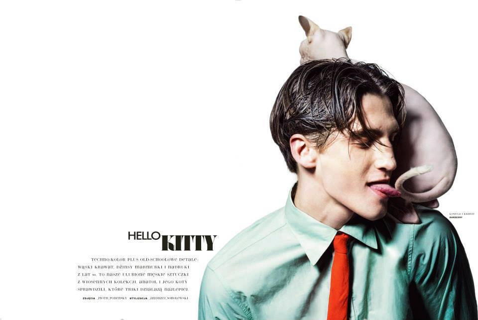 Hello Kitty-Model Anatol Modzelewski charms in a new spread from Viva! Moda. As cats and dogs are clearly becoming a seasonal trend, Anatol poses with a pair of cats, photographed by Piotr Porebsky. Sporting garments from Louis Vuitton, Givenchy and other luxury brands styled by Andrzej Sobolewski, Anatol delivers quirky strides with his new best friends. / Makeup by Beata Milczarek.