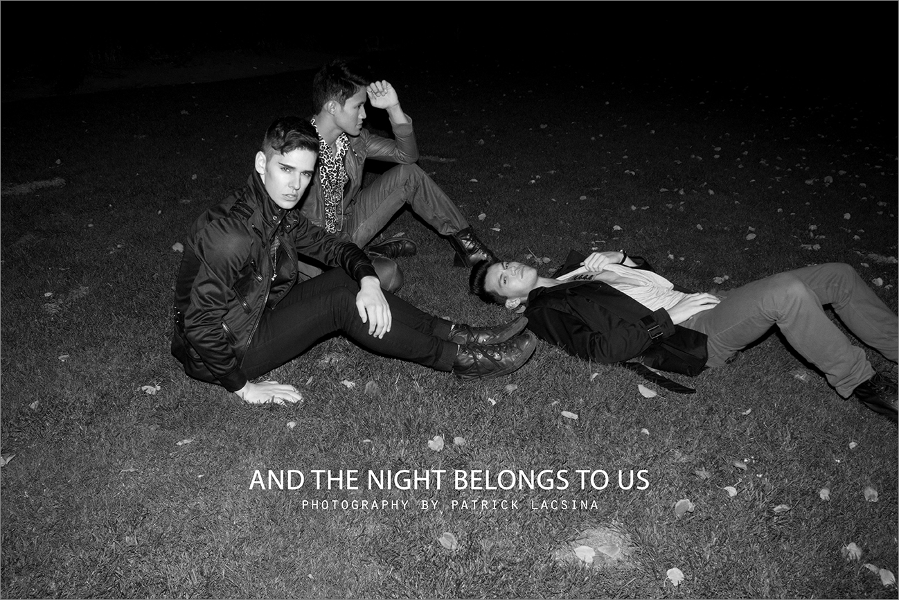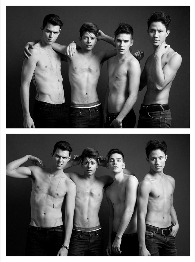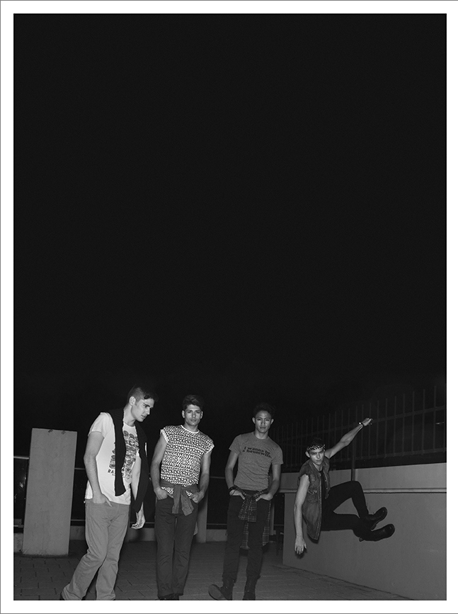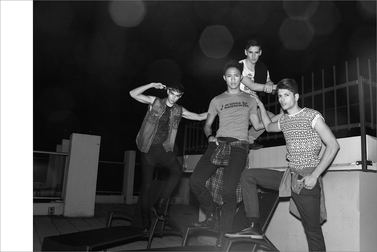 And the Night Belongs to Us–Elite Toronto models Justin M & Stefan joined with Push models Feras & Rama Luksiarto for a black & white story photographed by Patrick Lacsina. Capturing the energy of youth, Lacsina beautifully lensed the models in both studio and outdoor images, showcasing a relaxed wardrobe, assembled by stylist Aaron Quindipan, that played with printed tees and shirts, denim pieces and see-through tank tops. / Grooming by Amanda Blair.