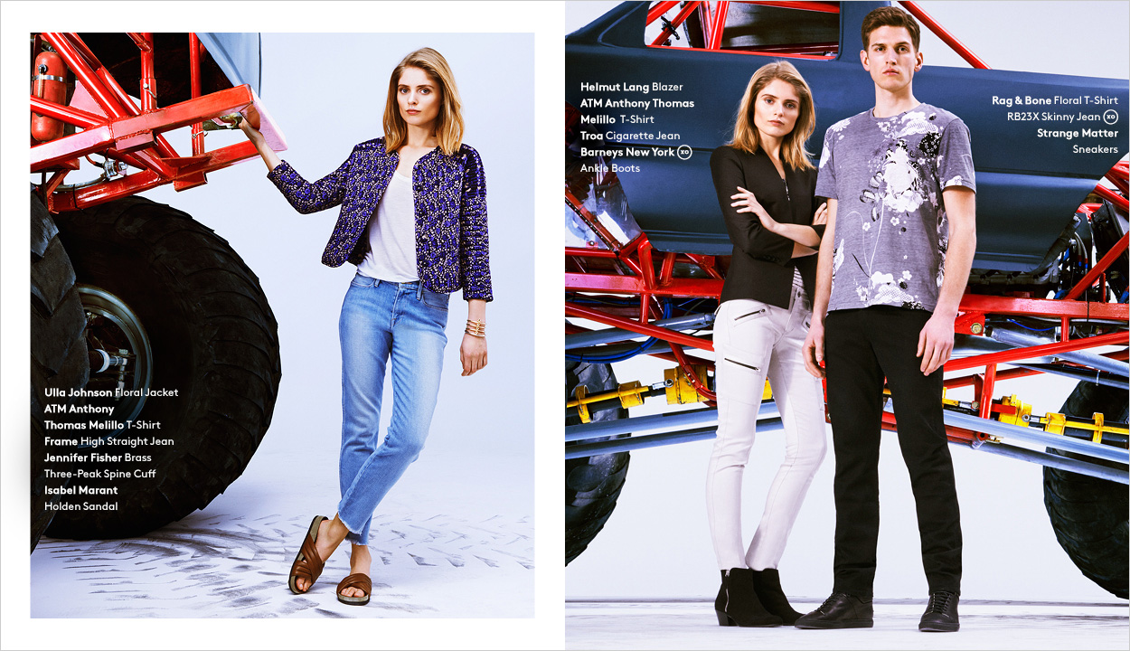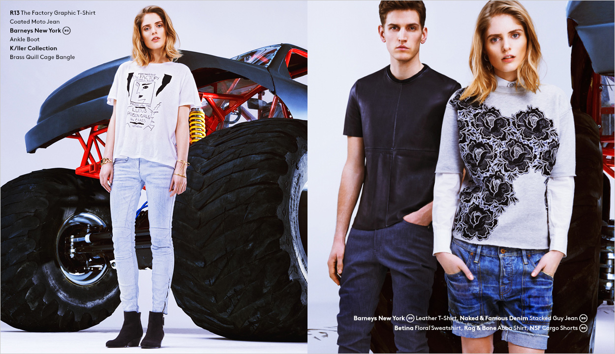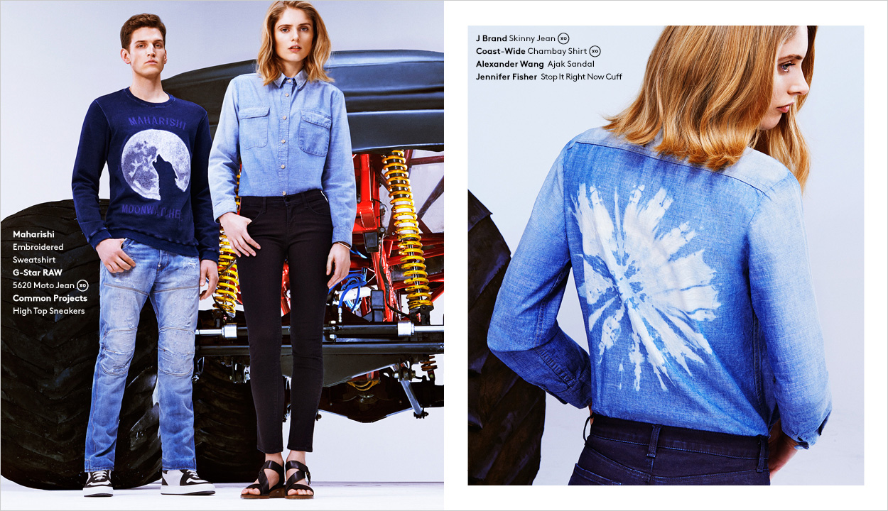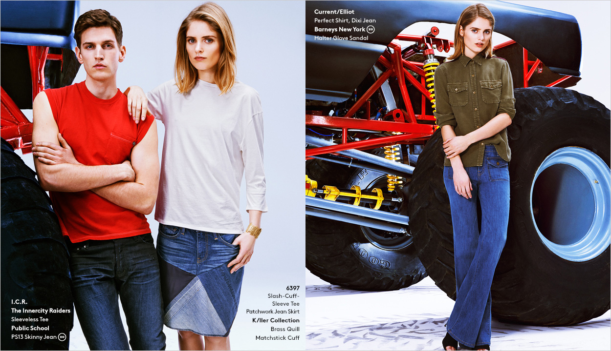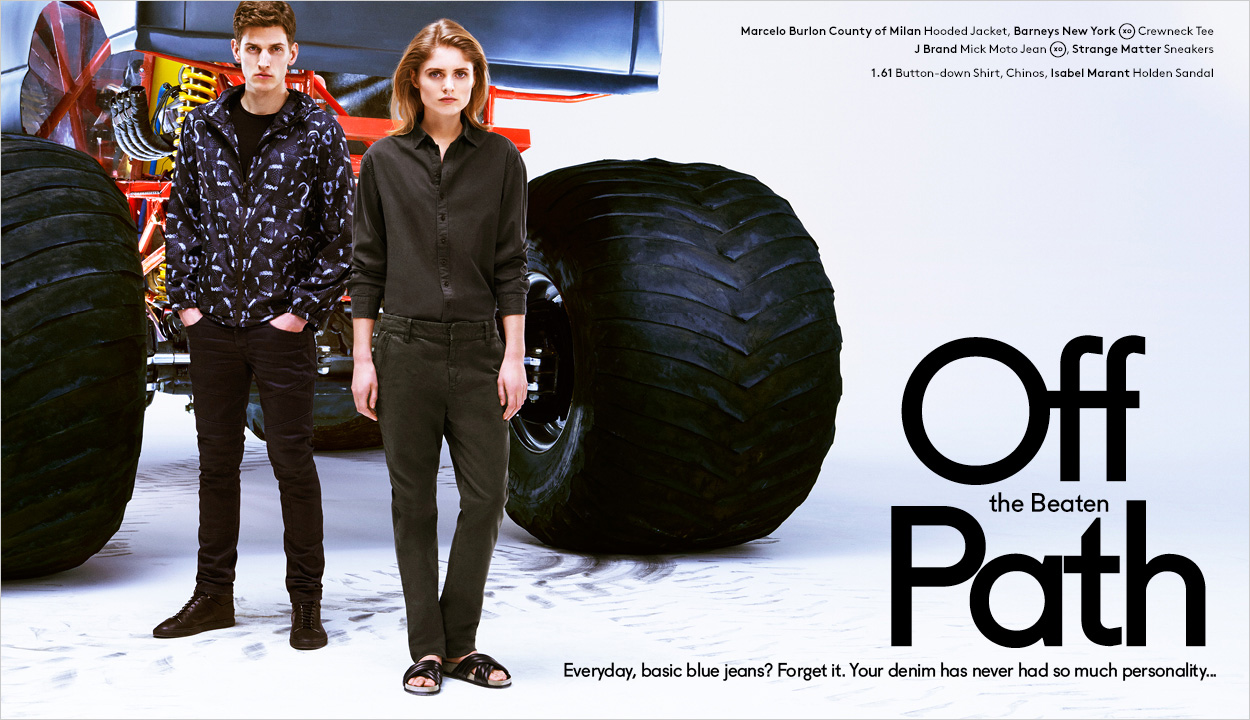 Off the Beaten Path–Model Andre Feulner skips the same boring old blue jeans in a quest for the latest denim styles from Barneys New York. For a site lookbook feature, Andre is enlisted to wear comfortable fashions that incorporate the latest hues and treatments for the classic standby. Paired with t-shirts and lightweight jackets, Andre is pictured in denim from Acne, J Brand and more.
