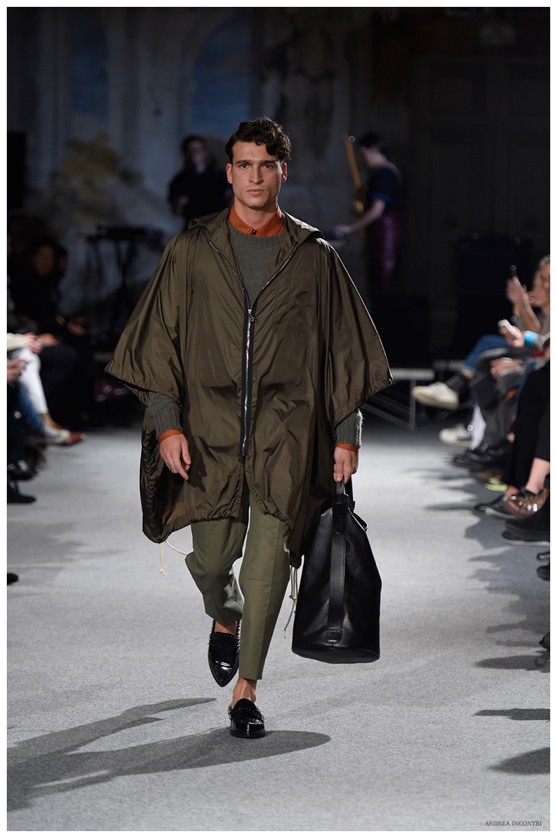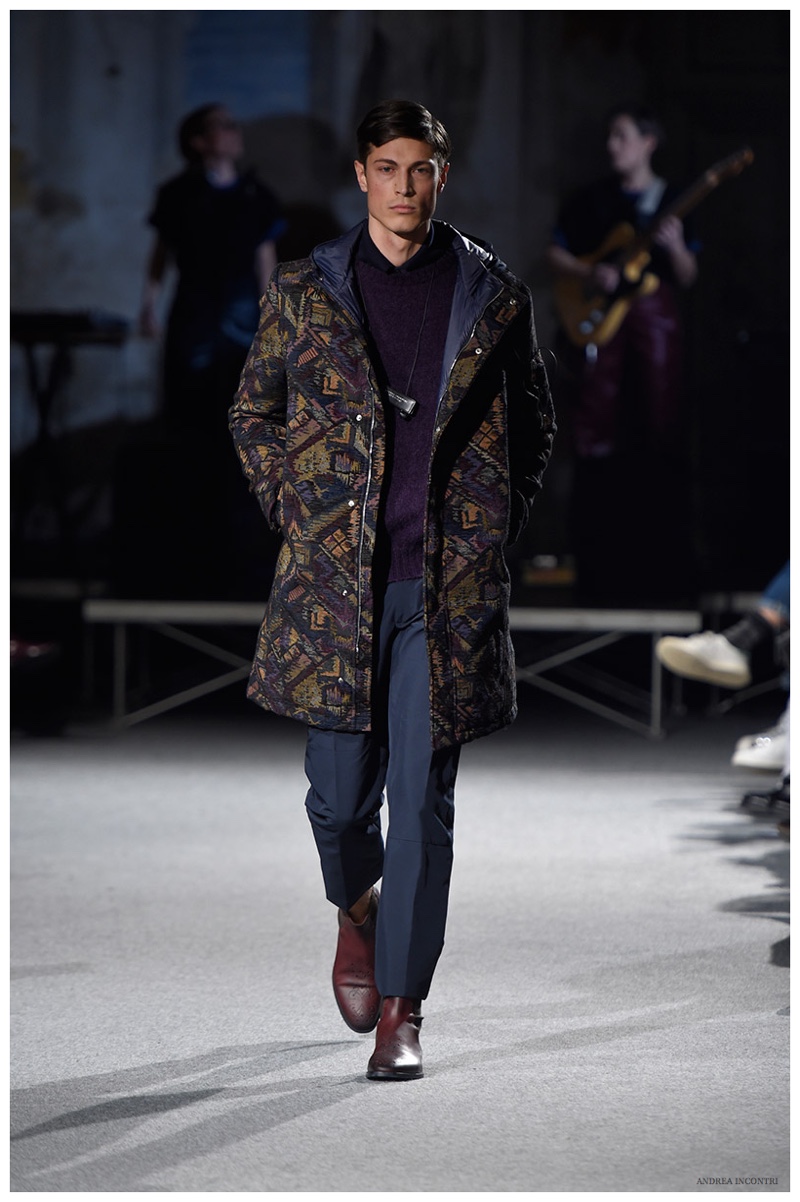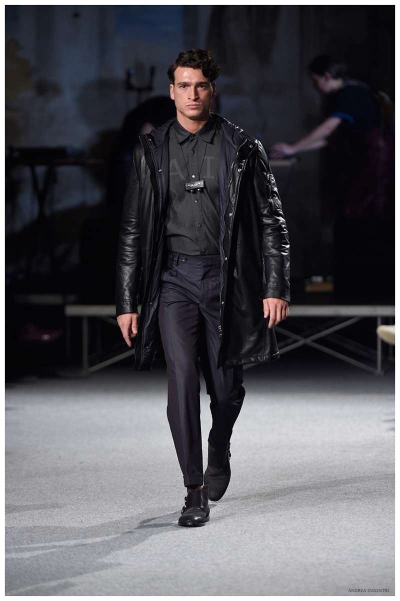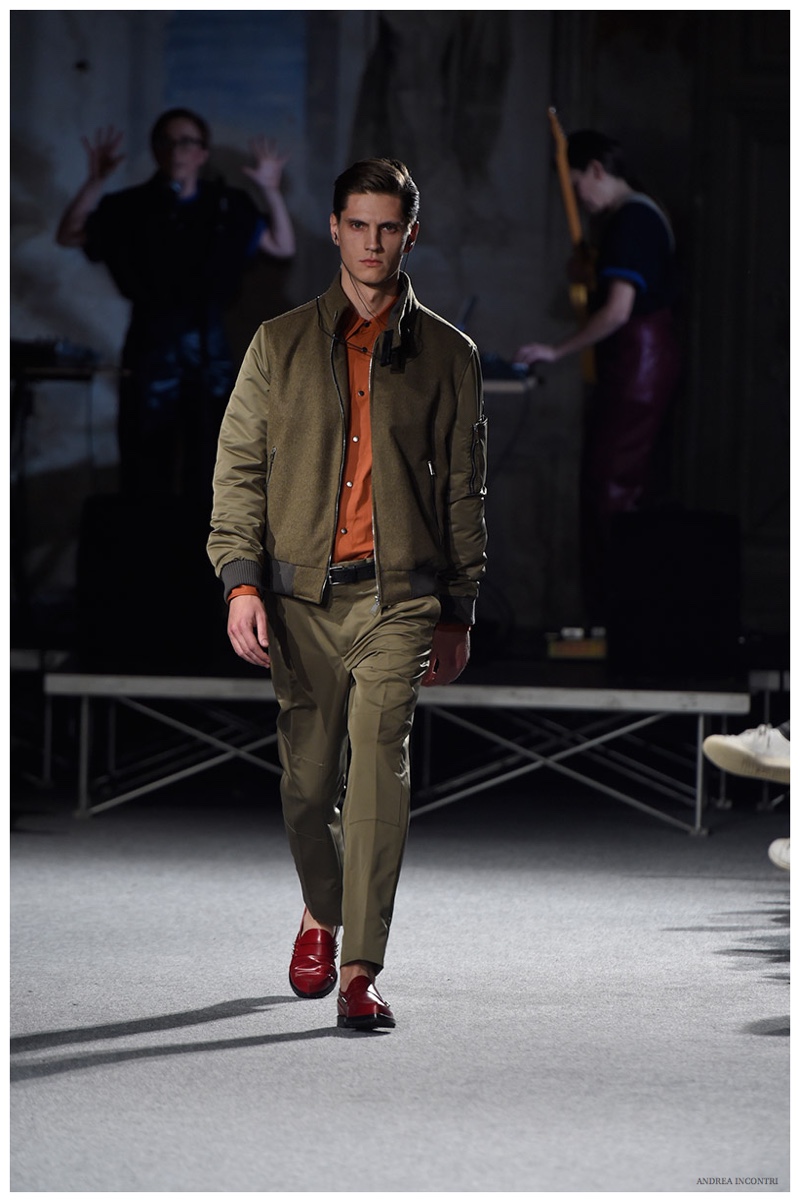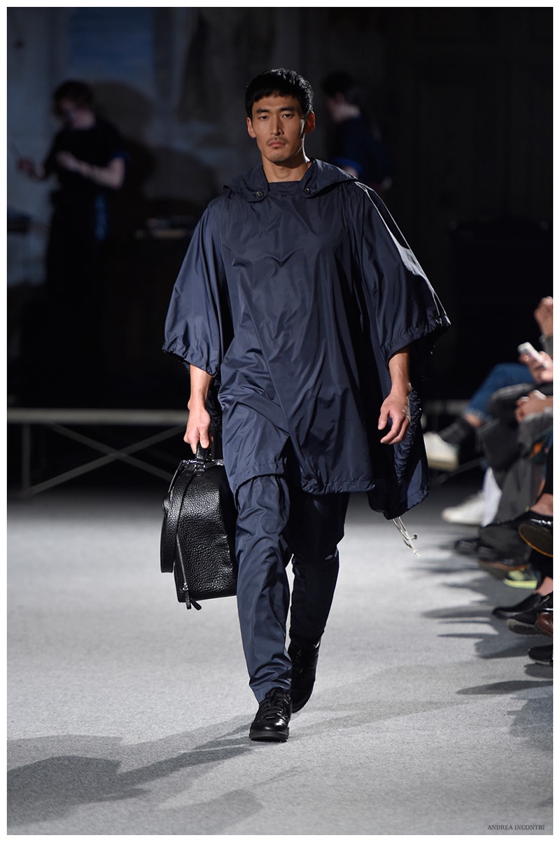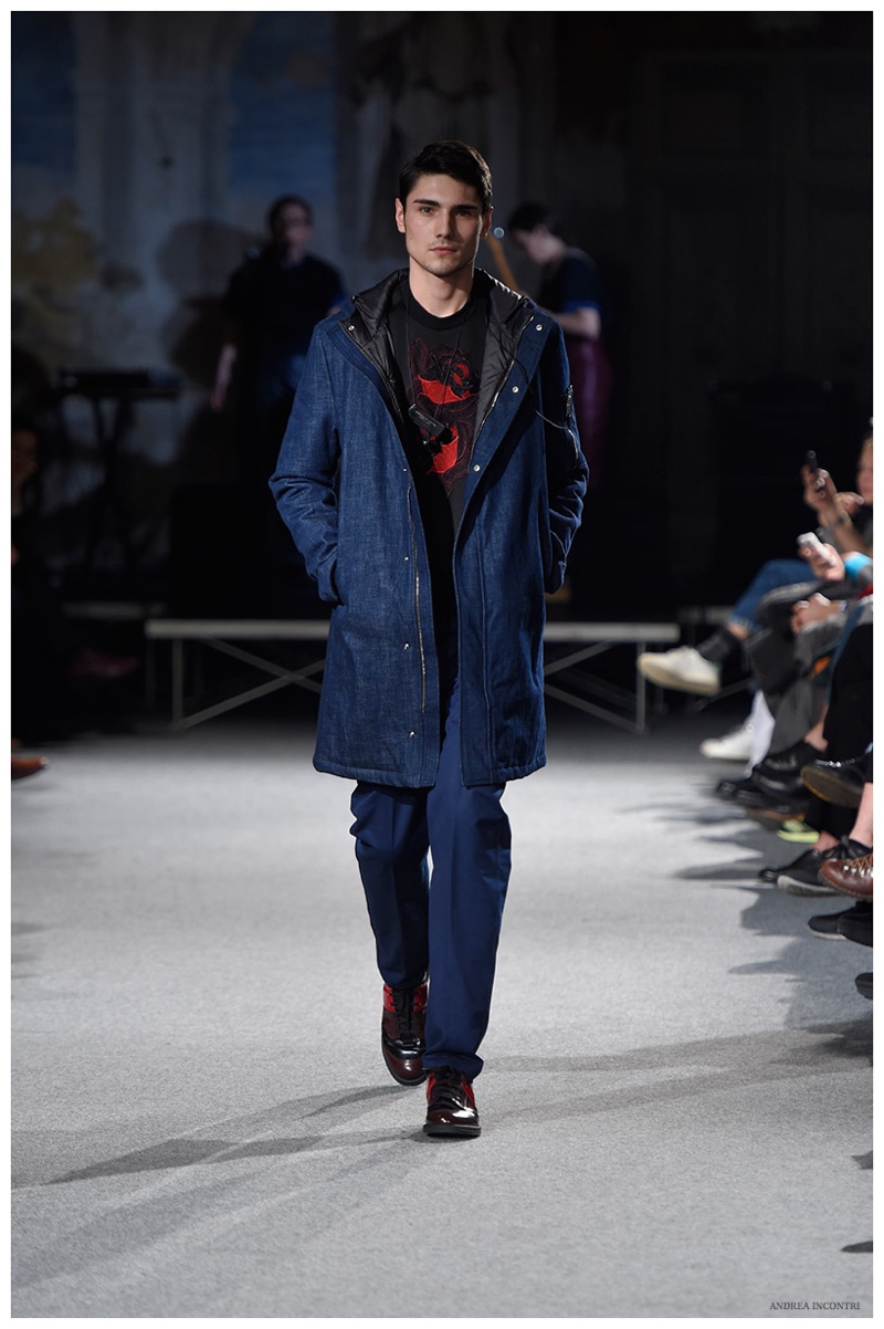 One of the latest brands to show during Pitti Uomo in Florence, Italy, Andrea Incontri unveiled a smart fall-winter 2015 collection. Combining the elegance of timeless tailoring with a modern mix of separates for the man of style on the go, the brand delivered one effortless ensemble after the next. Culminating in a lineup of nylon ponchos, Andrea Incontri’s fall collection relied on wearable fashions for the present. Denim jackets and coats appeared alongside a contemporary bomber jacket offering, while simple shirts and knitwear complemented slim-cut, technical pants that brought the season’s looks together.