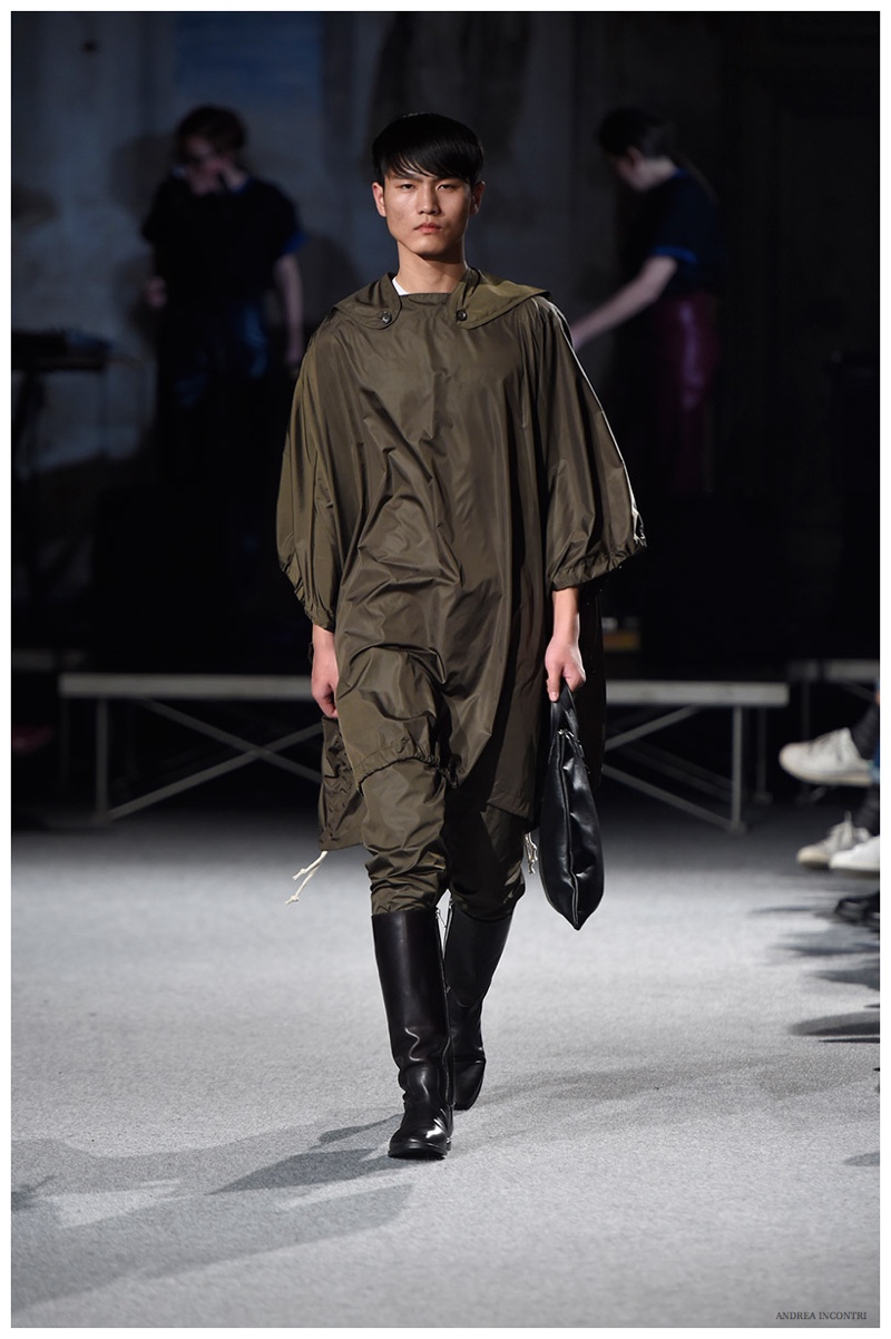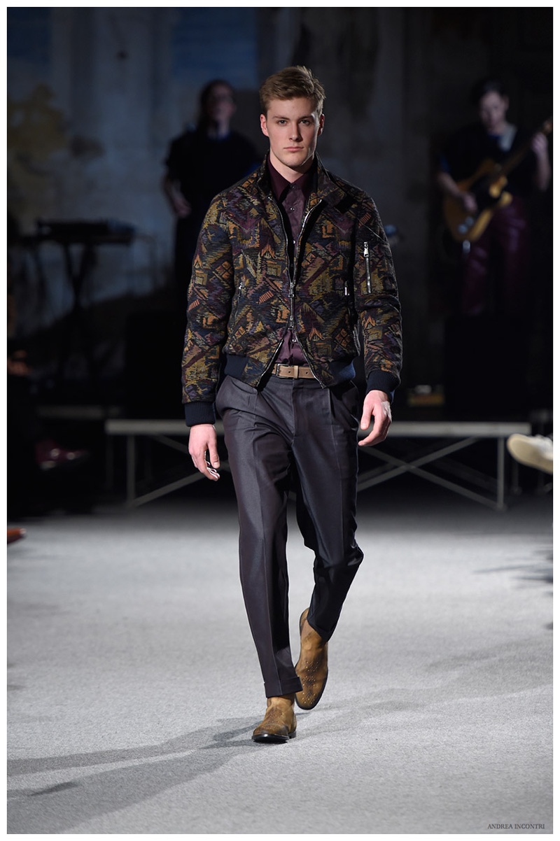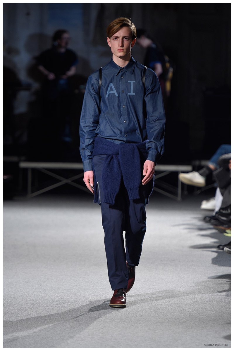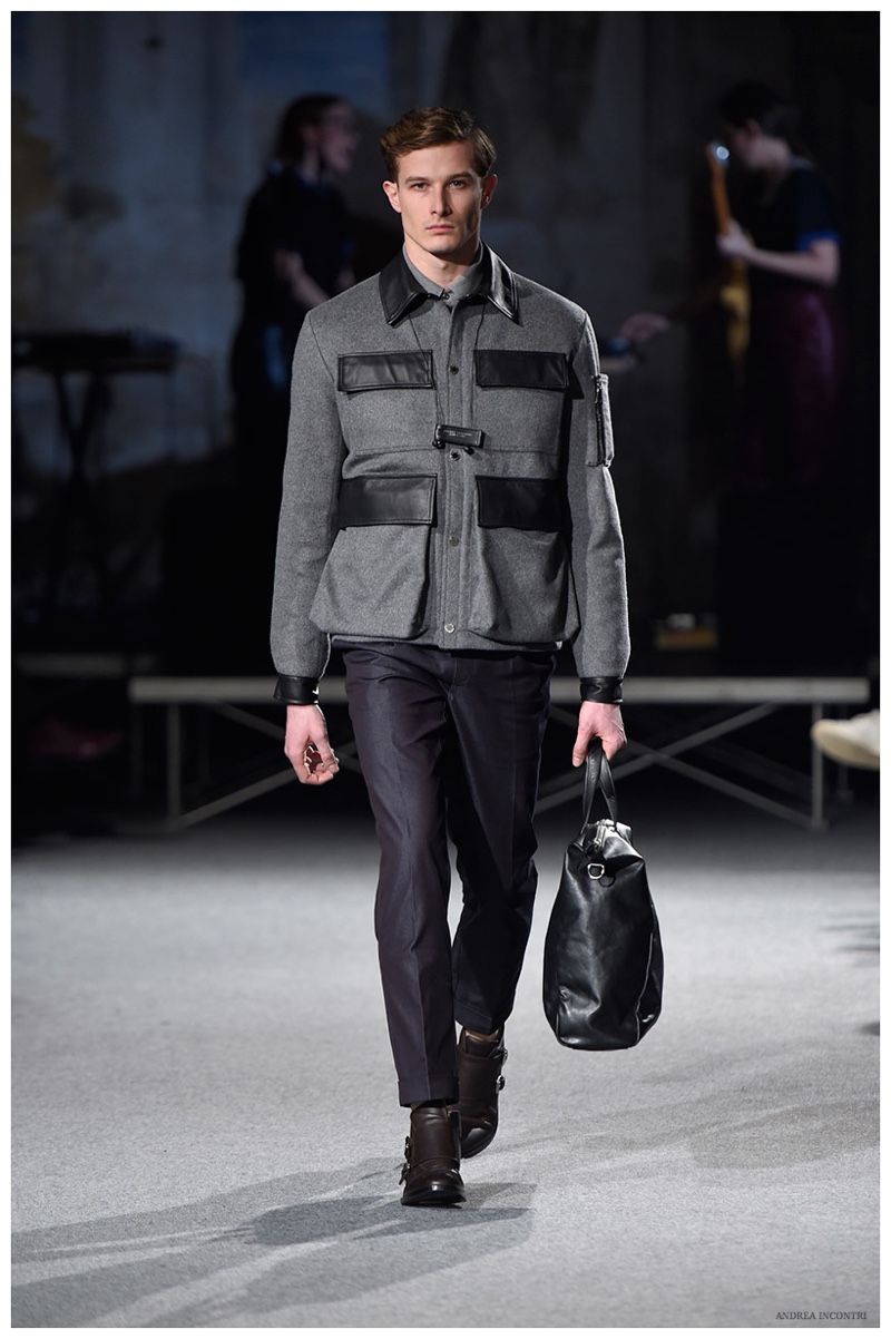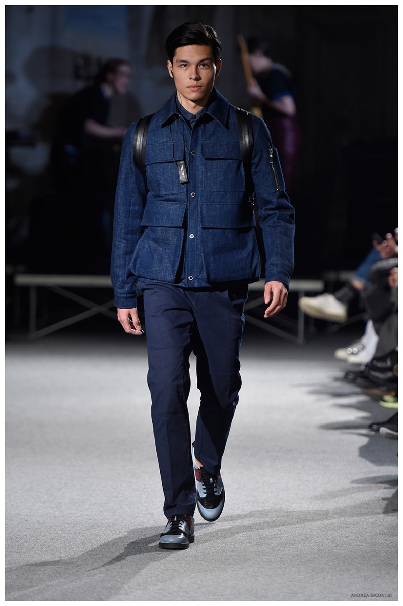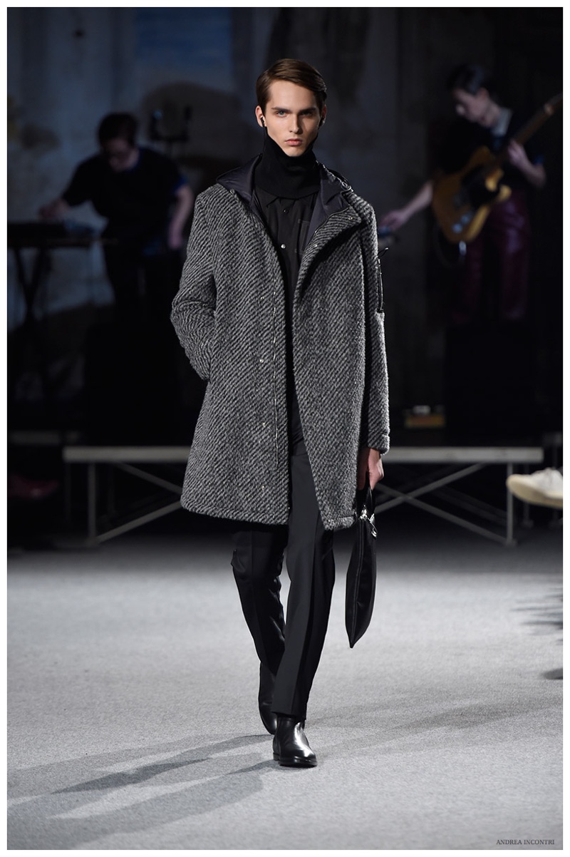 One of the latest brands to show during Pitti Uomo in Florence, Italy, Andrea Incontri unveiled a smart fall-winter 2015 collection. Combining the elegance of timeless tailoring with a modern mix of separates for the man of style on the go, the brand delivered one effortless ensemble after the next. Culminating in a lineup of nylon ponchos, Andrea Incontri’s fall collection relied on wearable fashions for the present. Denim jackets and coats appeared alongside a contemporary bomber jacket offering, while simple shirts and knitwear complemented slim-cut, technical pants that brought the season’s looks together.