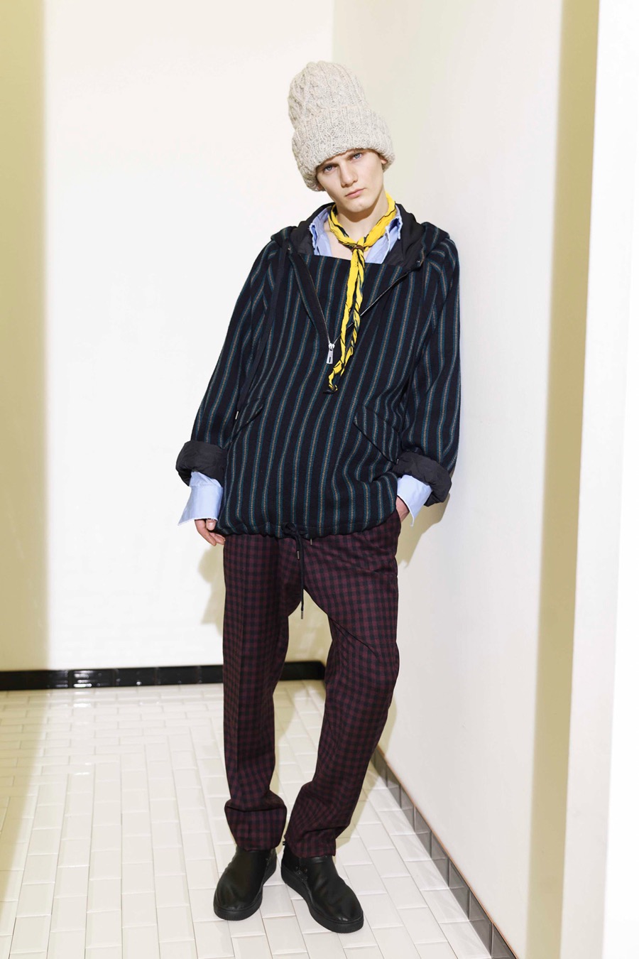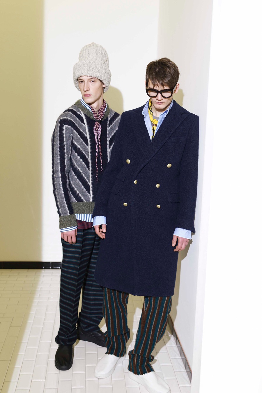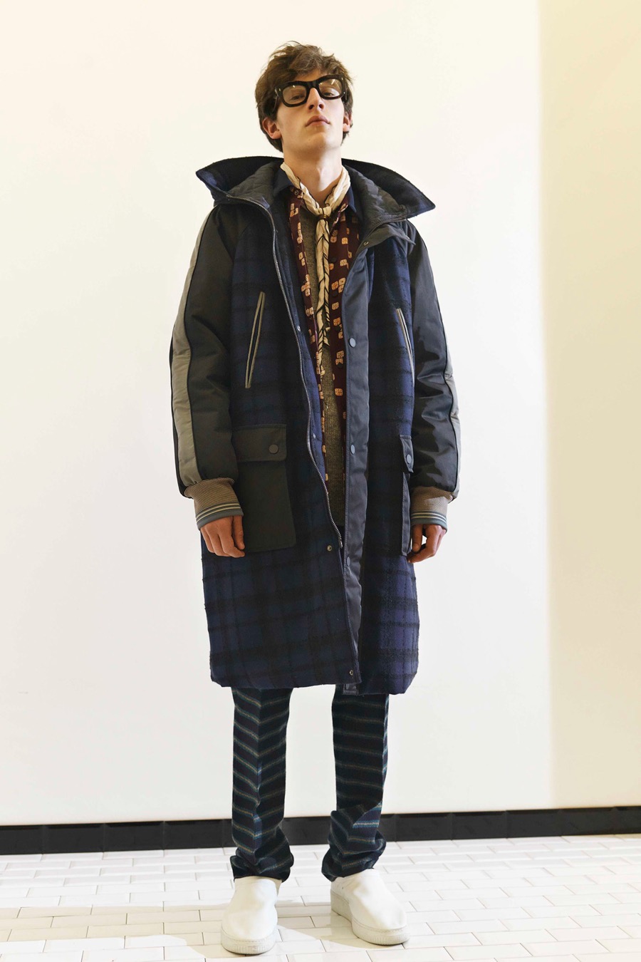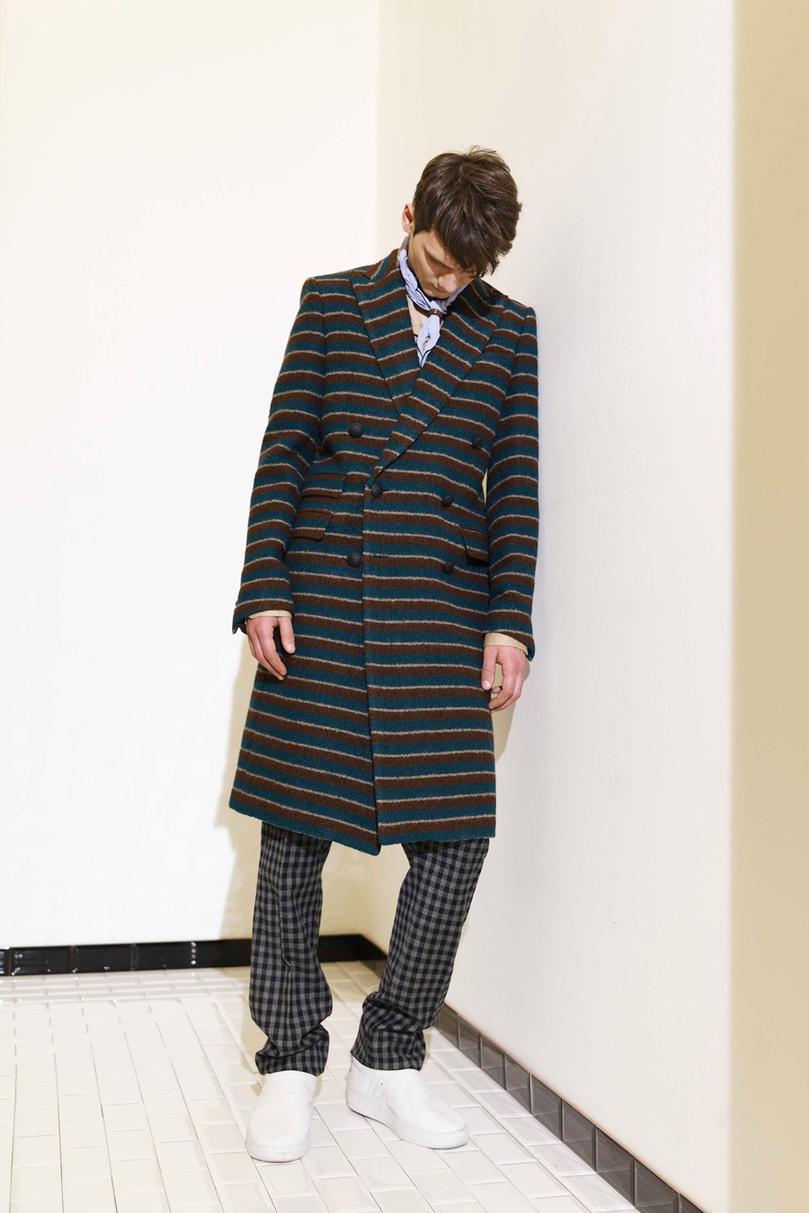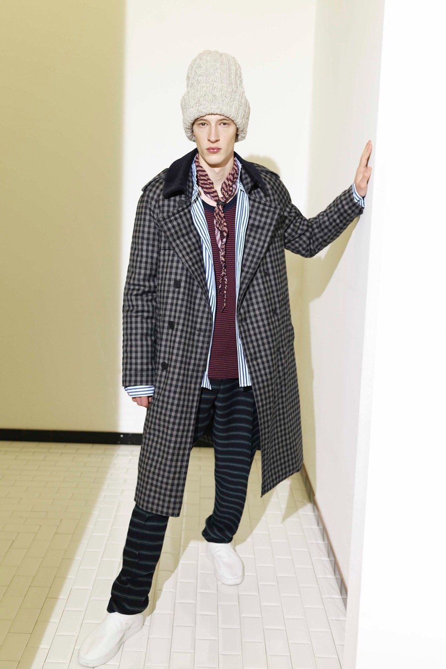 Bold prints and relaxed silhouettes are on the style agenda for Andrea Pompilio’s fall-winter 2016 collection. Pompilio injects the season with a youthful fun, mixing patterns and strong colors. Layering a generous number of covetable pieces, the designer’s wardrobe includes baggy denim jeans, striped trousers, oversized parkas, elongated jumpers and graphic overcoats. In addition to playful splashes of stripes and a renewed, trendy focus on plaid, Pompilio has a military moment. The officer’s coat and a double-breasted jacket contribute to the collection’s navy standouts.