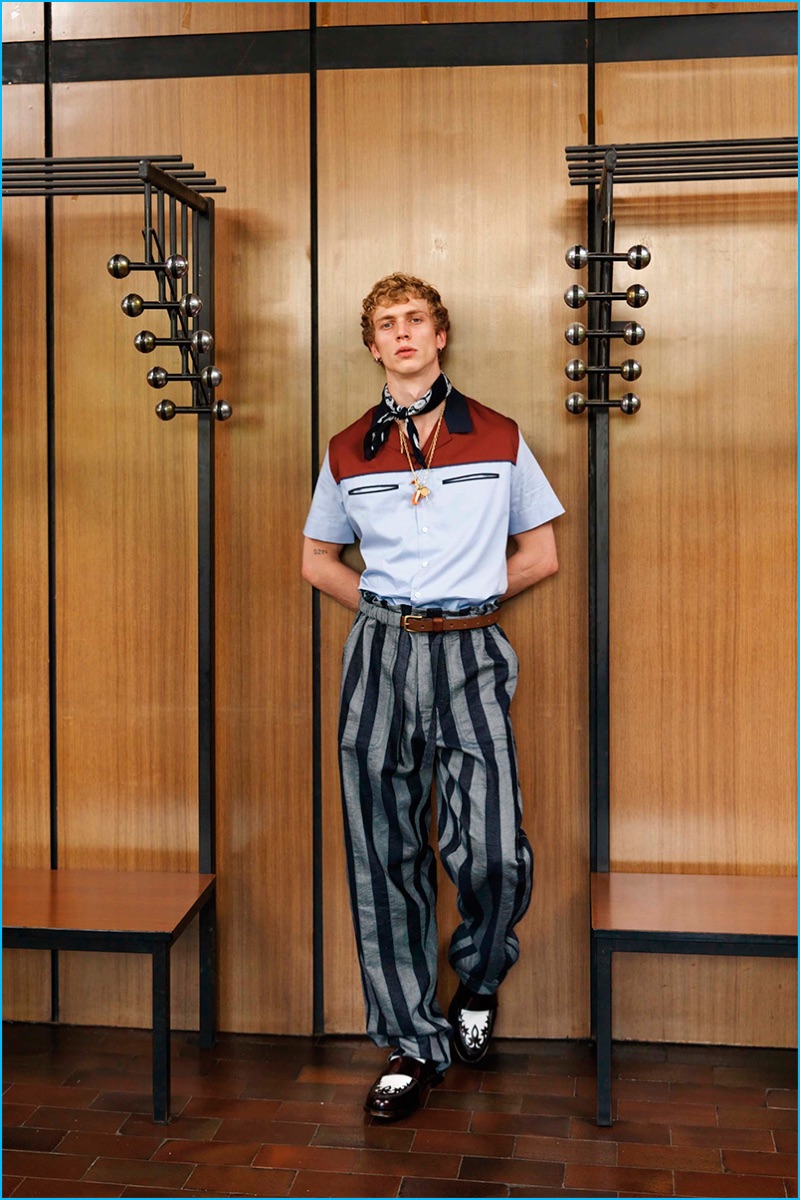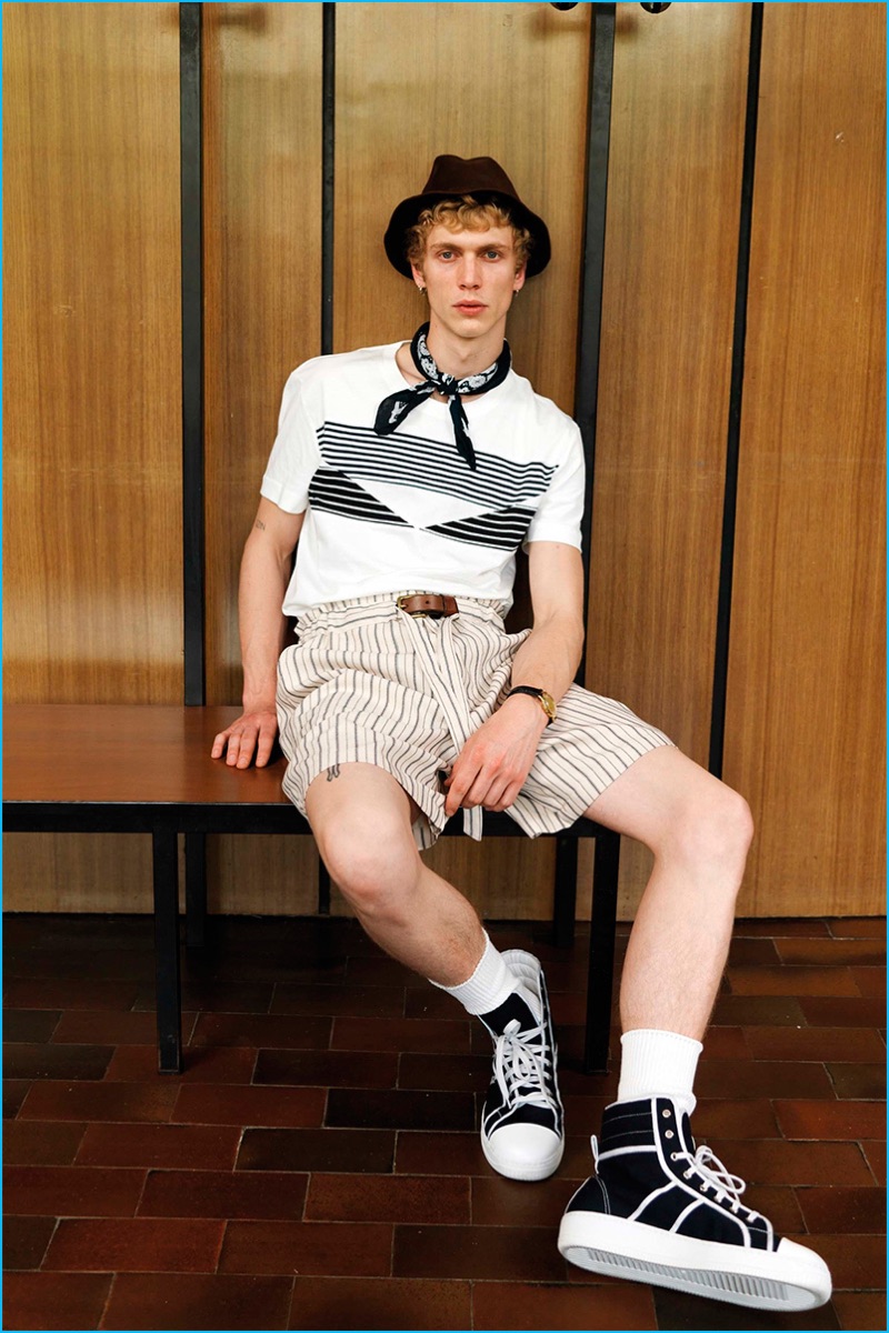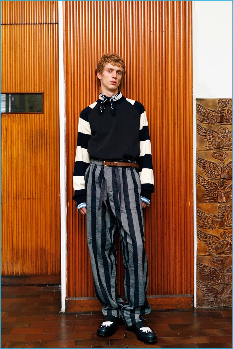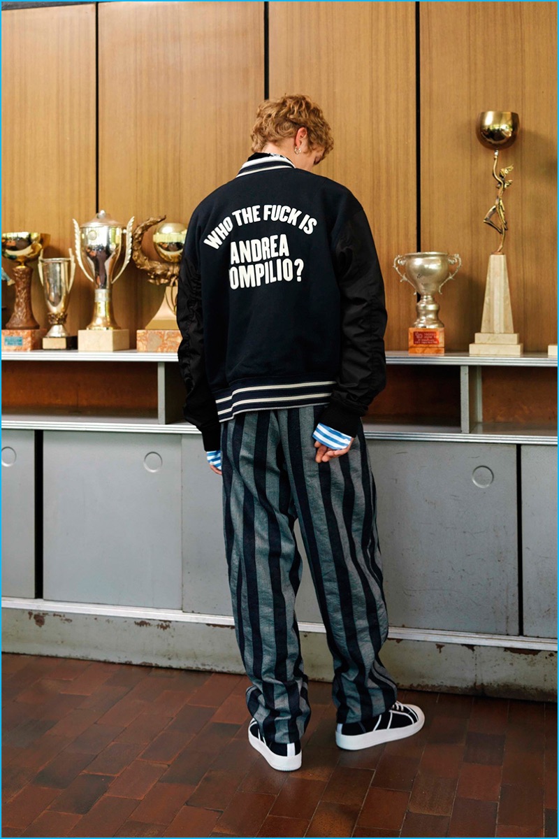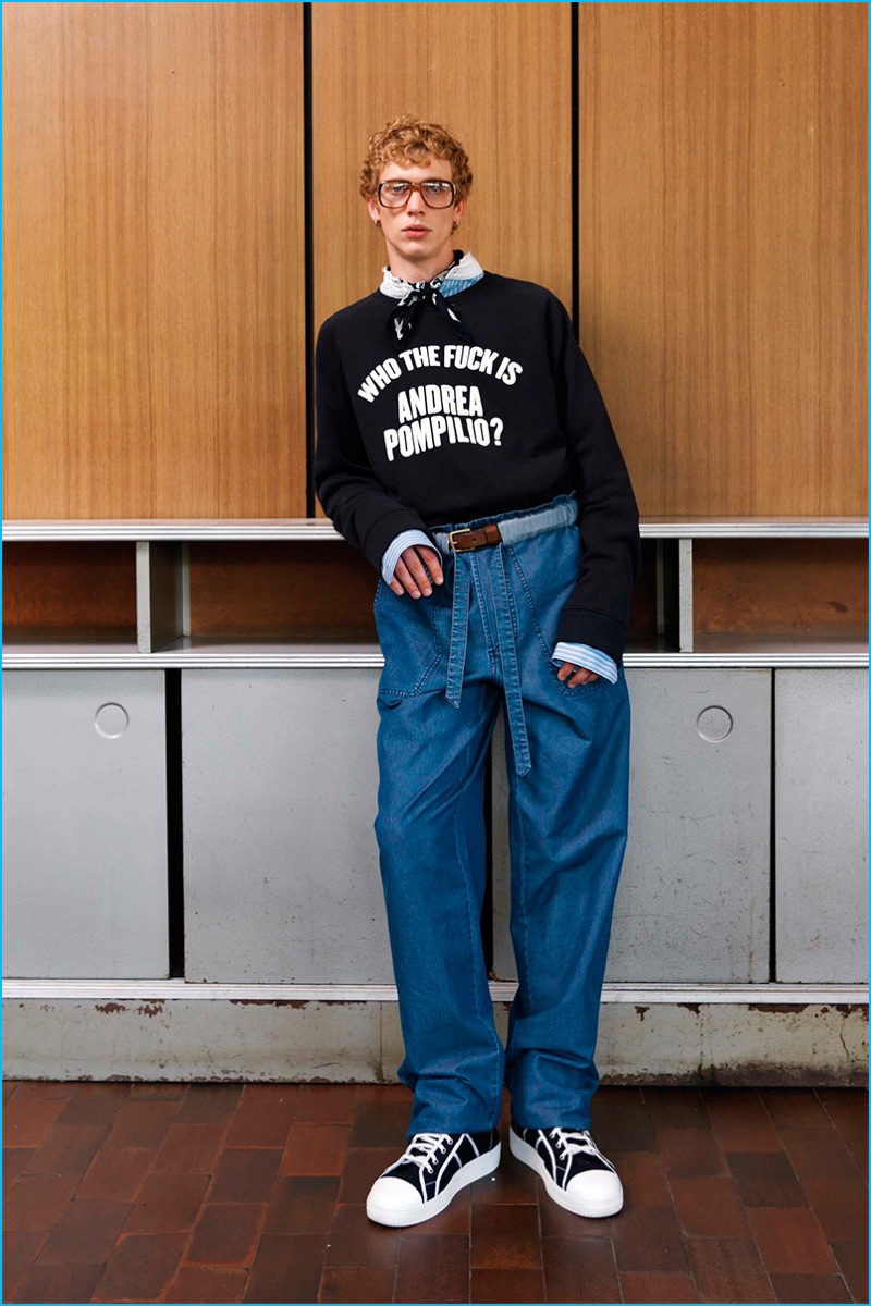 Andrea Pompilio revisits his first trip to New York City in the late 90s for the inspiration of his spring-summer 2017 collection. Relaxed proportions are key to the range with an eclectic mixing of patterns. Vertical and horizontal stripes are juxtaposed for a playful attitude. Slouchy knits, paper bag waist pants, Cuban collared shirts, track jackets and wide-cut denim pants are in great abundance.