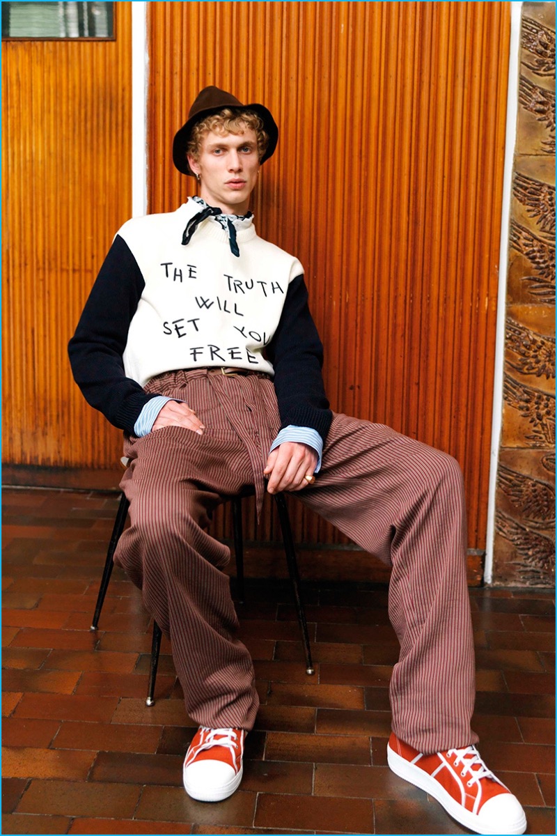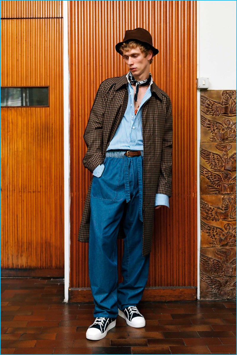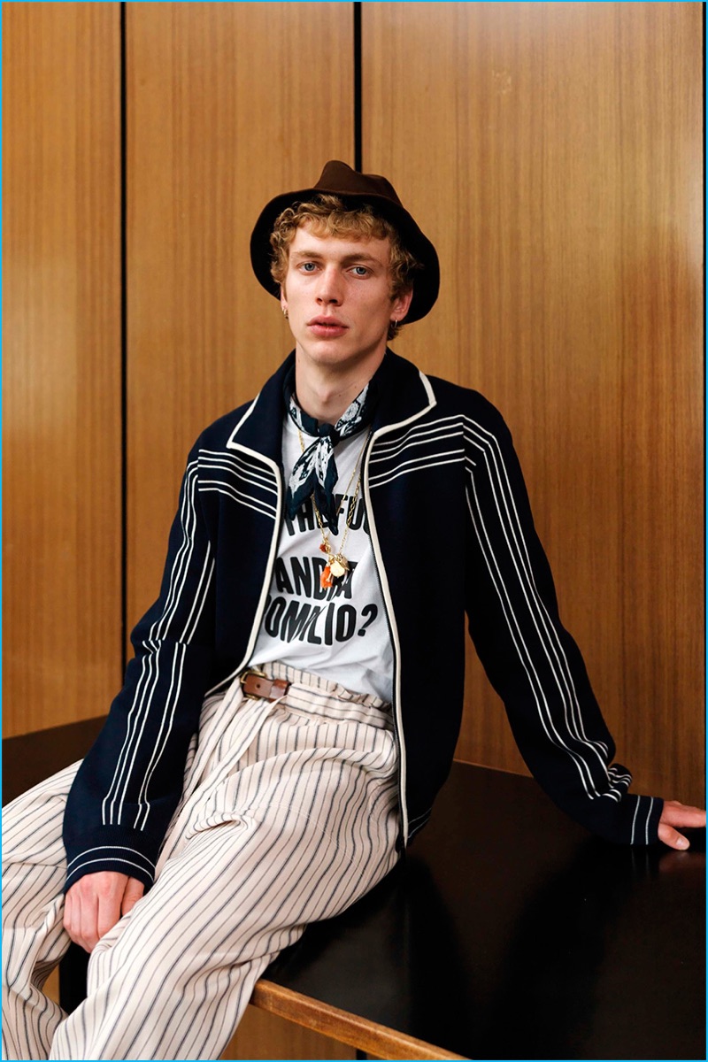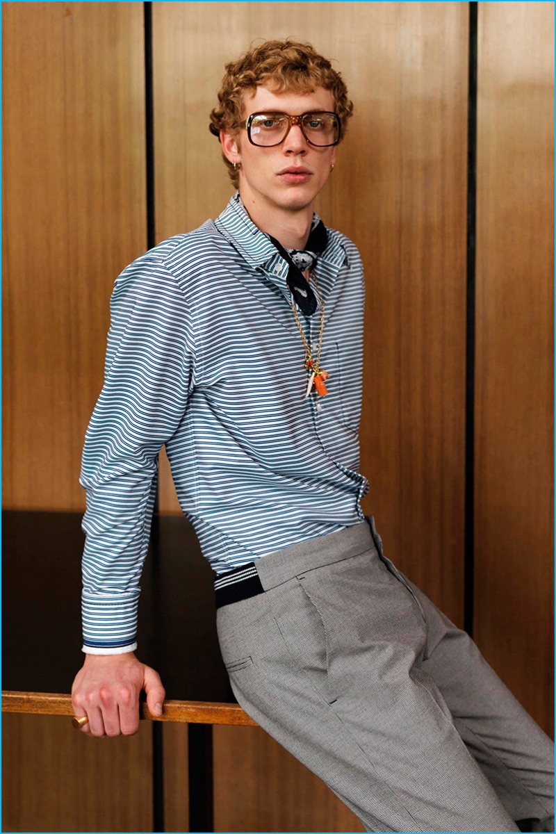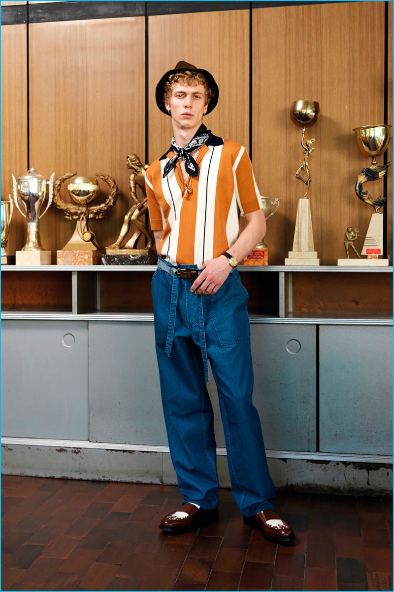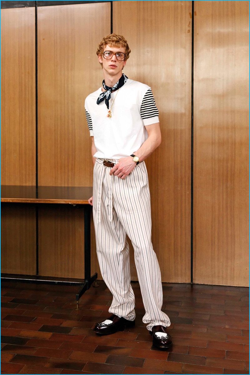 Andrea Pompilio revisits his first trip to New York City in the late 90s for the inspiration of his spring-summer 2017 collection. Relaxed proportions are key to the range with an eclectic mixing of patterns. Vertical and horizontal stripes are juxtaposed for a playful attitude. Slouchy knits, paper bag waist pants, Cuban collared shirts, track jackets and wide-cut denim pants are in great abundance.