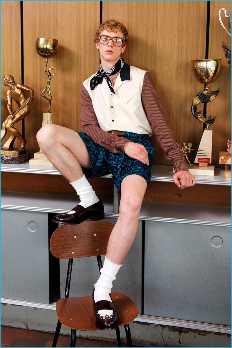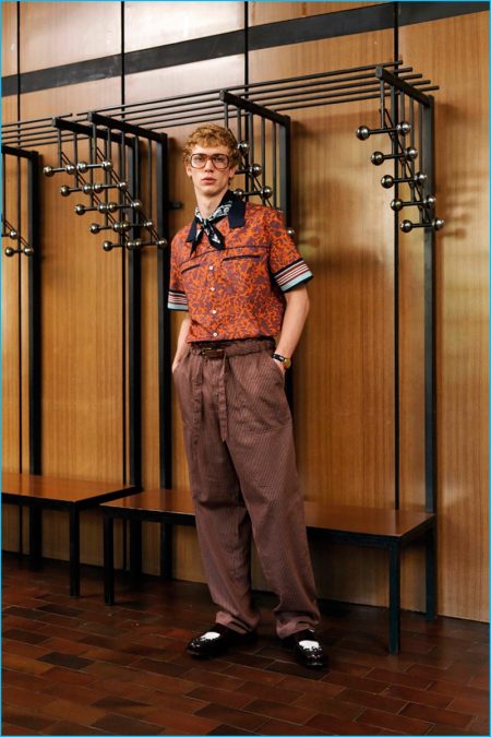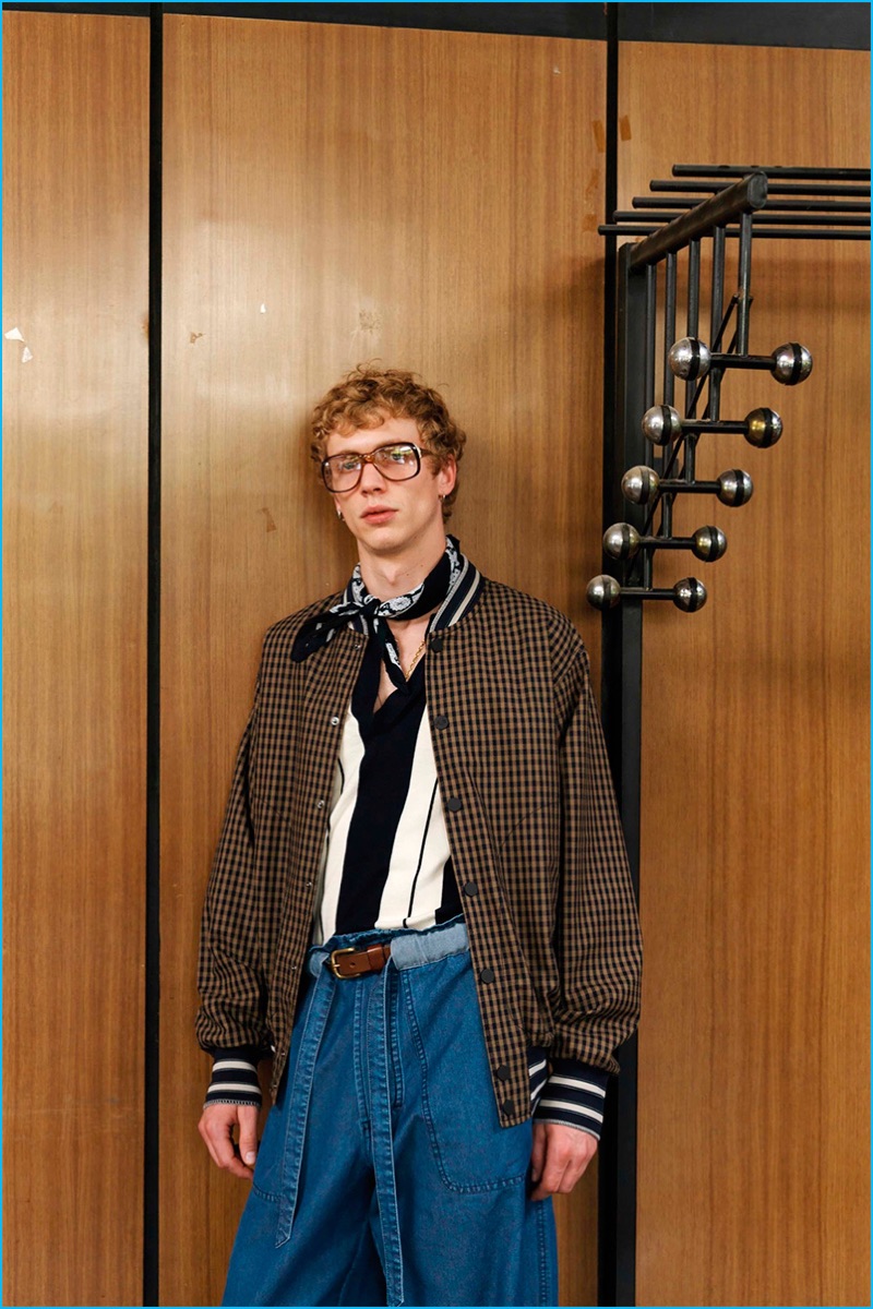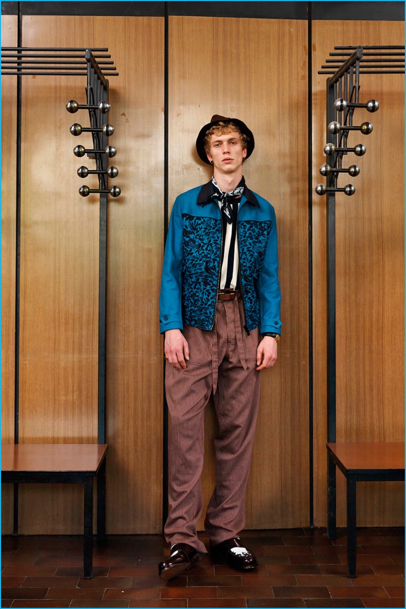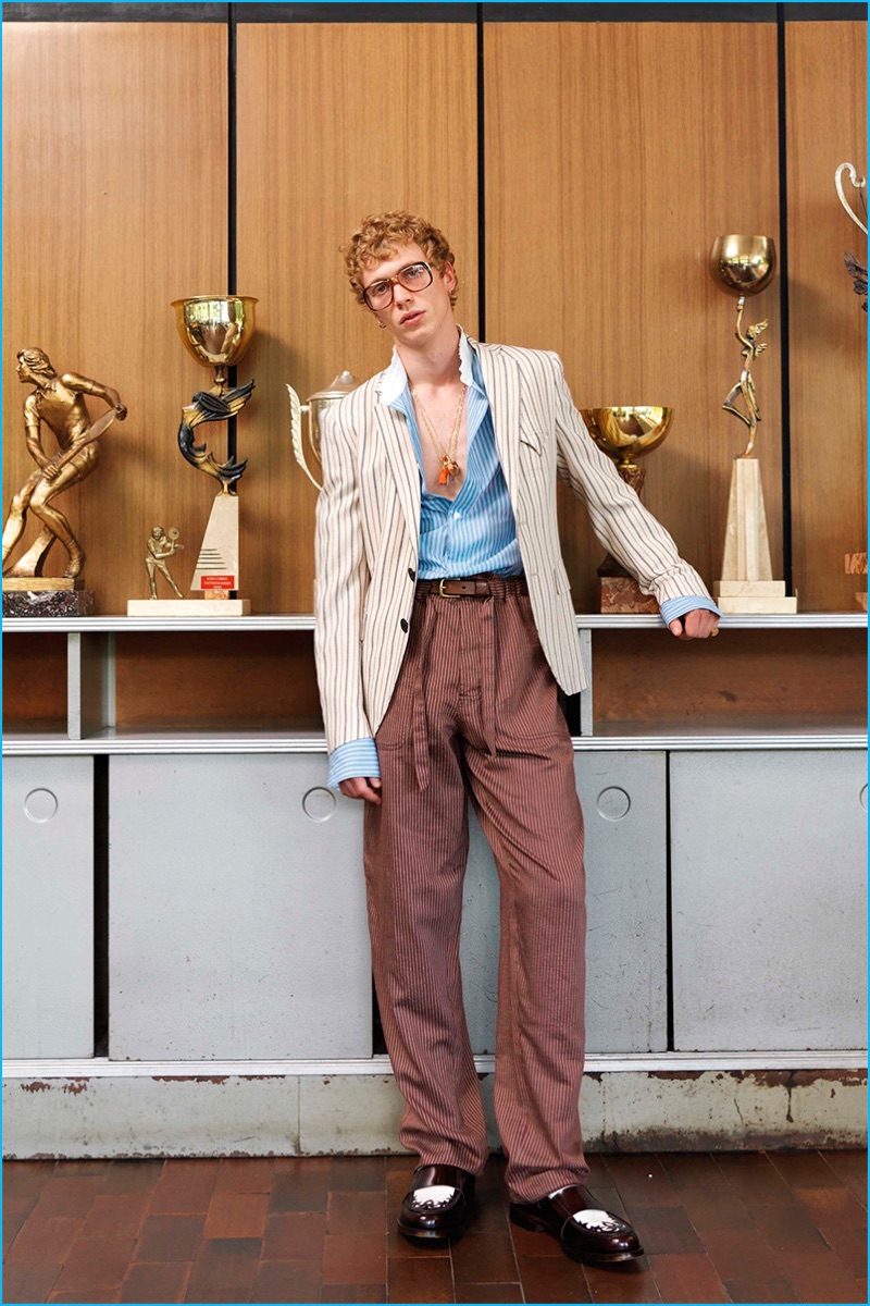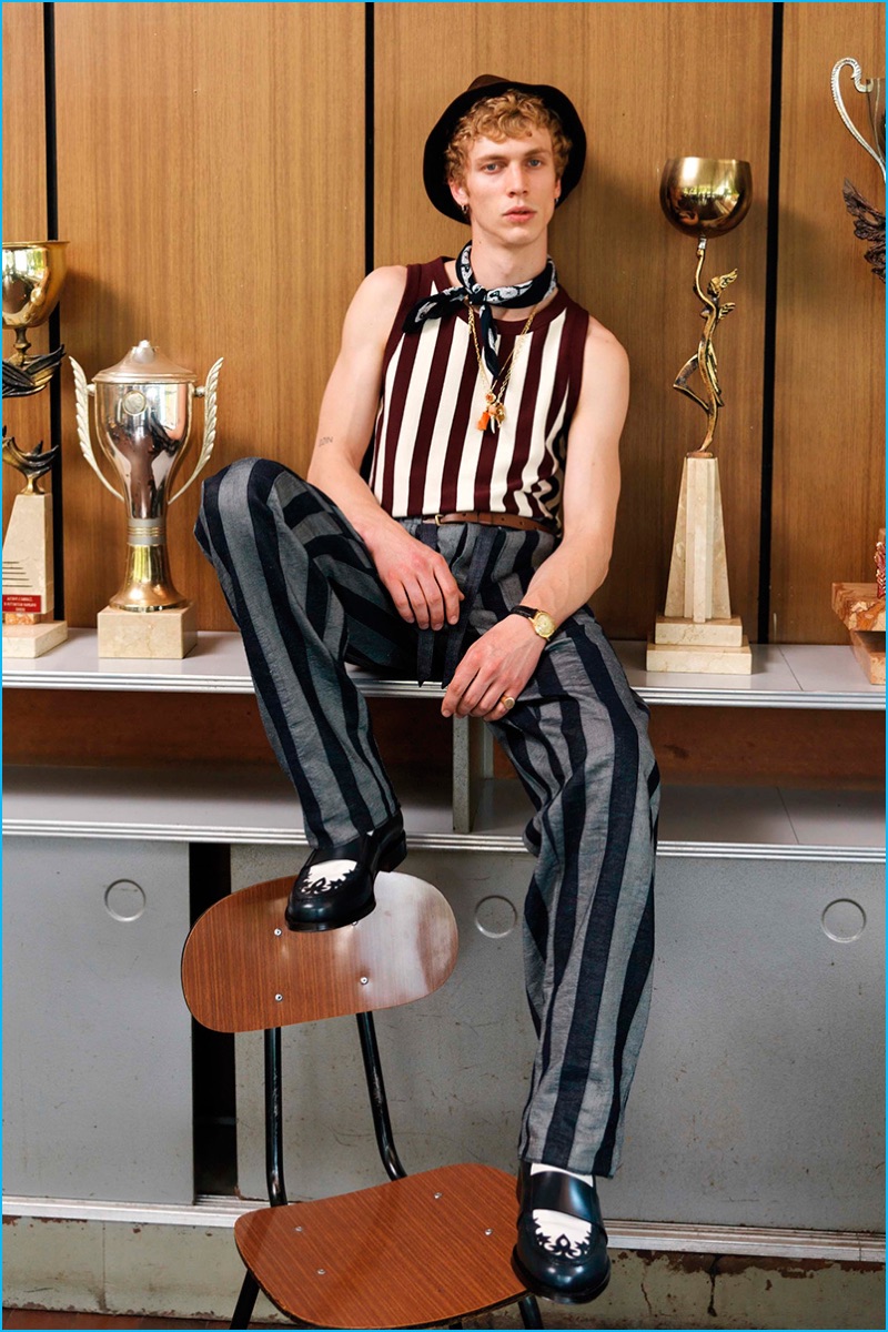 Andrea Pompilio revisits his first trip to New York City in the late 90s for the inspiration of his spring-summer 2017 collection. Relaxed proportions are key to the range with an eclectic mixing of patterns. Vertical and horizontal stripes are juxtaposed for a playful attitude. Slouchy knits, paper bag waist pants, Cuban collared shirts, track jackets and wide-cut denim pants are in great abundance.