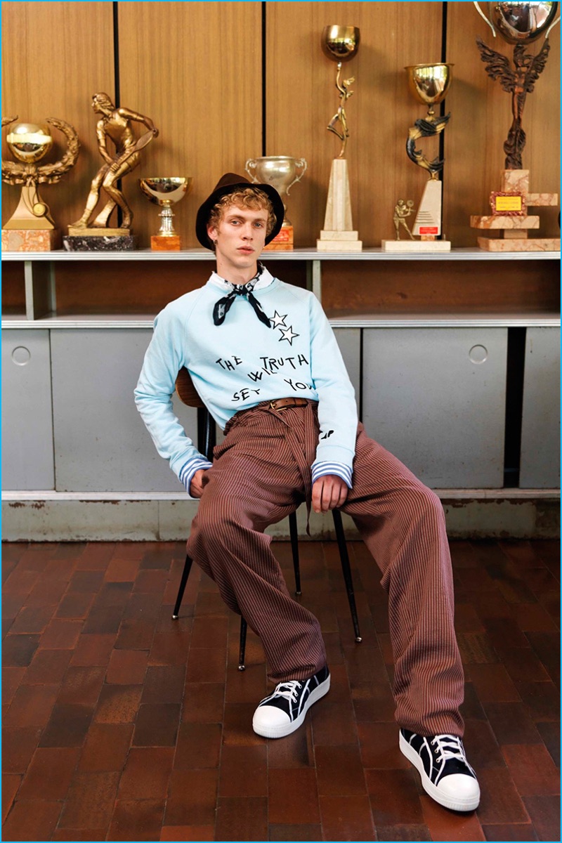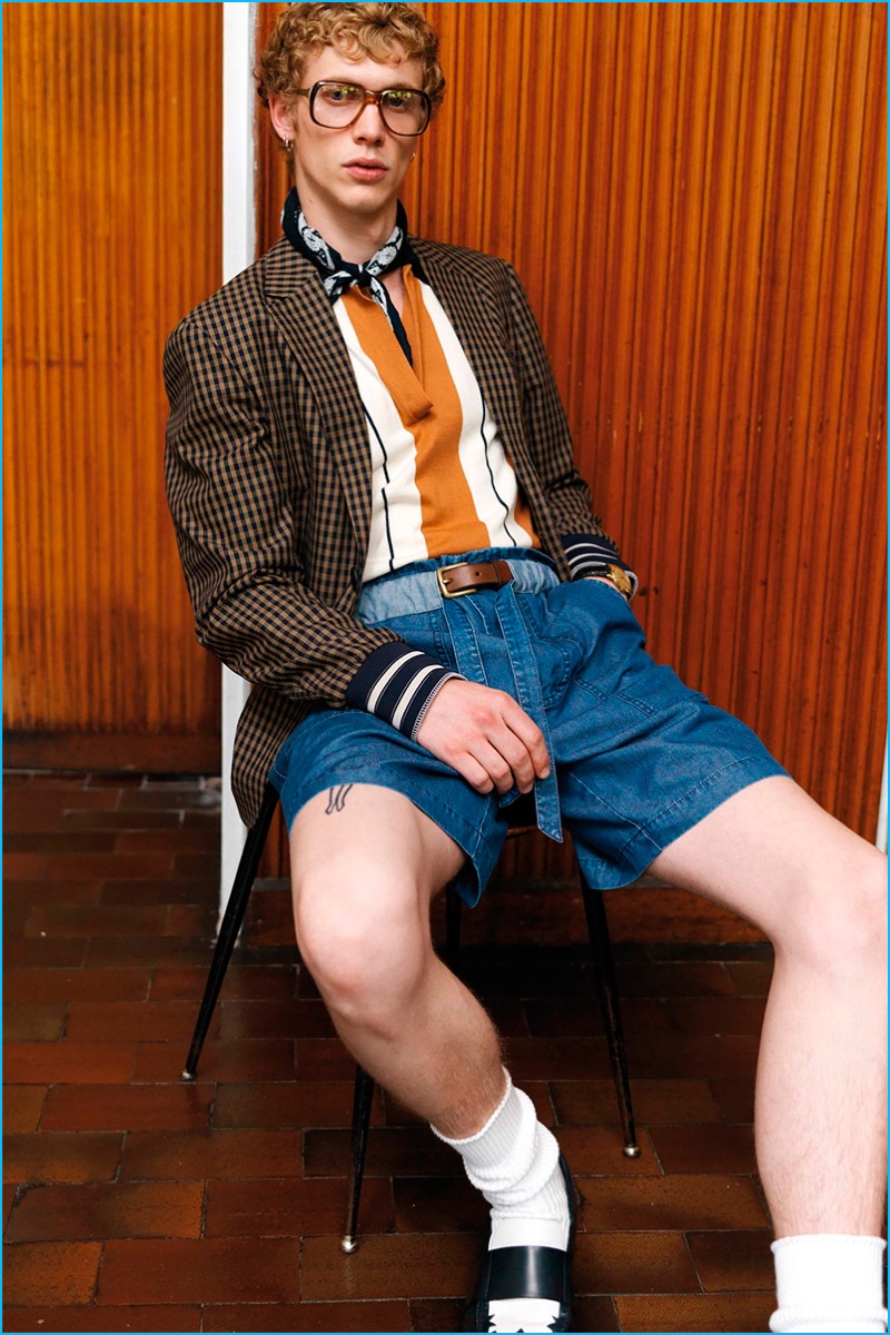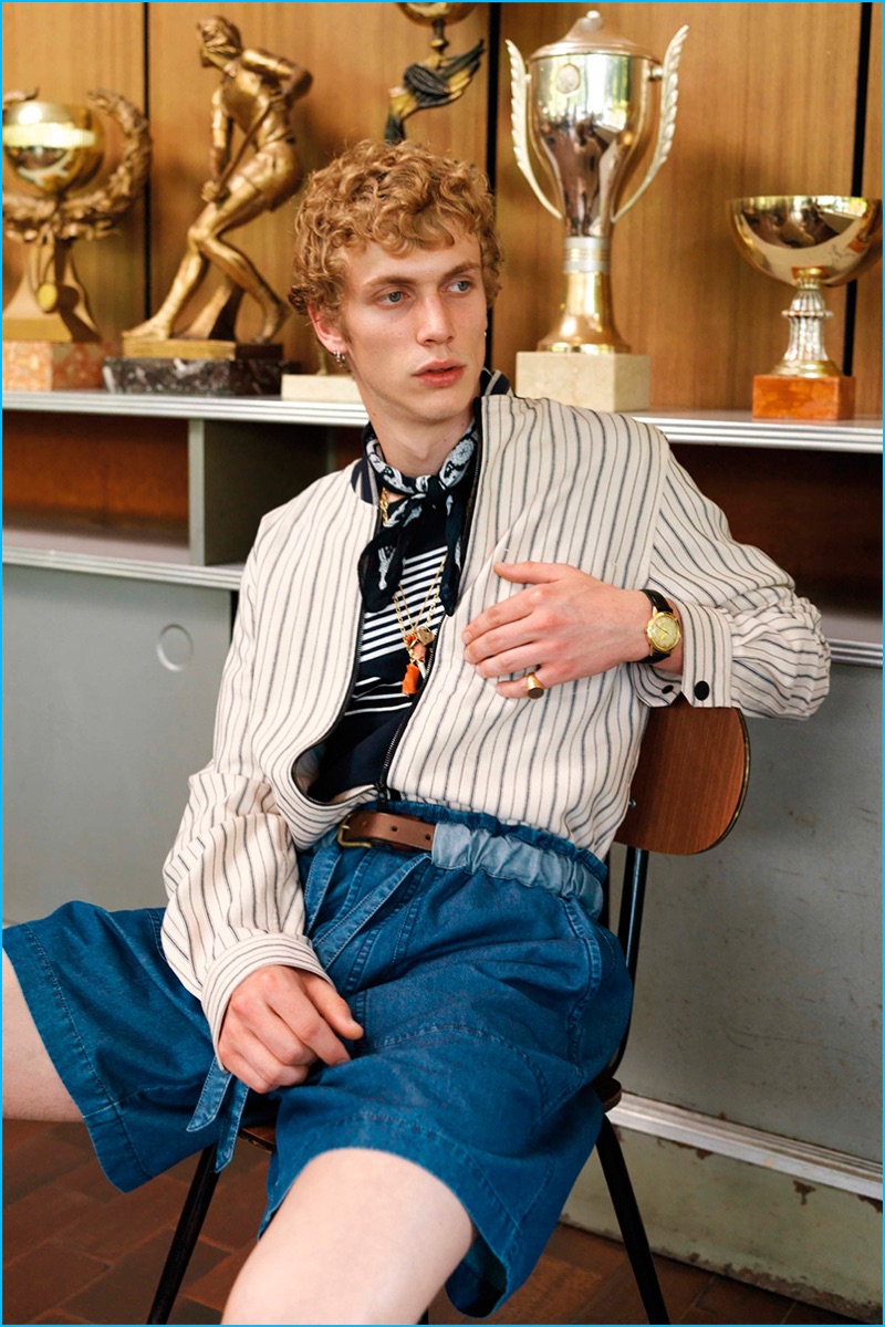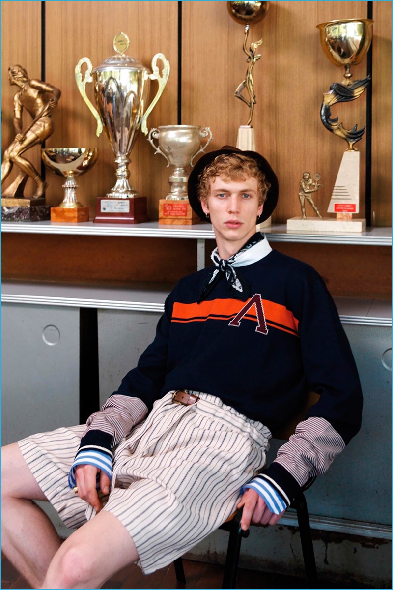 Mirroring the melting pot that is Manhattan, Pompilio mixes cheeky elements for spring. Sportcoats with oversized buttons and sweatshirts with slogans such as “Who the f**k is Andrea Pompilio?” come together for the occasion. Patterns are also remixed for fun separates that range from a colorful, multi-striped jumper to lightweight colorblocked jackets. Complementing striped oxford shirts and laid-back denim, Pompilo’s collection is rounded out by gingham outerwear.
