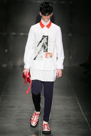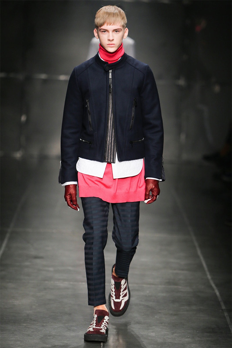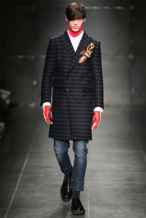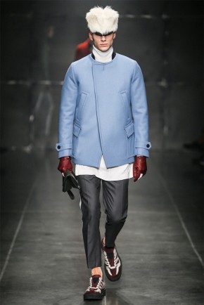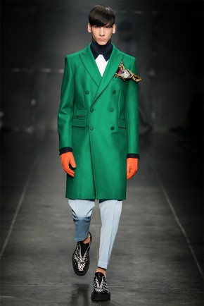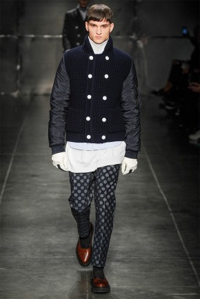 Andrea Pompilio Fall/Winter 2014–Injecting the season with great charm, designer Andrea Pompilio revealed a young sporty narrative for his fall/winter 2014 collection. Covered in polka dots and tonal stripes, cigarette-slim trousers and short jackets contributed to a triumphant uniform. Joining the marching band, gloves and hats finished off active oversized outerwear, band pants and loose elongated shirts. The awarding moment of the season came during the shows finale with rich embellishments completing the collection.
