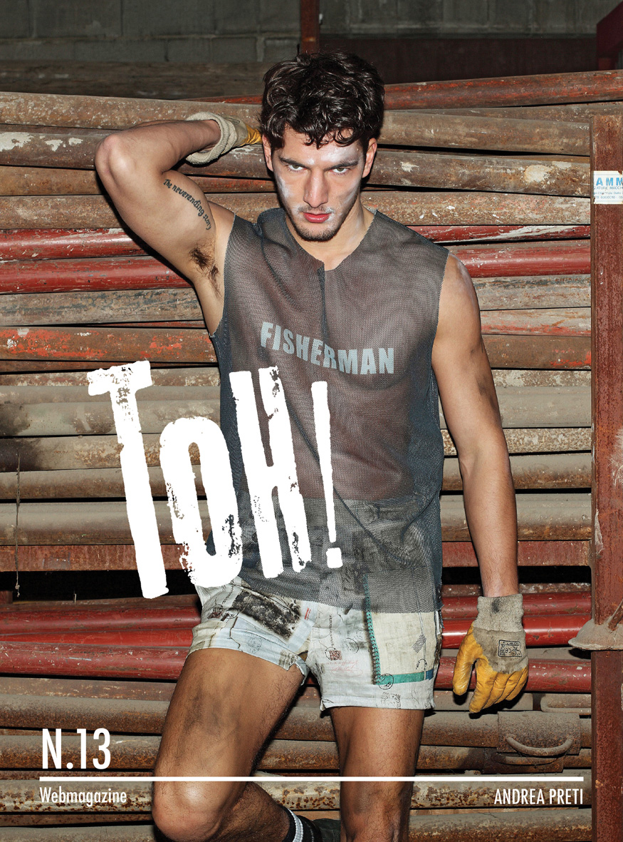 It’s A Tough Job–Captured by the lens of Simon for the cover of the last issue of TOH!, Italian model Andrea Preti is a vision of masculine strength and confidence, even covered with dust and oil. For the cover shot, stylist Alex Vaccani selects spring numbers that highlight Andrea’s charming silhouette, like Andrea Incontri’s see-through tank and Dolce & Gabbana’s printed shorts. / Grooming by Natasha La Piana.