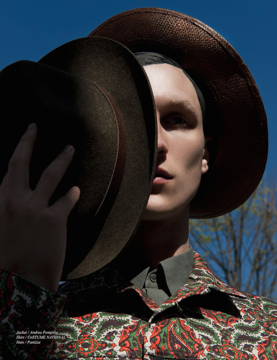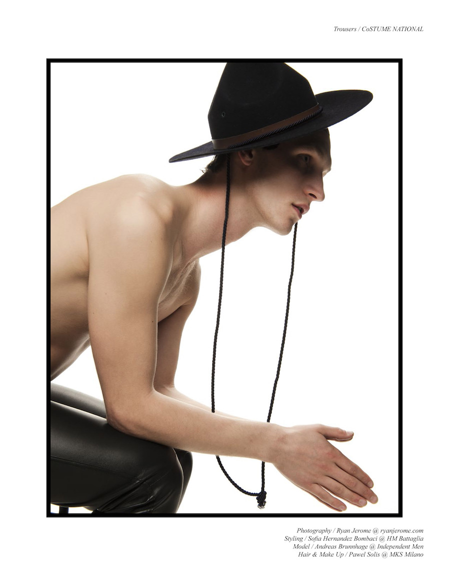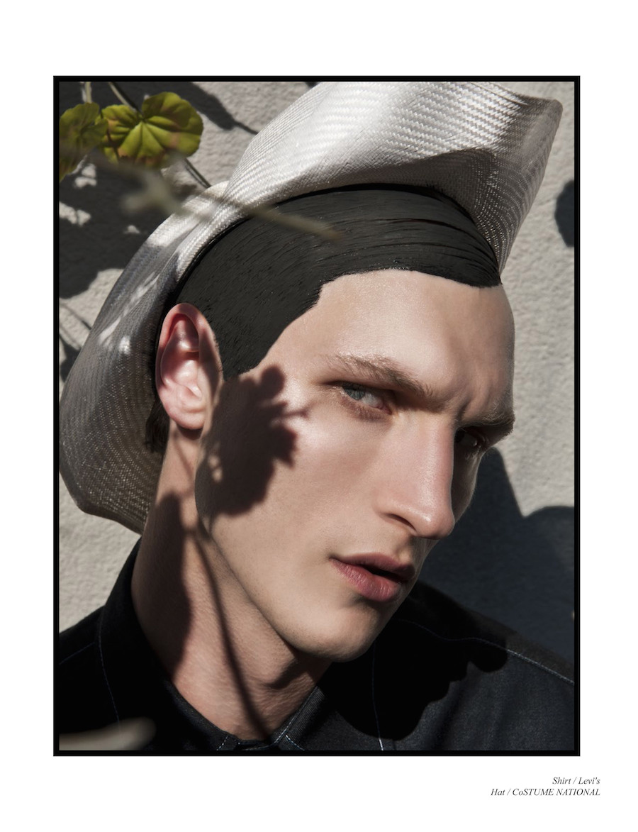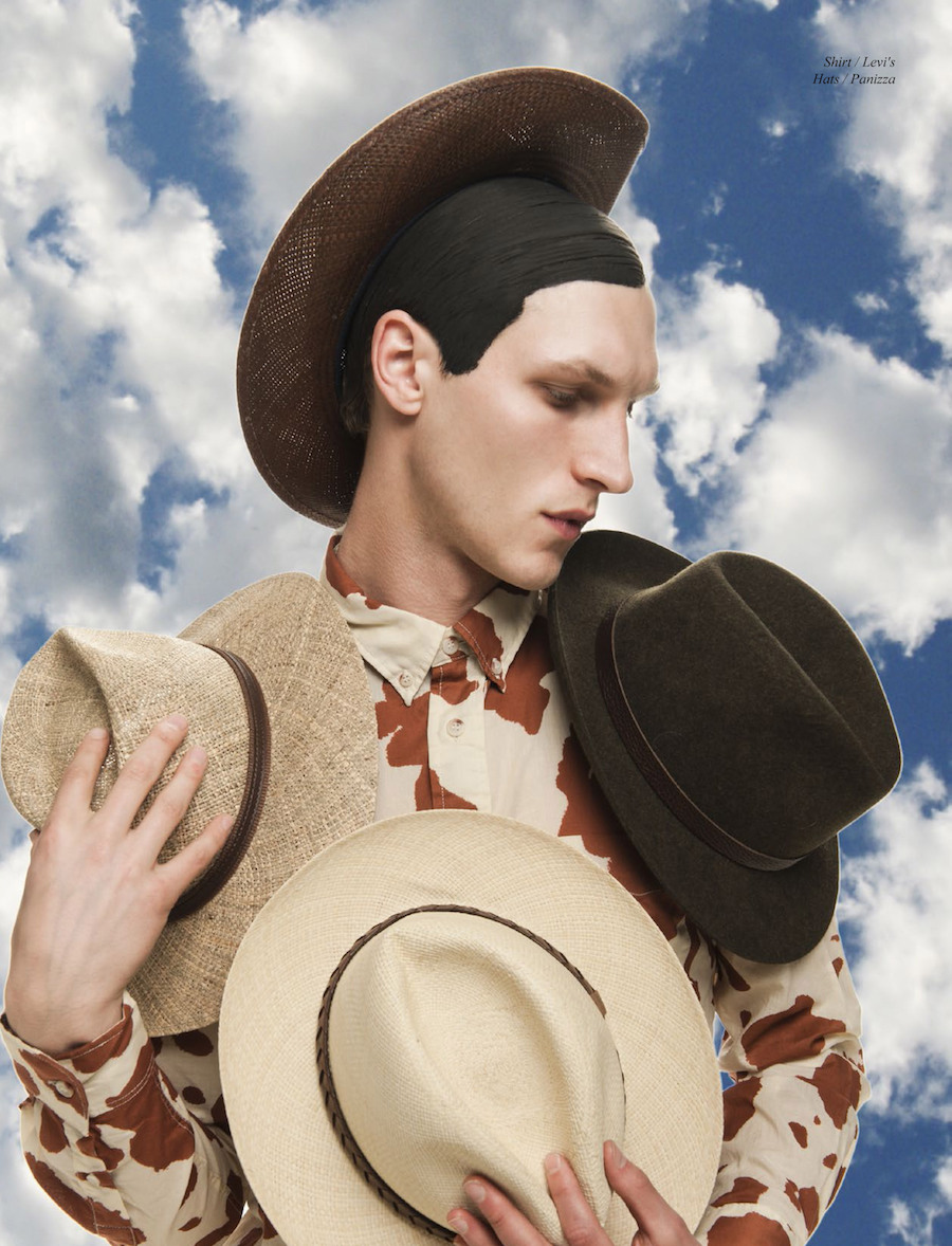 Hat Required–Model Andreas Brunnhage graces the pages of Schön! magazine with a story lensed by Ryan Jerome. Exploring the always appealing figure of the cowboy, Andreas is styled by Sofia Hernandez Bombaci (HM Battaglia) in a wardrobe where classic garments from the ideal cowboy uniform, like jeans, boots and denim shirts, are matched with sartorial suits, bold black leather trousers and printed ensembles, while a large selection of cowboy hats in different colors obviously complete Andreas’ style. / Grooming by Pawel Solis.
