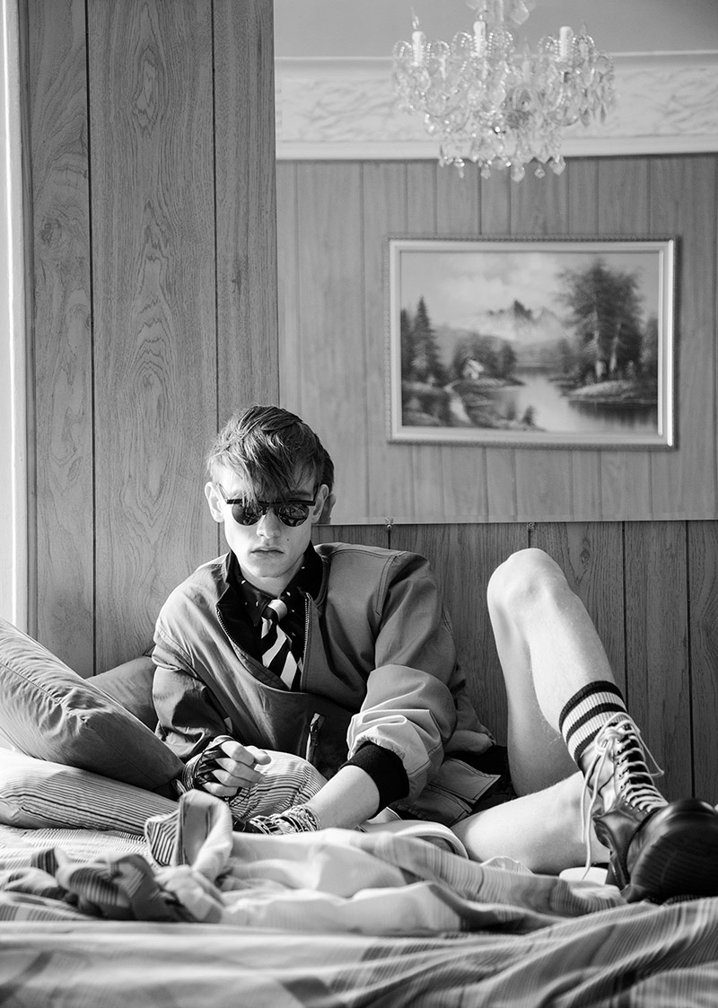 Bomber Sequel–Fernando Cabral is not the only model who does justice by this season’s bomber jacket. Starring in his own story for Optology, Andreas Lindquist sports the bomber jacket and not much else. Photographed by Thomas Giddings with styling by Andreas Kokkino, Andreas is captured in underwear, boots and stylish bomber jacket options.