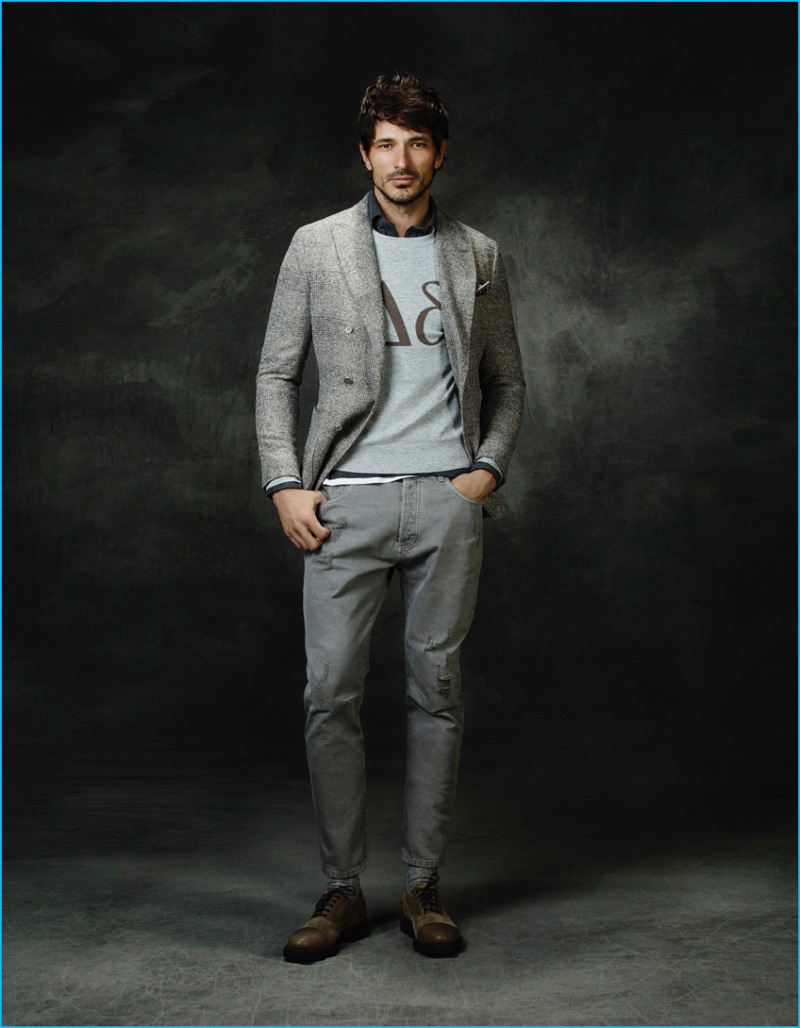 Andres Velencoso dons shades of grey, wearing a choice ensemble from Brunello Cucinelli’s fall-winter 2016 collection.